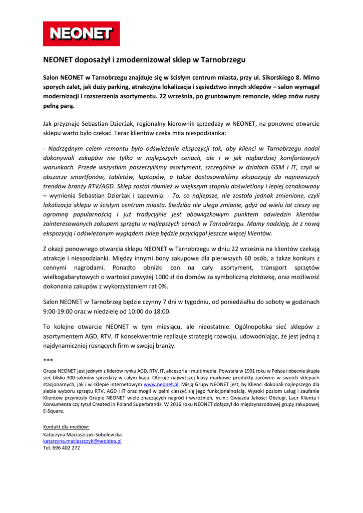 NEONET doposażył i zmodernizował sklep w Tarnobrzegu Salon NEONET w Tarnobrzegu znajduje się w ścisłym centrum miasta, przy ul. Sikorskiego 8. Mimo sporych zalet, jak duży parking, atrakcyjna lokalizacja i sąsiedztwo innych sklepów – salon wymagał modernizacji i rozszerzenia asortymentu. 22 września, po gruntownym remoncie, sklep znów ruszy pełną parą. Jak przyznaje Sebastian Dzierżak, regionalny kierownik sprzedaży w NEONET, na ponowne otwarcie sklepu warto było czekać. Teraz klientów czeka miła niespodzianka: - Nadrzędnym celem remontu było odświeżenie ekspozycji tak, aby klienci w Tarnobrzegu nadal dokonywali zakupów nie tylko w najlepszych cenach, ale i w jak najbardziej komfortowych warunkach. Przede wszystkim poszerzyliśmy asortyment, szczególnie w działach GSM i IT, czyli w obszarze smartfonów, tabletów, laptopów, a także dostosowaliśmy ekspozycję do najnowszych trendów branży RTV/AGD. Sklep został również w większym stopniu doświetlony i lepiej oznakowany – wymienia Sebastian Dzierżak i zapewnia: - To, co najlepsze, nie zostało jednak zmienione, czyli lokalizacja sklepu w ścisłym centrum miasta. Siedziba nie ulega zmianie, gdyż od wielu lat cieszy się ogromną popularnością i już tradycyjnie jest obowiązkowym punktem odwiedzin klientów zainteresowanych zakupem sprzętu w najlepszych cenach w Tarnobrzegu. Mamy nadzieję, że z nową ekspozycją i odświeżonym wyglądem sklep będzie przyciągał jeszcze więcej klientów. Z okazji ponownego otwarcia sklepu NEONET w Tarnobrzegu w dniu 22 września na klientów czekają atrakcje i niespodzianki. Między innymi bony zakupowe dla pierwszych 60 osób, a także konkurs z cennymi nagrodami. Ponadto obniżki cen na cały asortyment, transport sprzętów wielkogabarytowych o wartości powyżej 1000 zł do domów za symboliczną złotówkę, oraz możliwość dokonania zakupów z wykorzystaniem rat 0%. Salon NEONET w Tarnobrzeg będzie czynny 7 dni w tygodniu, od poniedziałku do soboty w godzinach 9:00-19:00 oraz w niedzielę od 10:00 do 18:00. To kolejne otwarcie NEONET w tym miesiącu, ale nieostatnie. Ogólnopolska sieć sklepów z asortymentem AGD, RTV, IT konsekwentnie realizuje strategię rozwoju, udowodniając, że jest jedną z najdynamiczniej rosnących firm w swojej branży. *** Grupa NEONET jest jednym z liderów rynku AGD, RTV, IT, akcesoria i multimedia. Powstała w 1991 roku w Polsce i obecnie skupia sieć blisko 300 salonów sprzedaży w całym kraju. Oferuje najwyższej klasy markowe produkty zarówno w swoich sklepach stacjonarnych, jak i w sklepie internetowym www.neonet.pl. Misją Grupy NEONET jest, by Klienci dokonali najlepszego dla siebie wyboru sprzętu RTV, AGD i IT oraz mogli w pełni cieszyć się jego funkcjonalnością. Wysoki poziom usług i zaufanie Klientów przyniosły Grupie NEONET wiele znaczących nagród i wyróżnień, m.in.: Gwiazda Jakości Obsługi, Laur Klienta i Konsumenta czy tytuł Created in Poland Superbrands. W 2016 roku NEONET dołączył do międzynarodowej grupy zakupowej E-Square. Kontakt dla mediów: Katarzyna Maciaszczyk-Sobolewska [email protected] Tel. 696 402 272