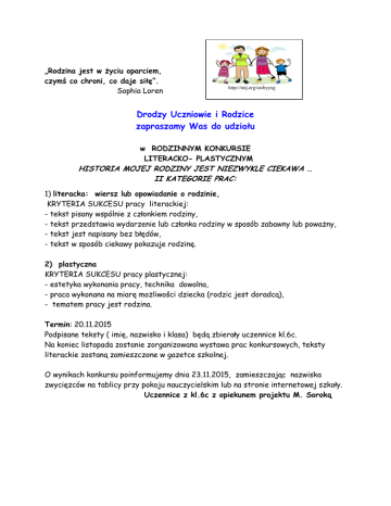 „Rodzina jest w życiu oparciem, czymś co chroni, co daje siłę”. Sophia Loren http://tnij.org/uwbyyxg Drodzy Uczniowie i Rodzice zapraszamy Was do udziału w RODZINNYM KONKURSIE LITERACKO- PLASTYCZNYM HISTORIA MOJEJ RODZINY JEST NIEZWYKLE CIEKAWA … II KATEGORIE PRAC: 1) literacka: wiersz lub opowiadanie o rodzinie, KRYTERIA SUKCESU pracy literackiej: - tekst pisany wspólnie z członkiem rodziny, - tekst przedstawia wydarzenie lub członka rodziny w sposób zabawny lub poważny, - tekst jest napisany bez błędów, - tekst w sposób ciekawy pokazuje rodzinę. 2) plastyczna KRYTERIA SUKCESU pracy plastycznej: - estetyka wykonania pracy, technika dowolna, - praca wykonana na miarę możliwości dziecka (rodzic jest doradcą), - tematem pracy jest rodzina. Termin: 20.11.2015 Podpisane teksty ( imię, nazwisko i klasa) będą zbierały uczennice kl.6c. Na koniec listopada zostanie zorganizowana wystawa prac konkursowych, teksty literackie zostaną zamieszczone w gazetce szkolnej. O wynikach konkursu poinformujemy dnia 23.11.2015, zamieszczając nazwiska zwycięzców na tablicy przy pokoju nauczycielskim lub na stronie internetowej szkoły. Uczennice z kl.6c z opiekunem projektu M. Soroką