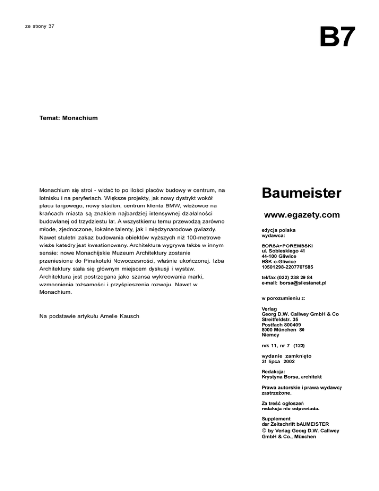 B7 ze strony 37 Temat: Monachium Monachium siê stroi - widaæ to po iloci placów budowy w centrum, na lotnisku i na peryferiach. Wiêksze projekty, jak nowy dystrykt wokó³ placu targowego, nowy stadion, centrum klienta BMW, wie¿owce na krañcach miasta s¹ znakiem najbardziej intensywnej dzia³alnoci budowlanej od trzydziestu lat. A wszystkiemu temu przewodz¹ zarówno m³ode, zjednoczone, lokalne talenty, jak i miêdzynarodowe gwiazdy. Nawet stuletni zakaz budowania obiektów wy¿szych ni¿ 100-metrowe wie¿e katedry jest kwestionowany. Architektura wygrywa tak¿e w innym sensie: nowe Monachijskie Muzeum Architektury zostanie przeniesione do Pinakoteki Nowoczesnoci, w³anie ukoñczonej. Izba Architektury sta³a siê g³ównym miejscem dyskusji i wystaw. Architektura jest postrzegana jako szansa wykreowania marki, wzmocnienia to¿samoci i przypieszenia rozwoju. Nawet w Monachium. Na podstawie artyku³u Amelie Kausch Baumeister www.egazety.com edycja polska wydawca: BORSA+POREMBSKI ul. Sobieskiego 41 44-100 Gliwice BK o-Gliwice 10501298-2207707585 tel/fax (032) 238 29 84 e-mail: [email protected] w porozumieniu z: Verlag Georg D.W. Callwey GmbH & Co Streitfeldstr. 35 Postfach 800409 8000 München 80 Niemcy rok 11, nr 7 (123) wydanie zamkniêto 31 lipca 2002 Redakcja: Krystyna Borsa, architekt Prawa autorskie i prawa wydawcy zastrze¿one. Za treæ og³oszeñ redakcja nie odpowiada. Supplement der Zeitschrift bAUMEISTER ã by Verlag Georg D.W. Callwey GmbH & Co., München streszczenie art. ze strony 38 streszczenie art. ze strony 48 Pinakoteka Nowoczesnoci Renowacja monachijskiego Re Boom w nowych muzeach Bawarii wydaje siê nie mieæ koñca: ostatnie jest dzie³o Stephana Braunfelsa, dok³adnie naprzeciw klasycznej Alte Pinakoteki Leo von Klenze'a. Nowa o parê metrów przekracza d³ugoci¹ Monachijskie Re, najwiêksza na wiecie firma ubezpieczeniowa, zdominowa³a serce dystryktu Szwabii od roku 1913. Ma ona teraz podzielone i przebudowane biura z lat 70., w s¹siedztwie bezporednio ma trzy g³ówne organizacyjne koncepcje: jego o jest zorientowana na muzeum Klenze'a, oddaj¹c mu szacunek; przek¹tna o ³¹czy go z pobliskim skrzy¿owaniem; a centralna rotunda jest bogata szkle, betonie, kamieniu i drewnie. Fasada jest powalaj¹c¹ kompozycj¹ wysokich, profilowanych, szklanych p³yt umieszczonych na wysuniêtych gzymsach. Zmieniono stary plan budynku na formê litery S, z biurami star¹, ale pod wzglêdem objêtoci jest trzykrotnie wiêksza. Jej wielka bry³a jest podzielona na sekcje przez za³amania masy budynku na ca³ej jego wysokoci i dachowe okapy wspierane na cienkich filarach. Budynek przestrzeni¹, z wystawn¹ klatk¹ schodow¹ i mnóstwem wiat³a. Z zewn¹trz kopu³a jest niewidoczna; w rodku dominuje - odwo³uj¹c siê do klasycznych przyk³adów z historii, jak Uffizi we Florencji czy Pio Clementino w Watykanie. S³u¿y jako punkt orientacyjny i wejcie, to dramatyczna scena wiat³a, cieni i wewnêtrznych wizji. Braunfels ofiarowa³ publicznoci hojn¹ i dramatyczn¹ przestrzeñ na ruch, na przygotowania i antycypacjê kolekcji. Przestrzeñ sama w sobie jest dzie³em sztuki, któr¹ doceniæ mo¿na przechodz¹c w poprzek przez rotundê. Krata nie jest widoczna, ale odczuwa siê j¹ wszêdzie; orientacja jest ³atwa dziêki rotundzie. W sekcjach muzeum nic nie odwraca uwagi od sztuki; wszystkie mury s¹ bia³e, wentylacja i ogrzewanie kompletnie nie rzucaj¹ siê w oczy, wietliki s¹ technicznie doskona³e. Pomimo swej objêtoci 240 tys. m2, nowe muzeum bêdzie mia³o wkrótce dobudówkê mieszcz¹c¹ kolekcjê grafiki. Chocia¿ dziesiêcioletni okres budowy jest znaczony licznymi kontrowersjami, prawie ka¿dy jest zadowolony z ostatecznych efektów: jakoci konstrukcji, odpowiedniej oprawy, która nie zdominowa³a sztuki oraz genialnego przek¹tnego rozwi¹zania, które ³¹czy dwa starsze muzea z miastem. Na podstawie artyku³u Wolfganga Pehnta B6 przylegaj¹cego Ogrodu Angielskiego, otoczona dekoracyjnymi historycznymi willami. Nic w projekcie Baumschlager & Eberle nie jest zbyteczne, wszystko jest proste, czyste i logiczne, i wykonane w piêknym ozdobnym tylko po jednej stronie hallu, by dostarczyæ wiat³o wszystkim korytarzom. Dawna d³uga fasada zosta³a podzielona na dwie nierówne czêci, z wejciem w strefie cofniêtej. Foyer jest niespodziank¹: d³ugie na 55 metrów, szerokie na 7, a wysokie na 6, wykoñczone na pod³ogach i cianach kanadyjskim klonem o ¿ywym wzorze. Hall s³u¿y jako g³ówne wejcie, strefa bezpieczeñstwa, kafeteria, recepcja i audytorium na koncerty, wyk³ady i wystawy. Homogeniczne powierzchnie budynku kryj¹ ca³¹ techniczn¹ infrastrukturê. Naturalna wentylacja zosta³a zoptymalizowana; elektryczne ekrany s³oneczne dostarczaj¹ cienia; izolowane szk³o utrzymuj¹ nisk¹ temperaturê w budynku, którego 80% fasady jest ze szk³a. Mniej wiêcej 50% pierwotnej masy i ca³a struktura nona pochodz¹ z utylizacji. Kompaktowy nowy budynek zachowa³ prawie mieszkalne wymiary i teraz w niezwyk³y sposób wzbogaca star¹ dzielnicê nowoczesn¹ architektur¹. Na podstawie artyku³u Sabine Schneider streszczenie art. ze strony 58 streszczenie art.ze strony 66 streszczenie art.ze strony 72 Budynek Biurowy ] Nowe Monachium Izba Architektury Ten nowy budynek biurowy, umieszczony w wa¿nym miejscu pomiêdzy City Gdziekolwiek siê spojrzy w Monachium, wszêdzie buduje siê co spektakularnego - od dziedziñców i pasa¿y w¿ynaj¹cych siê w miejskie bloki i wype³nionych Co mo¿e byæ gorsze dla architekta ni¿ mieæ klienta architekta? W wypadku tego star¹ francusk¹ dzielnic¹, dobrze siê wpasowa³ w heterogeniczne wymagania. Cofniête górne piêtro operowych i scen próbnych oraz szeciennej szklanej struktury handlowej. Inne rzucaj¹ce siê w oczy budynki s¹ wznoszone wzd³u¿ Altstadtring, niedaleko stanowej kancelarii. Niestety jednak ulica nie bêdzie zadrzewionym, willi z 1924 roku by³a zbyt ma³a i potrzebowano nowego budynku na us³ugi, publ