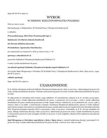 Sygn.akt III AUa 1490/14 WYROK W IMIENIU RZECZYPOSPOLITEJ POLSKIEJ Dnia 31 marca 2015r. Sąd Apelacyjny w Białymstoku, III Wydział Pracy i Ubezpieczeń Społecznych w składzie: Przewodniczący: SSA Piotr Prusinowski (spr.) Sędziowie: SA Maria Jolanta Kazberuk SA Dorota Elżbieta Zarzecka Protokolant: Agnieszka Charkiewicz po rozpoznaniu na rozprawie w dniu 31 marca 2015 r. w B. sprawy z odwołania B. K. przeciwko Zakładowi Ubezpieczeń Społecznych Oddział w P. o rentę z tytułu niezdolności do pracy na skutek apelacji Zakładu Ubezpieczeń Społecznych Oddział w P. od wyroku Sądu Okręgowego w Ostrołęce III Wydziału Pracy i Ubezpieczeń Społecznych z dnia 1 lipca 2014 r. sygn. akt III U 529/11 oddala apelację. Sygn. akt III AUa 1490/14 UZASADNIENIE B. K. złożyła odwołanie od decyzji Zakładu Ubezpieczeń Społecznych z dnia 31.05.2011r., odmawiającej jej prawa do renty z tytułu niezdolności do pracy. Wniosła o przyznanie jej prawa do renty z tytułu całkowitej niezdolności do pracy na stałe. W odpowiedzi na odwołanie ZUS wniósł o jego oddalenie. W uzasadnieniu wskazał, że B. K. od dnia 24.09.1997r. pobierała rentę z tytułu całkowitej niezdolności do pracy, a począwszy od 01.10.1999 r. renta z tytułu całkowitej niezdolności do pracy została jej przyznana na stałe. Organ rentowy wskazał też, że na podstawie art. 14 ust. 5 pkt 3 ustawy z dnia 17.12.1998r. o emeryturach i rentach z Funduszu Ubezpieczeń Społecznych, sprawa w trybie nadzoru nad wykonywaniem orzecznictwa o niezdolności do pracy została skierowana do rozpatrzenia przez Komisję Lekarską ZUS. Ponieważ Komisja Lekarska ZUS w orzeczeniu z dnia 17.05.2011r. stwierdziła, że B. K. nie jest niezdolna do pracy, dlatego zaskarżoną decyzją z dnia 31.05.2011r. odmówiono jej prawa do renty z tytułu niezdolności do pracy a wstrzymanie prawa do renty nastąpiło od dnia 01.06.2011r. Z tych względów zdaniem ZUS zaskarżona decyzja jest prawidłowa. Sąd Okręgowy w Ostrołęce wyrokiem z dnia 1 lipca 2014 r. zmienił zaskarżoną decyzję i przyznaje B. K. prawo do renty z tytułu całkowitej niezdolności do pracy od dnia 1 czerwca 2011 roku na stałe. Sąd pierwszej instancji dokonał następujących ustaleń faktycznych. Wskazał, że ubezpieczona pobierała rentę okresową z tytułu całkowitej niezdolności do pracy w okresie od dnia 24 września 1997 r. do dnia 24 września 1997 r. do dnia 31 października 1999 r. Następnie decyzją z dnia 27.09.1999 r. przyznano odwołującej prawo do renty z tytułu całkowitej niezdolności do pracy od 01.10.1999 r. na stałe. W dniu 29.04.2011 r., na podstawie art. 14 ust. 5 pkt 3 ustawy z dnia 17.12.1998 r. o emeryturach i rentach z Funduszu Ubezpieczeń Społecznych, sprawa odwołującej w trybie nadzoru nad wykonywaniem orzecznictwa o niezdolności do pracy, została skierowana do rozpatrzenia przez Komisję Lekarską ZUS. Ponieważ Komisja Lekarska ZUS w orzeczeniu z dnia 17.05.2011 r. stwierdziła, że B. K. nie jest niezdolna do pracy, dlatego zaskarżoną decyzją z dnia 31.05.2011r. odmówiono jej prawa do renty z tytułu niezdolności do pracy a wstrzymanie prawa do renty nastąpiło od dnia 01.06.2011 r. Uwzględniając tą zaszłość, Sąd pierwszej instancji wskazał na przepisy określające przedmiot sporu w niniejszej sprawie. Odwołał się do art. 57 ust. 1 oraz art. 12 ust 1 -3 i art. 107 ustawy o emeryturach i rentach z FUS. W rezultacie stwierdził, że skuteczność odwołania B. K. była uzależniona od ustalenia, czy począwszy od dnia 1.06.2011 r. odzyskała ona zdolność do pracy, czy też w dalszym ciągu jest niezdolna do pracy, a jeśli tak, to w jakim stopniu i jaki jest przewidywany okres trwania niezdolności. Zauważył przy tym, że odwołującej w 1999 r. przyznano rentę z tytułu całkowitej niezdolności do pracy na stałe a nastąpiło to w oparciu o orzeczenie Lekarza Orzecznika ZUS z dnia 23.09.1999r. Powyższe oznacza, iż oceniono wówczas, iż jej stan zdrowia już się nie poprawi i nie odzyska ona już zdolności do pracy zgodnej z kwalifikacjami oraz że niemożliwe jest jej przekwalifikowanie się. Skoro więc w 2011r. wstrzymano jej prawo do renty oznacza to, że ZUS zmienił ocenę stanu zdrowia odwołującej i ocenę jej zdolności do pracy. Określając niezdolność do pracy ubezpieczonej Sąd Okręgowy w Ostrołęce podkreślił, że B. K. ma wykształcenie podstawowe i pracowała jedynie w Spółdzielni (...) Zakładzie Pracy (...) w O. jako krawiec-chałupnik. Z dokumentacji lekarskiej, znajdującej się w aktach rentowych odwołującej jednoznacznie wynika zaś, że stwierdzana u niej od 24.09.1997r. do 31.05.2011r. całkowita niezdolność do pracy była spowodowana schorzeniem okulistycznym – ślepotą oka lewego oznaczającą praktyczną jednooczność i astygmatyzmem krótkowzrocznym oka prawego. Na okoliczność istnienia niezdolności do pracy B. K. Sąd dopuścił w sprawie dowód z opinii biegłych lekarzy z zakresu okulistyki oraz okulistyki i medycyny pracy a także dowód z opinii (...) w B.. W opinii z dnia 17.08.2011r. (k. 10) biegła z zakresu okulistyki M. S. rozpoznała u odwołującej ślepotę praktyczną oka lewego, krótkowzroczność średniego stopnia z astygmatyzmem oka prawego, krótkowzroczność wysoką zwyrodnieniową oka lewego i praktyczną jednooczność. Biegła wskazała, iż B. K. jest zdolna do pracy, ale z wyłączeniem pracy na wysokości, przy maszynach w ruchu i wymagających widzenia obuocznego. Wskazała też, że jej stan zdrowia w stosunku do stanu sprzed czerwca 2011r. nie uległ pogorszeniu. Po wniesieniu zastrzeżeń przez odwołującą Sąd dopuścił dowód z opinii innego biegłego z zakresu okulistyki. W opinii z dnia 12.10.2011r. biegła z zakresu E. N. rozpoznała u odwołującej krótkowzroczność astygmatyczną oka prawego stopnia średniego, krótkowzroczność astygmatyczną oka lewego stopnia wysokiego, zwyrodnieniową, ś