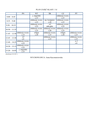 PLAN ZAJĘĆ KLASY: 3 d WT ŚR j. angielski s.23 edukacja wczes. zaj. komputer. s.23 s.26 edukacja wczes. wf s.23 sala gim. edukacja wczes. edukacja wczes. s.23 s.20 edukacja wczes. religia edukacja wczes. s.23 s.20 s.23 wf edukacja wczes. s.6 s.23 edukacja wczes. s.23 edukacja wczes. s.23 j. angielski s.23 PN 8:00 – 8:45 8:55 – 9:40 9:50 – 10:35 10:50 – 11:35 11:45 – 12:30 12:45 – 13:30 13:40 – 14:25 14:30 – 15:15 15:20 – 16:05 CZ PT edukacja wczes. s.23 edukacja wczes. s.23 edukacja wczes. s.23 edukacja wczes. s.23 religia edukacja wczes. s.20 s.23 edukacja wczes. s.23 w-f s.6 aktualizacja 2.01.2017 r. WYCHOWAWCA: Anna Kaczmarzewska