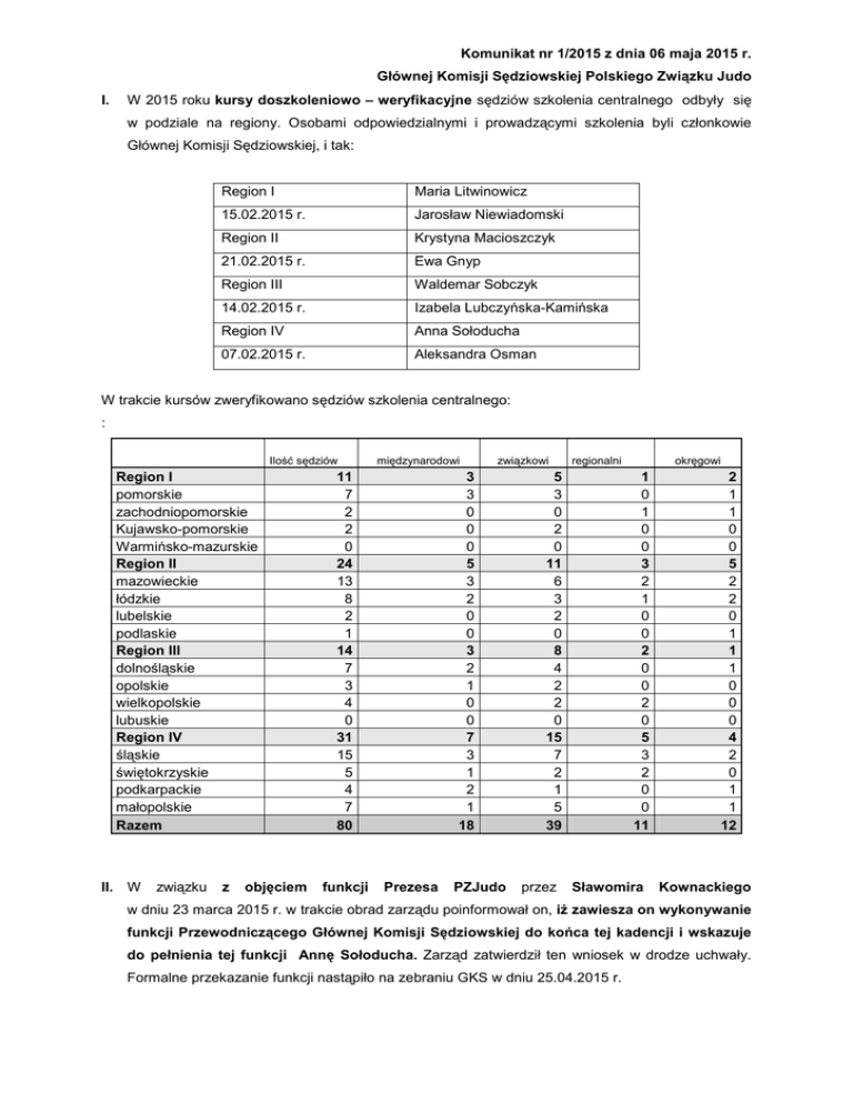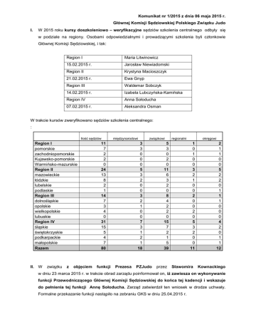 Komunikat nr 1/2015 z dnia 06 maja 2015 r. Głównej Komisji Sędziowskiej Polskiego Związku Judo I. W 2015 roku kursy doszkoleniowo – weryfikacyjne sędziów szkolenia centralnego odbyły się w podziale na regiony. Osobami odpowiedzialnymi i prowadzącymi szkolenia byli członkowie Głównej Komisji Sędziowskiej, i tak: Region I Maria Litwinowicz 15.02.2015 r. Jarosław Niewiadomski Region II Krystyna Macioszczyk 21.02.2015 r. Ewa Gnyp Region III Waldemar Sobczyk 14.02.2015 r. Izabela Lubczyńska-Kamińska Region IV Anna Sołoducha 07.02.2015 r. Aleksandra Osman W trakcie kursów zweryfikowano sędziów szkolenia centralnego: : Ilość sędziów Region I pomorskie zachodniopomorskie Kujawsko-pomorskie Warmińsko-mazurskie Region II mazowieckie łódzkie lubelskie podlaskie Region III dolnośląskie opolskie wielkopolskie lubuskie Region IV śląskie świętokrzyskie podkarpackie małopolskie Razem II. W związku z objęciem międzynarodowi 11 7 2 2 0 24 13 8 2 1 14 7 3 4 0 31 15 5 4 7 80 funkcji związkowi 3 3 0 0 0 5 3 2 0 0 3 2 1 0 0 7 3 1 2 1 18 Prezesa PZJudo regionalni 5 3 0 2 0 11 6 3 2 0 8 4 2 2 0 15 7 2 1 5 39 przez okręgowi 1 0 1 0 0 3 2 1 0 0 2 0 0 2 0 5 3 2 0 0 11 Sławomira 2 1 1 0 0 5 2 2 0 1 1 1 0 0 0 4 2 0 1 1 12 Kownackiego w dniu 23 marca 2015 r. w trakcie obrad zarządu poinformował on, iż zawiesza on wykonywanie funkcji Przewodniczącego Głównej Komisji Sędziowskiej do końca tej kadencji i wskazuje do pełnienia tej funkcji Annę Sołoducha. Zarząd zatwierdził ten wniosek w drodze uchwały. Formalne przekazanie funkcji nastąpiło na zebraniu GKS w dniu 25.04.2015 r. Komunikat nr 1/2015 z dnia 06 maja 2015 r. Głównej Komisji Sędziowskiej Polskiego Związku Judo III. W dniu 25 kwietnia 2015 r. odbyło się w Kielcach zebranie Głównej Komisji Sędziowskiej, w trakcie której min. podsumowano kursy sędziowskie, klasyfikację sędziowską za 2014 r. (w załączeniu) , wymiany międzynarodowe (w załączeniu) . Główna Komisja Sędziowska podjęła także uchwałę o zawieszeniu w prawach sędziego Pani Krystyny Macioszczyk w terminie do 31 grudnia 2016 roku. W związku z tym faktem, Pani Ewa Gnyp została upoważniona do przeprowadzenia wyborów w Regionie II celem wyboru członka GKS. Wybory mają się odbyć najpóźniej do 31 maja 2015 r. Także w związku z zawieszeniem swojej działalności sędziowskiej przez Panią Alicję Daniel w skład GKS na podstawie odbytych wyborów w Regionie I został przyjęty Pan Jarosław Niewiadomski. Bardzo dziękujemy Pani Alicji Daniel za jej wkład w pracę i działalność w Głównej Komisji Sędziowskiej PZJudo. IV. Aktualny skład Głównej Komisji Sędziowskiej: 1. Anna Sołoducha - Przewodnicząca 2. Maria Litwinowicz – członek, Region I 3. Jarosław Niewiadomski – członek, Region I 4. Ewa Gnyp - członek, Region II 5. wakat – Region II 6. Lubczyńska – Kamińska Izabela – członek, Region III 7. Dorota Śniatowska – członek, Region III 8. Czesław Garncarz – członek, Region IV 9. Aleksandra Osman – członek, Region IV 10. Zbigniew Motrycz – Przedstawiciel Podkomisji Edukacji 11. Waldemar Sobczyk – Przedstawiciel Klasyfikatorów 12. Sławomir Kownacki – członek Podajemy także aktualny skład Podkomisji Edukacji, składającej się z sędziów klasy światowej (A): 1. Sławomir Kownacki - Wrocław 2. Zbigniew Motrycz - Rzeszów 3. Hasseeb Qaddourah – Bytom 4. Waldemar Sobczyk – Strzelce Opolskie 5. Czesław Garncarz – Gliwice 6. Anna Sołoducha - Gliwice GKS przypomina, że: a. Obowiązuje limit wieku 65 lat dla sędziowania zawodów centralnych. b. Klasyfikatorami mogą być wyłącznie sędziowie spełniający warunki określone w Regulaminie wyboru klasyfikatorów, zatwierdzonym przez Zarząd PZJudo. c. Wszystkich sędziów sportowych w judo obwiązuje Regulamin Sędziowski i są oni zobowiązani zapoznania się z Regulaminem i jego przestrzegania. Komunikat nr 1/2015 z dnia 06 maja 2015 r. Głównej Komisji Sędziowskiej Polskiego Związku Judo V. Klasyfikatorami na zawodach centralnych w 2015 r. są: 1 Sobczyk Waldemar Strzelce Opolskie 2 Motrycz Zbigniew Rzeszów 3 Sołoducha Anna Gliwice 4 Qaddourah Hasseeb Bytom 5 Kacprzycki Stanisław Płock 6 Garncarz Czesław Gliwice 7 Smoleń-Włodarczyk Monika Kraków 8 Jarowicz Kazimierz Gdańsk 9 Litwinowicz Maria Gdańsk 10 Gnyp Ewa Łódź 11 Niewiadomski Jarosław Gdańsk 12 Aleksandra Osman Kielce 13 Styra Henryk Łódź 14 Filipczak Dariusz Łódź 15 Srebro Marek Tuchów 16 Bobala Tomasz Sanok VI. Podtrzymuje się zasadę w roku 2015, że obsady na zawody centralne przez Przewodniczącego GKS (lub osobę upoważnioną) będą ustalane z sędziów szkolenia centralnego, natomiast obsady na zawody regionalne będące eliminacjami do zawodów centralnych będą ustalane przez członków GKS odpowiedzialnych za regiony z sędziów wchodzących w skład danego regionu (w tym również ze szkolenia centralnego). Członkowie GKS odpowiedzialni za regiony odpowiadają za powoływanie na zawody regionalne sędziów szkolenia centralnego w ilościach zapewniających minimum neutralności oraz spełniających warunki w zakresie regulaminu sędziowskiego. Sędziowie Główni zawodów na szczeblu krajowym zobowiązani są do przekazania po każdych zawodach: - ocen zbiorczych klasyfikacji Przewodniczącemu Głównej Komisji Sędziowskiej, - arkuszy obserwacji wraz z kopią ocen zbiorczych Przewodniczącemu Klasyfikatorów. VII. Główna Komisja Sędziowska informuje, iż do egzaminu na sędziego kontynentalnego, który odbędzie się w terminie 26-27.09.2015 r. w Belgradzie (Serbia) przystąpi Antonina Herian. Komunikat nr 1/2015 z dnia 06 maja 2015 r. Głównej Komisji Sędziowskiej Polskiego Związku Judo VIII. Informujemy także, iż w roku 2015 na kolejnym planowanym zebraniu GKS (lipiec 2015) zostanie wyłoniona aktualna grupa osób przygotowujących się do egzaminu na sędziego kontynentalnego. W związku z tym prosimy o zł