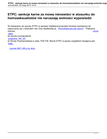 ETPC: sankcje karne za mowę nienawiści w stosunku do homoseksualistów nie naruszają wolności wypo poniedziałek, 20 lutego 2012 16:34 ETPC: sankcje karne za mowę nienawiści w stosunku do homoseksualistów nie naruszają wolności wypowiedzi W nawiązaniu do wyroku ETPC w sprawie Vejdeland przeciwko Szwecji zachęcamy do zapoznania się z artykułem red. Ewy Siedleckiej pt. "Homofobia jest jak rasizm" . Polecamy również kome ntarz do wyroku koordynatorki programu "Art. 32" dr Doroty Pudzianowskiej w radiu TOK FM. Wyrok ETPC w języku angielskim dostępny jest tutaj. Joomla SEF URLs by Artio 1/1