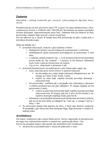 Sztuczna Inteligencja w Programowaniu Gier 1 Zadanie Zaprojektuj i wykonaj środowisko gier turowych, wykorzystujących algorytmy heurystyczne. Projektowana gra ma być grą turową typu CTF (capture the flag) zlokalizowaną w dwuwymiarowym świecie, o wielkości min. 100x100 pól. Rywalizacja ma miejsce pomiędzy dwiema drużynami, reprezentowanymi przez boty. Zadaniem bota jest dotarcie do bazy przeciwnika, zabranie flagi i powrót z nią do swojej bazy. Gra ma odbywać się w turach. W każdej turze boty przesuwają się tylko o jedno pole w dowolnym kierunku mapy. Mapa ma składać się z: przeszkód statycznych, znanych z góry każdemu z botów: o blokujących (ściany), nie pozwalających na postawienie w nich bota; o nieblokujących (pusta przestrzeń) pozwalających na postawienie w nich bota; o o zadanym stopniu trudności (np. 1..5) do przejścia których bot potrzebuje pewną liczbę tur. Np. trudność = 3 oznacza, że bot drużyny niebieskich może wyjść z pola po trzeciej turze od wejścia. o Fog of war; widoczność w promieniu 5 pól przeszkód dynamicznych, nie podawanych z góry botom (jako mapy), np.: o mina, ustawiana przez serwer losowo w pustych miejscach bot dowiaduje się o minie dzięki informacji odległościowej, np.: W zasięgu są 3 miny (5 pól, 4 pola, 2 pola). wejście na minę bądź wspólna krawędź powoduje detonację i zniszczenie bota o bot przeciwnika – podobnie jak w przypadku min, informacja o obecności w pobliżu przekazywana jest jako odległości: W zasięgu znajduje się bot przeciwnika (3 pola). wejście na pole bota przeciwnika bądź wspólna krawędź powoduje zniszczenie bota. W sytuacji, gdy bot A stoi a bot B wchodzi w sąsiedztwo (krawędź wspólną) wtedy ginie bot B. o Informacja o przeszkodach dynamicznych dostarczana jest botowi jedynie, gdy ten się do nich zbliży na odległość np. 5 pól, np.: w zasięgu 5 pól są 3 miny i 1 bot. Po zniszczeniu danego bota pojawia się nowy, w bazie jego drużyny (respawn). W przypadku, gdy zniszczono bota niosącego flagę, flaga pozostaje w miejscu finalnego ataku. Architektura: Grę należy zrealizować jako system klient-serwer. Serwer odpowiada za przechowywanie mapy oraz wykonywanie ruchów w ramach tury, podczas gdy klient = bot. Serwer ma zarządzać mapą w taki sposób, aby niemożliwe było oszukiwanie: nie pozwala na przeskakiwanie o więcej niż jedno pole w turze, Sztuczna Inteligencja w Programowaniu Gier 2 nie przesyła informacji o wszystkich przeszkodach dynamicznych, a tylko tych w zasięgu (np. 10 pól), wyświetla liczbę tur i zniszczonych botów wykonuje wizualizację (możliwe rozróżnienie wizualne poszczególnych elementów mapy), monitoruje pozycję flag obu drużyn, określa kiedy wybucha mina oraz kiedy giną boty pozwala na określenie szybkości animacji gry oraz grę krok po kroku. Implementacja: Zalecany protokół tekstowy, oparty o TCP/IP. Język programowania serwera oraz klientów: dowolny, mogą być różne. Zasady oceniania: • • • Na ostatnich zajęciach przeprowadzony zostanie turniej, gdzie rywalizują wszystkie drużyny na zasadzie każdy z każdym. Rywalizacja to pięć kolejnych gier danej pary botów. Rywalizację wygrywa ta druzyna, która straciła najmniej botów we wszystkich pięciu grach. Zwycięska drużyna otrzymuje 5,0; II miejsce: 4,5; III i dalej: 4,0. Oddanie niedziałającego bota, w sensie poprawności komunikacji z serwerem, powoduje niezaliczenie przedmiotu. Prowadzący wymaga zdawania cotygodniowych raportów z postępów w pracach wszystkich zespołów.