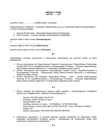 UMOWA O DZIEŁ NR PR – …../07 zawarta w dniu …………….w Białymstoku, pomiędzy: Województwem Podlaskim, z siedzibą w Białymstoku przy ul. Kardynała Stefana Wyszyńskiego 1, w imieniu którego działają: 1. Dariusz Piontkowski – Marszałek Województwa Podlaskiego, 2. Karol Tylenda – Członek Zarządu Województwa Podlaskiego zwanym dalej w treści umowy Zamawiającym a ……………………………………………………… zwanym dalej w treści umowy Wykonawcą łącznie zwane dalej w treści umowy Stronami. §1 Zamawiający zamawia wykonanie, a wykonawca zobowiązuje się wykonać dzieło na które składają się: 1. Strona internetowa dla Regionalnego Programu Operacyjnego Województwa Podlaskiego na lata 2007-2013, współfinansowana z Europejskiego Funduszu Rozwoju Regionalnego, której zakres zawiera załącznik nr 1 stanowiący integralną część umowy. 2. Strona internetowa dla Programu Operacyjnego Kapitał Ludzki, współfinansowana z Europejskiego Funduszu Społecznego, której zakres zawiera załącznik nr 2 stanowiący integralną część umowy. 3. Strona internetowa dla Programu Sąsiedztwa Polska - Litwa – Obwód Kaliningradzki (Interreg III A), współfinansowana z Europejskiego Funduszu Rozwoju Regionalnego, której zakres zawiera załącznik nr 3 stanowiący integralną część umowy. §2 1. Strony ustalają, że Wykonawca wykona dzieło zgodnie z obowiązującymi przepisami prawa, przy uwzględnieniu zasobów Zamawiającego, tj.: Serwer: HP PROLIANT ML370 G2 Procesor: INTEL XEON 2.4 GHz Pamięć RAM: 2 GB Interfejsy sieciowe: 2 sztuki – 10/100/Mb/s I 10/100/1000 Mb/s Dyski twarde: 5 sztuk (36,4 GB, ULTRA 320 SCSI, 10 tys. Obrotów) w RAID 5 Napęd: CD System operacyjny: WIN 2000 ADVANCED SERVER 2. Wykonawca oświadcza, iż posiada fachową wiedzę niezbędną do wykonania dzieła będącego przedmiotem niniejszej umowy i zobowiązuje się zrealizować dzieło przy zachowaniu najwyższych standardów. §3 1. Zamawiający oświadcza, że koordynatorem umowy z jego strony, odpowiedzialnym za współdziałanie z Wykonawcą jest Pani Izabela Łokić. 2. Strony w celu najlepszej realizacji umowy zobowiązują się do współdziałania, wzajemnej wymiany informacji oraz każdej innej formy współpracy niezbędnej do prawidłowego i zgodnego z umową wykonania dzieła. 3. W ramach niniejszej umowy wykonawca zapewni przeszkolenie pracowników w zakresie możliwości korzystania ze stron internetowych. §4 1. Termin rozpoczęcia dzieła strony ustalają na dzień 3 lipiec 2007r. 2. Termin ukończenia dzieła strony ustalają na dzień 4 października 2007r. §5 Wykonawcy za wykonanie dzieła przysługuje wynagrodzenie w wysokości 50 000 zł brutto (słownie: pięćdziesiąt tysięcy złotych), z czego koszt poszczególnych stron internetowych przedstawia się następująco: 1. Strona internetowa dla Regionalnego Programu Operacyjnego Województwa Podlaskiego na lata 2007-2013; 21 000 złotych (słownie: dwadzieścia jeden tysięcy złotych), 2. Strona internetowa dla Programu Operacyjnego Kapitał Ludzki, 21 000 złotych (słownie: dwadzieścia jeden tysięcy złotych), 3. Strona internetowa Programu Sąsiedztwa Polska - Litwa – Obwód Kaliningradzki (Interreg III A), 8 000 złotych (słownie: osiem tysięcy złotych), §6 1.Odbiór działa nastąpi w siedzibie wykonawcy w oparciu o protokół zdawczo – odbiorczy spisany w obecności stron. 2. Wykonawca zobowiązuje się do zdania a zamawiający do odbioru stron internetowych w następujących terminach: 1) Strona internetowa dla Regionalnego Programu Operacyjnego Województwa Podlaskiego na lata 2007-2013 i strona internetowa dla Programu Operacyjnego Kapitał Ludzki – odbiór 3 września 2007r. 2) Strona internetowa Programu Sąsiedztwa Polska - Litwa – Obwód Kaliningradzki (Interreg III A) – odbiór 4 października 2007r. 3.Wypłata wynagrodzenia w wysokości ustalonej w § 5 umowy nastąpi po odbiorze stron internetowych, w terminie 7 dni od przedłożenia rachunku przez Wykonawcę. 4. Wypłata wynagrodzenia nastąpi na rachunek bankowy wykonawcy, nr rachunku 34 1940 1076 5033 2047 0000 0000. §7 1. Przedmiot niniejszej umowy jest chroniony prawem autorskim. 2. Wykonawca przenosi na zamawiającego majątkowe prawa autorskie na wszystkich polach eksploatacji. 3. Wykonawca udziela Zamawiającemu licencji na korzystanie z oprogramowania autorskiego, tj. „eCMS". §8 1. W razie opóźnienia za wykonanie dzieła określonego w § 1 Zamawiającemu przysługuje kara umowna w wysokości 0,1 % wartości dzieła za każdy dzień opóźnienia. 2. W razie odstąpienia przez Wykonawcę od wykonania dzieła Zamawiającemu przysługuje kara umowna w wysokości 10 % wartości niewykonanego dzieła. 3. Zamawiający może dochodzić na zasadach ogólnych odszkodowania przewyższającego wysokość kary umownej w ust.2. §9 W przypadku stwierdzenia wadliwości stron internetowych, bądź konieczności ich poprawy Wykonawca zobowiązuje się do nieodpłatnego usunięcia wad, bądź poprawy stron w terminie 10 dni od daty ich zgłoszenia, przez okres 12 miesięcy od dnia odbioru ostatniej strony. § 10 1. Wszelkie zmiany niniejszej umowy wymagają formy pisemnej pod rygorem nieważności. 2. W sprawach nie uregulowanych niniejszą umową zastosowanie mają odpowiednie przepisy Kodeksu Cywilnego, ustawy o prawie autorskim i prawach pokrewnych oraz inne powszechnie obowiązujące przepisy. § 11 1. W razie nieporozumień lub sporów wynikających z realizacji niniejszej umowy Strony zobowiązują się w pierwszej kolejności rozwiązywać je polubownie, jednak bez udziału sądu polubownego. 2. W przypadku niemożliwości rozwiązania sporu w sposób przewidziany w powyższym ustępie, Strony poddają rozstrzyganie sporów sądowi powszechnemu właściwemu miejscowo dla siedziby Zamawiającego. § 12 Umowę sporządzono w dwóch jednobrzmiących egzemplarzach, po jednym dla każdej ze Stron. ZAM