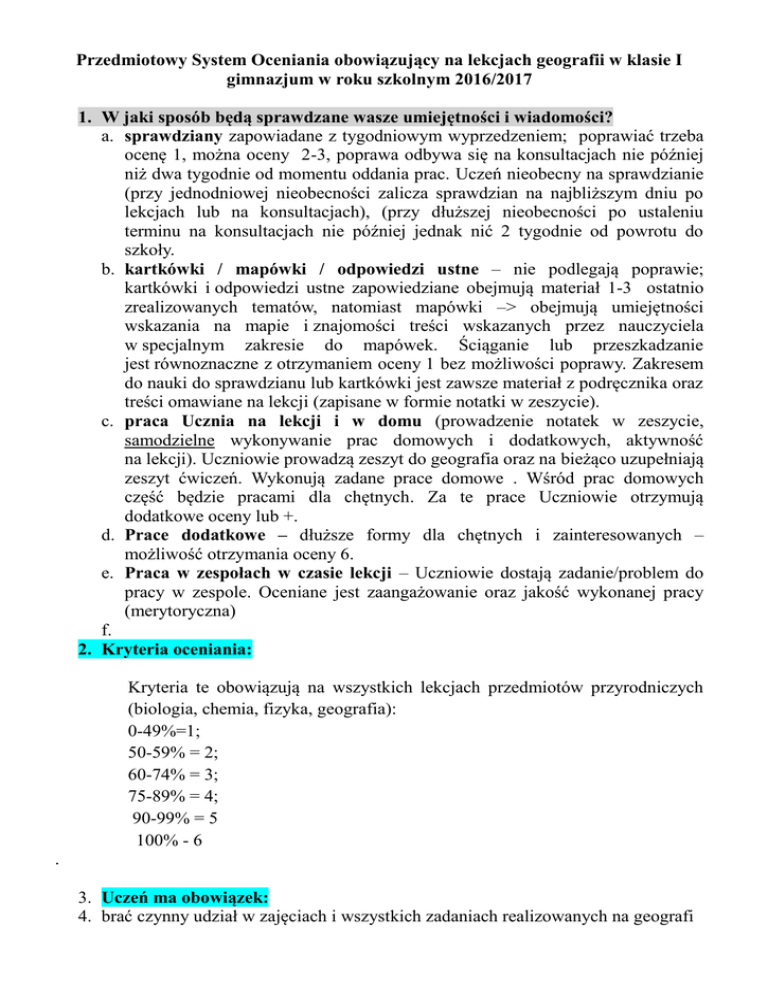 Przedmiotowy System Oceniania obowiązujący na lekcjach geografii w klasie I gimnazjum w roku szkolnym 2016/2017 1. W jaki sposób będą sprawdzane wasze umiejętności i wiadomości? a. sprawdziany zapowiadane z tygodniowym wyprzedzeniem; poprawiać trzeba ocenę 1, można oceny 2-3, poprawa odbywa się na konsultacjach nie później niż dwa tygodnie od momentu oddania prac. Uczeń nieobecny na sprawdzianie (przy jednodniowej nieobecności zalicza sprawdzian na najbliższym dniu po lekcjach lub na konsultacjach), (przy dłuższej nieobecności po ustaleniu terminu na konsultacjach nie później jednak nić 2 tygodnie od powrotu do szkoły. b. kartkówki / mapówki / odpowiedzi ustne – nie podlegają poprawie; kartkówki i odpowiedzi ustne zapowiedziane obejmują materiał 1-3 ostatnio zrealizowanych tematów, natomiast mapówki –> obejmują umiejętności wskazania na mapie i znajomości treści wskazanych przez nauczyciela w specjalnym zakresie do mapówek. Ściąganie lub przeszkadzanie jest równoznaczne z otrzymaniem oceny 1 bez możliwości poprawy. Zakresem do nauki do sprawdzianu lub kartkówki jest zawsze materiał z podręcznika oraz treści omawiane na lekcji (zapisane w formie notatki w zeszycie). c. praca Ucznia na lekcji i w domu (prowadzenie notatek w zeszycie, samodzielne wykonywanie prac domowych i dodatkowych, aktywność na lekcji). Uczniowie prowadzą zeszyt do geografia oraz na bieżąco uzupełniają zeszyt ćwiczeń. Wykonują zadane prace domowe . Wśród prac domowych część będzie pracami dla chętnych. Za te prace Uczniowie otrzymują dodatkowe oceny lub +. d. Prace dodatkowe – dłuższe formy dla chętnych i zainteresowanych – możliwość otrzymania oceny 6. e. Praca w zespołach w czasie lekcji – Uczniowie dostają zadanie/problem do pracy w zespole. Oceniane jest zaangażowanie oraz jakość wykonanej pracy (merytoryczna) f. 2. Kryteria oceniania: Kryteria te obowiązują na wszystkich lekcjach przedmiotów przyrodniczych (biologia, chemia, fizyka, geografia): 0-49%=1; 50-59% = 2; 60-74% = 3; 75-89% = 4; 90-99% = 5 100% - 6 . 3. Uczeń ma obowiązek: 4. brać czynny udział w zajęciach i wszystkich zadaniach realizowanych na geografi a. posiadać zeszyt i podręcznik do przedmiotu na każdej lekcji, prowadzićuporządkowane notatki z lekcji; w razie braku zeszytu – notatki prowadzone są na kartkach i dołączone później do zeszytu; b. dbać o porządek na ławce, schować telefon do plecaka; c. szanować sprzęt szkolny (np. mapy, globusy itp.). 5. Uczeń ma prawo zgłosić 2 nieprzygotowania w ciągu semestru (na początku lekcji podczas sprawdzania listy obecności) np. nie zgłaszamy przed kartkówkami zapowiedzianymi: W przypadku zgłoszenia nieprzygotowania na lekcji, na której odbyła się kartkówka / odpowiedź ustna i inne – Nauczyciel ustala z Uczniem sposób i termin zaliczenia 6. Przy wystawianiu oceny śródrocznej i rocznej jest brana pod uwagę średnia ważona, uczeń, który otrzymał informację o ocenie proponowanej może ubiegać się o ocenę wyższą niż przewidywana w ciągu 7 dni od poinformowania go o ocenie, pod warunkiem, że: = nie przekroczył przysługującej mu liczby nieprzygotowań, = zaliczył wszystkie prace klasowe w pierwszym terminie, = ma uzupełniony zeszyt przedmiotowy i zeszyt ćwiczeń,= jego średnia ocen wynosi co najmniej 2,4 -2,59 przy ubieganiu się o ocenę dst (analogicznie w przypadku pozostałych ocen z wyłączeniem celującej) ustala wtedy z uczniem zasady i sposób zaliczeń oraz prac do wykonania; 7. Uczeń zagrożony oceną niedostateczną na semestr lub koniec roku powinien się zgłosić do nauczyciela w ciągu 7 dni od momentu powiadomienia go o ocenie. Nauczyciel ustala wtedy z uczniem zasady i sposób zaliczeń oraz prac do wykonania. 8. Aby uzyskać ocenę celującą należy mieć średnią co najmniej 4,9. Uczeń ubiegający się o ocenę celującą powinien mieć zaliczone wszystkie wymagania na oceny niższe (zeszyt, ćwiczenia, np., zaliczenia sprawdzianów w pierwszym terminie. ), nie przekroczyć liczby np. w semestrze, być aktywny podczas zajęć oraz przygotować w ciągu semestru jedną dużą i co najmniej dwie mniejsze prace dodatkowe- tematykę prac uczeń ustala i omawia z nauczycielem na konsultacjach.