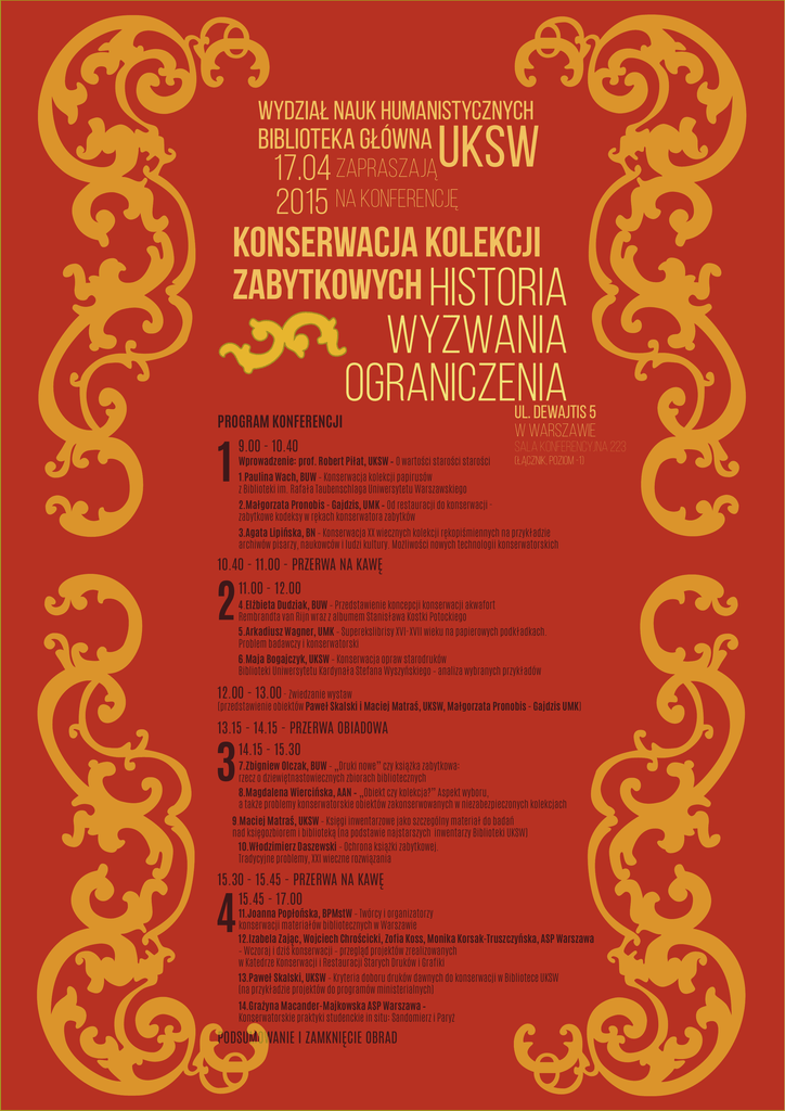 Wydział Nauk Humanistycznych UKSW 17.04 zapraszają Biblioteka Główna 2015 na konferencję Konserwacja kolekcji zabytkowych HISTORIA WYZWANIA OGRANICZENIA PROGRAM KONFERENCJI 1 9.00 - 10.40 Wprowadzenie: prof. Robert Piłat, UKSW – O wartości starości starości ul. Dewajtis 5 w warszawie sala konferencyjna 223 (łącznik, poziom -1) 1.Paulina Wach, BUW – Konserwacja kolekcji papirusów z Biblioteki im. Rafała Taubenschlaga Uniwersytetu Warszawskiego 2.Małgorzata Pronobis - Gajdzis, UMK – Od restauracji do konserwacji zabytkowe kodeksy w rękach konserwatora zabytków 3.Agata Lipińska, BN – Konserwacja XX wiecznych kolekcji rękopiśmiennych na przykładzie archiwów pisarzy, naukowców i ludzi kultury. Możliwości nowych technologii konserwatorskich 10.40 - 11.00 - PRZERWA NA KAWĘ 2 11.00 - 12.00 4.Elżbieta Dudziak, BUW – Przedstawienie koncepcji konserwacji akwafort Rembrandta van Rijn wraz z albumem Stanisława Kostki Potockiego 5.Arkadiusz Wagner, UMK – Superekslibrisy XVI-XVII wieku na papierowych podkładkach. Problem badawczy i konserwatorski 6.Maja Bogajczyk, UKSW – Konserwacja opraw starodruków Biblioteki Uniwersytetu Kardynała Stefana Wyszyńskiego – analiza wybranych przykładów 12.00 - 13.00 - Zwiedzanie wystaw (przedstawienie obiektów Paweł Skalski i Maciej Matraś, UKSW, Małgorzata Pronobis - Gajdzis UMK) 13.15 - 14.15 - PRZERWA OBIADOWA 3 14.15 - 15.30 7.Zbigniew Olczak, BUW – „Druki nowe” czy książka zabytkowa: rzecz o dziewiętnastowiecznych zbiorach bibliotecznych 8.Magdalena Wiercińska, AAN – „Obiekt czy kolekcja?” Aspekt wyboru, a także problemy konserwatorskie obiektów zakonserwowanych w niezabezpieczonych kolekcjach 9.Maciej Matraś, UKSW – Księgi inwentarzowe jako szczególny materiał do badań nad księgozbiorem i biblioteką (na podstawie najstarszych inwentarzy Biblioteki UKSW) 10.Włodzimierz Daszewski – Ochrona książki zabytkowej. Tradycyjne problemy, XXI wieczne rozwiązania 15.30 - 15.45 - PRZERWA NA KAWĘ 15.45 - 17.00 4 11.Joanna Popłońska, BPMstW – Twórcy i organizatorzy konserwacji materiałów bibliotecznych w Warszawie 12.Izabela Zając, Wojciech Chrościcki, Zofia Koss, Monika Korsak-Truszczyńska, ASP Warszawa – Wczoraj i dziś konserwacji – przegląd projektów zrealizowanych w Katedrze Konserwacji i Restauracji Starych Druków i Grafiki 13.Paweł Skalski, UKSW – Kryteria doboru druków dawnych do konserwacji w Bibliotece UKSW (na przykładzie projektów do programów ministerialnych) 14.Grażyna Macander-Majkowska ASP Warszawa – Konserwatorskie praktyki studenckie in situ: Sandomierz i Paryż PODSUMOWANIE I ZAMKNIĘCIE OBRAD