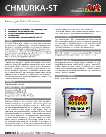 CHMURKA-ST PRODUCENT CHEMII BUDOWLANEJ I SYSTEMÓW OCIEPLEŃ Elewacyjna farba silikatowa • • • • • Bardzo trwała i odporna na korozję biologiczną Wyjątkowo paroprzepuszczalna Doskonale wiąże się z podłożem mineralnym Hydrofobowa Wzbogacona o formułę KOSBUDPROTECT PRODUKT Chmurka- ST jest farbą na bazie wodnego szkła potasowego z organicznymi stabilizatorami, wysoce dyfuzyjna, odporna na szorowanie i działanie warunków atmosferycznych, o doskonałej sile krycia. Wysoko paroprzepuszczalna, o neutralnym zapachu. Wzbogacona o formułę KOSBUDPROTECT zapobiegającą porastaniu ścian przez grzyby, algi i glony. Dostępna w kolorze białym oraz wg wzornika Kosbud Color System. ATEST HIGIENICZNY HK/B/0950/01/2011 ZASTOSOWANIE CHMURKĘ-ST stosuje się tynków mineralnych, zamienników kamienia, wolnych od wykwitów kamieni naturalnych murów ekranowych, także do renowacji starych nośnych powłok silikatowych i mineralnych. Zastosowane spoiwo powoduje chemiczne związanie z podłożem, co dodatkowo korzystnie wpływa na trwałość elewacji. Nie nadaje się do malowania podłoży z wykwitami solnymi, powierzchni lakierowanych, malowanych farbami dyspersyjnymi, tynków nie zawierających kwarcu, PCV i powierzchni drewnianych. NARZĘDZIA Pędzel lub wałek malarski. PARAMETRY TECHNICZNE Kategoria połysku: G3 (mat) Wielkość ziarna: S1 (drobna) Przenikalność pary wodnej: V1 (duża) Przepuszczalność wody W24: W1 (duża) OBRÓBKA Podłoże powinno być równe, czyste, suche, wolne od pyłów i środków obniżających przyczepność. Jako warstwę gruntującą można stosować grunt silikatowy- GRUNLIT-ST. Kolory intensywne o dużym nasyceniu barwy, ze względu na swój charakter nie zawsze są w pełni kryjące. Z tego względu zaleca się wykonanie warstwy podkładowej kolorem zbliżonym, dobrze kryjącym (najlepiej na bazie białej). Fabrycznie przygotowaną farbę dobrze wymieszać. Po odpowiednim przygotowaniu podłoża malować pędzlem lub wałkiem malarskim do całkowitego pokrycia powierzchni. Temperatura powietrza w trakcie robót powinna wynosić od+5oC do +25oC. Nie stosować w temperaturze poniżej +8oC ( dot. temp. malowanego obiektu). Nakładać materiał z jednej partii produkcyjnej, a materiały z CHMURKA-ST Elewacyjna farba silikatowa dwóch różnych partii dokładnie ze sobą wymieszać. UWAGA: Nie malować podczas bezpośredniej operacji słońca, przy silnym wietrze lub niebezpieczeństwie deszczu. CZAS WYSYCHANIA Przy temperaturze + 20oC i względnej wilgotności powietrza 65% powierzchnia nadaje się do ponownego pomalowania po ok. 6-8 godzinach. Za całkowicie sucha można uznać po ok. 24 godzinach. W przypadku niższej temperatury i wyższej wilgotności powietrza czas wysychania może ulec zmianie. ZUŻYCIE Około 0,2 – 0,3 kg/m2 na jedną warstwę na gładkim podłożu. W przypadku szorstkich powierzchni odpowiednio więcej. PRZECHOWYWANIE Należy przechowywać w suchym miejscu na paletach w oryginalnych opakowaniach, chronić przed wilgocią. Otwarte opakowania należy szczelnie zamknąć. Resztki produktu należy przelać do jak najmniejszego pojemnika i szczelnie zamknięte przechowywać nie dłużej niż 3 miesiące. Data ważności 12 miesięcy od daty produkcji. CZYSZCZENIE NARZEDZI Wodą, natychmiast po użyciu. CHMURKA-ST Elewacyjna farba silikatowa OPAKOWANIE Wiadra o pojemności 10l, 20l DALSZE INFORMACJE Powyższe informacje są opisem produktu. Należy je traktować jako ogólne wskazówki w oparciu o nasze badania i doświadczenia praktyczne, które jednak nie uwzględniają wymogów konkretnego przypadku zastosowania. W związku z tym zalecamy przeprowadzenie prób. Parametry produktu mogą ulec drobnym zmianom w zakresie deklarowanej klasy, nie wpływając na właściwości użytkowe i obróbkę. Z podanych informacji nie wynikają jakiekolwiek roszczenia odszkodowawcze. Niniejsza karta techniczna produktu jest obowiązująca i zastępuje wszystkie poprzednie. Wyrób dopuszczony do obrotu i powszechnego stosowania w budownictwie. Dziękowizna, dnia 10.07.2013. CHMURKA-ST Elewacyjna farba silikatowa PRODUCENT CHEMII BUDOWLANEJ I SYSTEMÓW OCIEPLEŃ