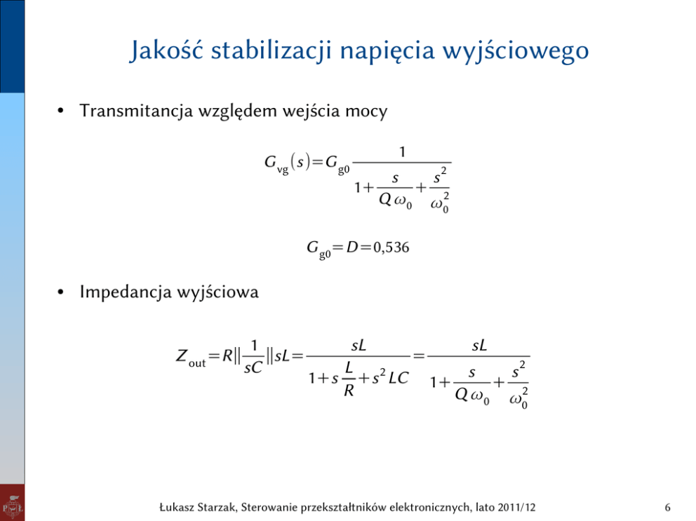 Jakość stabilizacji napięcia wyjściowego ● Transmitancja względem wejścia mocy G vg (s )=G g0 1 s s2 1+ + Q ω0 ω 2 0 G g0=D =0,536 ● Impedancja wyjściowa Z out =R∥ 1 ∥sL= sC sL sL = 2 L 2 s s 1+s +s LC 1+ + 2 R Qω ω 0 0 Łukasz Starzak, Sterowanie przekształtników elektronicznych, lato 2011/12 6 Wzmocnienie pętli otwartej T (s ) =H (s )G c (s )G m (s )G vd (s)= G c (s)H V 1 = VM D s s2 1+ + Q ω0 ω2 0 Łukasz Starzak, Sterowanie przekształtników elektronicznych, lato 2011/12 7 Wzmocnienie pętli otwartej nieskompensowanej f c≈1,8 kHz φ m≈5 ° G c (s)=1 ⇒ T (s )=T u0 1 s s2 1+ + 2 Q ω0 ω T u0 = HV =2,33⇔7,4 dB DV M 0 Łukasz Starzak, Sterowanie przekształtników elektronicznych, lato 2011/12 8 Projekt kompensatora PD ● ● Założenia zwiększenie częstotliwości odcięcia fc do fc′ = 5 kHz zwiększenie zapasu fazy φm do φm′ = 52° (Q = 1) Środki dla fc′ zapas fazy φm(fc′) ≈ 0° ▶ dla fc′ wzmocnienie pętli nieskompensowanej Tu(fc′) < 0 dB ▶ ● niezbędne przesunięcie fazy o θ = φm′ − φm(fc′) ≈ 52° w częstotliwości fc′ wzmocnienie kompensatora Gc dla fc′ musi wynieść Gc(fc′)dB = −Tu(fc′)dB ⇔ Gc(fc′) = 1/Tu(fc′) Wartości liczbowe f z = f c f p= f c √ √ 1−sinθ =1,72 kHz 1+sinθ 1+sinθ =14,5 kHz 1−sinθ T u ( f c )≈T u0 −2 () G c0 =G c ( f f c f0 √ c )⋅ =−20,6 dB⇔ 0,0933 fz fp =3,67 ⇔11,3 dB Łukasz Starzak, Sterowanie przekształtników elektronicznych, lato 2011/12 9 Wykres Bodego transmitancji kompensatora PD G c s =G c0 1 s ωz 1 s ωp Łukasz Starzak, Sterowanie przekształtników elektronicznych, lato 2011/12 10 Wykres Bodego transmitancji pętli otwartej z kompensatorem PD 1+ T (s )=T u (s )G c (s )=T u0 G c0 ( )( s 1+ ωp s ωz s s2 1+ + Q ω0 ω2 0 ) Łukasz Starzak, Sterowanie przekształtników elektronicznych, lato 2011/12 11 Wyrażenie 1/(1+T) z kompensatorem PD Łukasz Starzak, Sterowanie przekształtników elektronicznych, lato 2011/12 12 Kompensator PID G c s =G cm s 1 ωz 1 1 s ωp ωL s G cm =G c0 aby nie zmienić częstotliwości odcięcia f L≤ f c /10=500 Hz aby nie zmniejszyć zapasu fazy Łukasz Starzak, Sterowanie przekształtników elektronicznych, lato 2011/12 13 Wyrażenie 1/(1+T) z kompensatorem PID Łukasz Starzak, Sterowanie przekształtników elektronicznych, lato 2011/12 14 Transmitancja względem wejścia mocy układu otwartego i zamkniętego z kompensatorem PID Łukasz Starzak, Sterowanie przekształtników elektronicznych, lato 2011/12 15 Charakterystyki częstotliwościowe w pakiecie Scilab ● ● Deklaracja, że zmienna s ma być symbolem w wielomianach Definicja układu liniowego opisanego funkcją zmiennej s (transmitancją) ● 'c' = układ czasu ciągłego (continous time) Wykres Bodego zakres 1 Hz…1 MHz clf czyści okno ● Tylko charakterystyka amplitudowa ● Wzmocnienie w dB i faza w ° dla konkretnej częstotliwości 0 – dla składowej stałej Łukasz Starzak, Sterowanie przekształtników elektronicznych, lato 2011/12 16 Zapas fazy ● Liczbowo – zapas fazy w stopniach i częstotliwość odcięcia ● ● … … Zmodyfikowana funkcja show_margins, gdyż oryginalna kreśli zawsze w zakresie [−0,001; 1000] … ● Graficznie – wykres Bodego z zapasem fazy i amplitudy … ● Większość potrzebnych funkcji znajduje się w pakiecie cacsd Ich definicje można znaleźć w plikach *.sci w podkatalogu modules\cacsd\macros Łukasz Starzak, Sterowanie przekształtników elektronicznych, lato 2011/12 17 Charakterystyki częstotliwościowe w układzie otwartym Transmitancja kompensatora Gc(jω) Transmitancja pętli otwartej T(jω) Łukasz Starzak, Sterowanie przekształtników elektronicznych, lato 2011/12 18 Charakterystyki częstotliwościowe w układzie zamkniętym T(jω) Gvg 0 (DC) 100 Hz 1 kHz OL −5,42 dB 0,536=Gg0=D −5,34 dB 0,541 +14,1 dB 5,08=Gg0·Q CL −15,9 dB 0,161=D/(1+Tu0) −15,9 dB 0,161 −12,8 dB 0,228 CL PD −24,9 dB 0,0567=D/(1+Tu0Gc0) −24,9 dB 0,0567 −25,2 dB 0,0551 CL PID −∞ dB 0=D/(1+∞) −38,2 dB 0,0123 −26,1 dB 0,0496 1/(1+T) Gvg(jω) Łukasz Starzak, Sterowanie przekształtników elektronicznych, lato 2011/12 19 Układy automatyki opisane transmitancjami w pakiecie MicroSim Transmitancja względem sterowania Gvd dla układu otwartego wartość w ustalonym punkcie pracy (D = 0,536) amplituda składowej przemiennej (1 V spowoduje, że napięcie wyjściowe będzie co do wartości równe transmitancji) wynik symulacji ustalonego punktu pracy (Bias Point) dowolny opornik źródło typu VAC (nie VSIN) transmitancja Gvd (element LAPLACE) osobno licznik i mianownik Transmitancja pętli otwartej Tu Pętlę można przerwać w dowolnym punkcie; najlepiej w takim, w którym znamy składową stałą sygnału stałe wzmocnienie (element GAIN) Łukasz Starzak, Sterowanie przekształtników elektronicznych, lato 2011/12 20