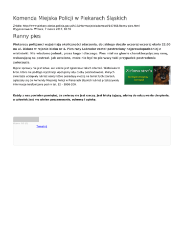Komenda Miejska Policji w Piekarach Śląskich Źródło: http://www.piekary.slaska.policja.gov.pl/k18/informacje/wiadomosci/147468,Ranny-pies.html Wygenerowano: Wtorek, 7 marca 2017, 10:59 Ranny pies Piekarscy policjanci wyjaśniają okoliczności zdarzenia, do jakiego doszło wczoraj wczoraj około 22.00 na ul. Didura w rejonie bloku nr 4. Pies rasy Labrador został postrzelony najprawdopodobniej z wiatrówki. Nie wiadomo jednak, przez kogo i dlaczego. Pies miał na głowie charakterystyczną ranę, wskazującą na postrzał. Jak ustalono, może nie być to pierwszy taki przypadek postrzelenia zwierzęcia. Ujęcie sprawcy nie jest łatwe, ale ważne jest zgłaszanie takich zdarzeń. Wiatrówka to broń, która nie podlega rejestracji. Apelujemy aby osoby poszkodowane, których zwierzęta ucierpiały lub też osoby które posiadają wiedzę na temat tych zdarzeń, zgłaszały się do Komendy Miejskiej Policji w Piekarach Sląskich lub też przekazywały informacje telefonicznie pod nr tel. 32 – 3936-200. Każdy z nas powinien pamiętać, że zwierzę nie jest rzeczą. Jest istotą żyjącą, zdolną do odczuwania cierpienia, a człowiek jest mu winien poszanowanie, ochronę i opiekę. Ocena: 0/5 (0) Tweetnij