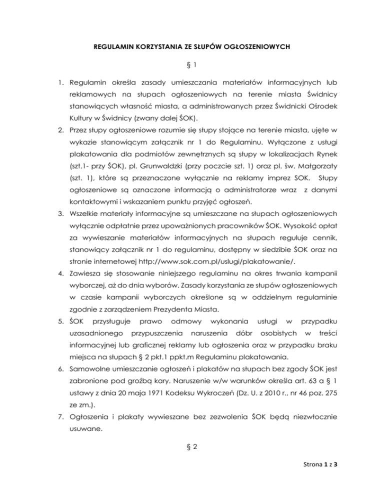 REGULAMIN KORZYSTANIA ZE SŁUPÓW OGŁOSZENIOWYCH §1 1. Regulamin określa zasady umieszczania materiałów informacyjnych lub reklamowych na słupach ogłoszeniowych na terenie miasta Świdnicy stanowiących własność miasta, a administrowanych przez Świdnicki Ośrodek Kultury w Świdnicy (zwany dalej ŚOK). 2. Przez słupy ogłoszeniowe rozumie się słupy stojące na terenie miasta, ujęte w wykazie stanowiącym załącznik nr 1 do Regulaminu. Wyłączone z usługi plakatowania dla podmiotów zewnętrznych są słupy w lokalizacjach Rynek (szt.1- przy ŚOK), pl. Grunwaldzki (przy poczcie szt. 1) oraz pl. św. Małgorzaty (szt. 1), które są przeznaczone wyłącznie na reklamy imprez SOK. ogłoszeniowe są oznaczone informacją o administratorze wraz Słupy z danymi kontaktowymi i wskazaniem punktu przyjęć ogłoszeń. 3. Wszelkie materiały informacyjne są umieszczane na słupach ogłoszeniowych wyłącznie odpłatnie przez upoważnionych pracowników ŚOK. Wysokość opłat za wywieszanie materiałów informacyjnych na słupach reguluje cennik, stanowiący załącznik nr 1 do regulaminu, dostępny w siedzibie ŚOK oraz na stronie internetowej http://www.sok.com.pl/uslugi/plakatowanie/. 4. Zawiesza się stosowanie niniejszego regulaminu na okres trwania kampanii wyborczej, aż do dnia wyborów. Zasady korzystania ze słupów ogłoszeniowych w czasie kampanii wyborczych określone są w oddzielnym regulaminie zgodnie z zarządzeniem Prezydenta Miasta. 5. ŚOK przysługuje uzasadnionego prawo odmowy przypuszczenia wykonania naruszenia dóbr usługi w osobistych przypadku w treści informacyjnej lub graficznej reklamy lub ogłoszenia oraz w przypadku braku miejsca na słupach § 2 pkt.1 ppkt.m Regulaminu plakatowania. 6. Samowolne umieszczanie ogłoszeń i plakatów na słupach bez zgody ŚOK jest zabronione pod groźbą kary. Naruszenie w/w warunków określa art. 63 a § 1 ustawy z dnia 20 maja 1971 Kodeksu Wykroczeń (Dz. U. z 2010 r., nr 46 poz. 275 ze zm.). 7. Ogłoszenia i plakaty wywieszane bez zezwolenia ŚOK będą niezwłocznie usuwane. §2 Strona 1 z 3 1. Określa się następujące zasady zlecania oraz wykonywania usługi polegającej na rozklejaniu plakatów, ogłoszeń na słupach ogłoszeniowych na terenie miasta: a. zlecenie plakatowania następuje wyłącznie w formie pisemnej, sporządzanej według wzoru stanowiącego załącznik nr 2 do niniejszego Regulaminu, który jest dostępny w siedzibie ŚOK i na stronie internetowej, b. Zleceniodawca winien dostarczyć do ŚOK zlecenie wraz z plakatami najpóźniej do piątku w tygodniu poprzedzającym okres ekspozycji. Zlecenia przyjmowane są w ŚOK (Rynek 43, Świdnica) w dni robocze w godzinach od 9:00 do 15:00, c. Zleceniodawca zobowiązany jest do dostarczenia plakatów w ilości o 10 % większej niż ilość wskazana w zleceniu, d. przyjmowane są do plakatowania afisze w formatach - minimalny A3 (297 x 420 mm), maksymalny B1 (707 x 1000 mm) o gramaturze 100 – 130 g/m2, e. Zleceniodawca może wybrać słupy wymienione w wykazie słupów na terenie miasta Świdnica (załącznik nr 3), na którym rozklejone zostaną afisze. Natomiast o miejscu umieszczania plakatu na wskazanym słupie decyduje pracownik dokonujący plakatowania, kierując się zasadą nie zaklejania plakatów i ogłoszeń aktualnych, f. plakaty wyklejane są w poniedziałek i wtorek. W przypadku wystąpienia przyczyn obiektywnie niezależnych. np. złe warunki atmosferyczne (silny wiatr, deszcz) termin wyklejania plakatów może ulec zmianie, g. czas ekspozycji liczony jest od wtorku do poniedziałku. Podstawowy czas ekspozycji to 7 dni z możliwością przedłużenia maksymalnie o kolejne 7 dni pod warunkiem estetycznego wyglądu plakatów, h. ŚOK nie odpowiada za uszkodzenia ekspozycji powstałe w wyniku działania osób trzecich i warunków atmosferycznych, i. ŚOK nie odpowiada za odbarwienia lub inne zniekształcenia plakatu dostarczonego przez Zleceniodawcę powstałych na wskutek stosowania nieodpowiednich farb, nie wysuszenia farby lub innych wad w druku lub produkcji papieru, j. ŚOK nie ponosi jakiejkolwiek odpowiedzialności za ewentualne naruszenie praw osób trzecich w związku z treścią zamieszczonego na zlecenie Strona 2 z 3 Zleceniodawcy plakatu bądź za związane z treścią plakatu naruszenie innych praw, k. Każdy materiał wywieszony zgodnie z regulaminem plakatowania oznaczony będzie w widocznym miejscu pieczęcią lub naklejką w celu łatwiejszej weryfikacji samowolnego umieszczania ogłoszeń, l. Plakaty pozostałe po kampanii, a nie odebrane w ciągu trzech dni od daty zakończenia zlecenia, są niszczone, m. ŚOK może odmówić wywieszenia ogłoszeń w przypadku braku miejsca reklamowego lub innej niemożności wykonania usługi. §3 1. Wszelkie reklamacje lub zastrzeżenia należy zgłaszać podczas trwania ekspozycji, w przeciwnym razie reklamacje nie będą uwzględniane. 2. Zleceniodawca wyraża zgodę na przetwarzanie swoich danych zgodnie z Ustawą o Ochronie Danych Osobowych z dnia 29.08.1997 r. przez Świdnicki Ośrodek Kultury dla celów związanych realizacją zleceń na plakatowanie. 3. Za wykonaną usługę Zleceniodawca otrzyma fakturę VAT lub paragon fiskalny. Strona 3 z 3