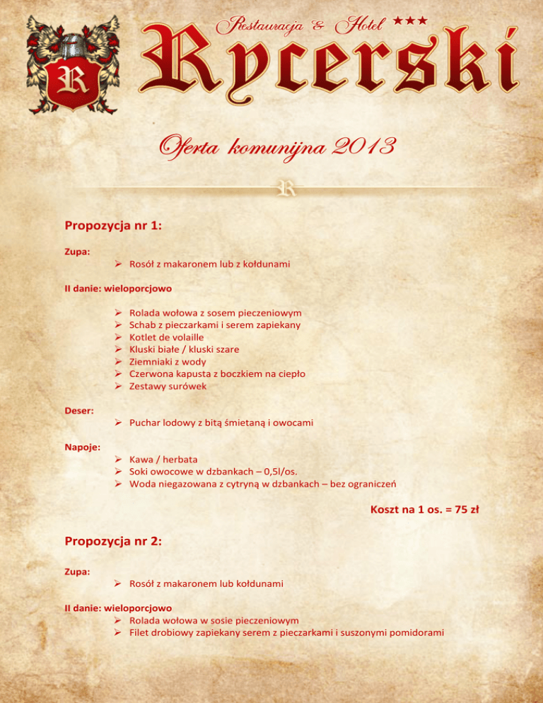 Oferta komunijna 2013 Propozycja nr 1: Zupa: Rosół z makaronem lub z kołdunami II danie: wieloporcjowo Deser: Napoje: Rolada wołowa z sosem pieczeniowym Schab z pieczarkami i serem zapiekany Kotlet de volaille Kluski białe / kluski szare Ziemniaki z wody Czerwona kapusta z boczkiem na ciepło Zestawy surówek Puchar lodowy z bitą śmietaną i owocami Kawa / herbata Soki owocowe w dzbankach – 0,5l/os. Woda niegazowana z cytryną w dzbankach – bez ograniczeń Koszt na 1 os. = 75 zł Propozycja nr 2: Zupa: Rosół z makaronem lub kołdunami II danie: wieloporcjowo Rolada wołowa w sosie pieczeniowym Filet drobiowy zapiekany serem z pieczarkami i suszonymi pomidorami Deser: Napoje: Schab panierowany Kluski białe/ kluski szare Ziemniaki z wody Kapusta biała zasmażana Zestaw surówek Puchar lodów waniliowych w malinowo - gruszkowym sosie Kawa / herbata Soki owocowe w dzbankach – 0,5l/os. Woda niegazowana z cytryną w dzbankach – bez ograniczeń Koszt na 1 os. = 80 zł Propozycja nr 3: Zupa: Rosół z makaronem lub kołdunami II danie: wieloporcjowo Rolada wołowa w sosie pieczeniowym Schab z pieczarkami i serem zapiekany Filety cielęce z delikatnym sosem bazyliowym Kluski białe/ kluski szare Ziemniaki z wody Sałatka z buraczków Zestaw surówek Deser: Puchar lodowy z bitą śmietaną i owocami Napoje: Kawa / herbata Soki owocowe w dzbankach 0,5l/os. Woda niegazowana z cytryną w dzbankach – bez ograniczeń Koszt na 1 os. = 85 zł Propozycja nr 4: Zupa: Rosół z makaronem lub z kołdunami II danie: wieloporcjowo Deser: Rolada wołowa z sosem pieczeniowym Schab z pieczarkami i serem zapiekany Kotlet de volaille Kluski białe / kluski szare Ziemniaki z wody Czerwona kapusta z boczkiem na ciepło Zestawy surówek Puchar lodowy z bitą śmietaną i owocami Napoje i owoce: Kawa / herbata Soki owocowe w dzbankach – 0,5l/os. Woda niegazowana z cytryną w dzbankach – bez ograniczeń Owoce sezonowe Zimna płyta: Półmiski mięs pieczonych o Schab pieczony ze śliwką/ z morelą o Schab nadziewany kiełbasą o Polędwiczki wieprzowe na ostro o Pierś z kurczaka faszerowana szpinakiem o Karkówka pieczona Dechy serów z bakaliami Pasztety swojskie Tymbaliki drobiowe Jaja faszerowane trzema pastami Trio śledziowe o Śledzie w śmietanie z jabłkiem o Śledzie w oleju marynowane z cebulką o Śledzie po mazursku Sałatka ryżowa z kurczakiem Sałatka Akropol (z serem feta) Pieczywo Koszt na 1 os. = 130 zł Propozycja nr 5: Zupa: Rosół z makaronem lub kołdunami II danie: wieloporcjowo Rolada wołowa w sosie pieczeniowym Filet drobiowy zapiekany serem z pieczarkami i suszonymi pomidorami Schab panierowany Kluski białe/ kluski szare Ziemniaki z wody Kapusta biała zasmażana Zestaw surówek Deser: Puchar lodów waniliowych w malinowo - gruszkowym sosie Napoje i owoce: Kawa / herbata Soki owocowe w dzbankach – 0,5l/os. Woda niegazowana z cytryną w dzbankach – bez ograniczeń Owoce sezonowe Zimna płyta: Półmiski mięs pieczonych o Schab pieczony ze śliwką/ z morelą o Schab nadziewany kiełbasą o Polędwiczki wieprzowe na ostro o Pierś z kurczaka faszerowana szpinakiem o Karkówka pieczona Dechy serów z bakaliami Pasztety swojskie Tymbaliki drobiowe Jaja faszerowane trzema pastami Trio śledziowe o Śledzie w śmietanie z jabłkiem o Śledzie w oleju marynowane z cebulką o Śledzie po mazursku Sałatka ryżowa z kurczakiem Sałatka Akropol (z serem feta) Pieczywo Koszt na 1 os. = 125 zł Propozycja nr 6: Zupa: Rosół z makaronem lub kołdunami II danie: wieloporcjowo Rolada wołowa w sosie pieczeniowym Schab z pieczarkami i serem zapiekany Filety cielęce z delikatnym sosem bazyliowym Kluski białe/ kluski szare Ziemniaki z wody Sałatka z buraczków Zestaw surówek Deser: Puchar lodowy z bitą śmietaną i owocami Napoje i owoce: Kawa / herbata Soki owocowe w dzbankach 0,5l/os. Woda niegazowana z cytryną w dzbankach – bez ograniczeń Owoce sezonowe Zimna płyta: Półmiski mięs pieczonych o Schab pieczony ze śliwką/ z morelą o Schab nadziewany kiełbasą o Polędwiczki wieprzowe na ostro o Pierś z kurczaka faszerowana szpinakiem o Karkówka pieczona Dechy serów z bakaliami Pasztety swojskie Tymbaliki drobiowe Jaja faszerowane trzema pastami Trio śledziowe o Śledzie w śmietanie z jabłkiem o Śledzie w oleju marynowane z cebulką o Śledzie po mazursku Sałatka ryżowa z kurczakiem Sałatka Akropol (z serem feta) Pieczywo Koszt na 1 os. = 140 zł Propozycja nr 7: Zupa: Rosół z makaronem lub z kołdunami II danie: wieloporcjowo Rolada wołowa z sosem pieczeniowym Schab z pieczarkami i serem zapiekany Kotlet de volaille Kluski białe / kluski szare Ziemniaki z wody Czerwona kapusta z boczkiem na ciepło Zestawy surówek Deser: Puchar lodowy z bitą śmietaną i owocami Napoje i owoce: Kawa / herbata Soki owocowe w dzbankach – 0,5l/os. Woda niegazowana z cytryną w dzbankach – bez ograniczeń Owoce sezonowe Zimna płyta: Półmiski mięs pieczonych o Schab pieczony ze śliwką/ z morelą o Schab nadziewany kiełbasą o Polędwiczki wieprzowe na ostro o Pierś z kurczaka faszerowana szpinakiem o Karkówka pieczona Dechy serów z bakaliami Pasztety swojskie Tymbaliki drobiowe Jaja faszerowane trzema pastami Trio śledziowe o Śledzie w śmietanie z jabłkiem o Śledzie w oleju marynowane z cebulką o Śledzie po mazursku Sałatka ryżowa z kurczakiem Sałatka Akropol (z serem feta) Pieczywo Kolacja: Barszcz czerwony z uszkami Koszt na 1 os. = 140 zł Propozycja nr 8: Zupa: Rosół z makaronem lub kołdunami II danie: wieloporcjowo Rolada wołowa w sosie pieczeniowym Filet drobiowy zapiekany serem z pieczarkami i suszonymi pomidorami Schab panierowany Kluski białe/ kluski szare Ziemniaki z wody Kapusta biała zasmażana Zestaw surówek Deser: Puchar lodów waniliowych w malinowo - gruszkowym sosie Napoje i owoce: Kawa / herbata Soki owocowe w dzbankach – 0,5l/os. Woda niegazowana z cytryną w dzbankach – bez ograniczeń Owoce sezonowe Zimna płyta