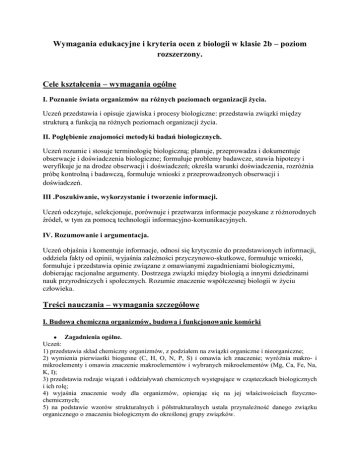 Wymagania edukacyjne i kryteria ocen z biologii w klasie 2b – poziom rozszerzony. Cele kształcenia – wymagania ogólne I. Poznanie świata organizmów na różnych poziomach organizacji życia. Uczeń przedstawia i opisuje zjawiska i procesy biologiczne: przedstawia związki między strukturą a funkcją na różnych poziomach organizacji życia. II. Pogłębienie znajomości metodyki badań biologicznych. Uczeń rozumie i stosuje terminologię biologiczną; planuje, przeprowadza i dokumentuje obserwacje i doświadczenia biologiczne; formułuje problemy badawcze, stawia hipotezy i weryfikuje je na drodze obserwacji i doświadczeń; określa warunki doświadczenia, rozróżnia próbę kontrolną i badawczą, formułuje wnioski z przeprowadzonych obserwacji i doświadczeń. III .Poszukiwanie, wykorzystanie i tworzenie informacji. Uczeń odczytuje, selekcjonuje, porównuje i przetwarza informacje pozyskane z różnorodnych źródeł, w tym za pomocą technologii informacyjno-komunikacyjnych. IV. Rozumowanie i argumentacja. Uczeń objaśnia i komentuje informacje, odnosi się krytycznie do przedstawionych informacji, oddziela fakty od opinii, wyjaśnia zależności przyczynowo-skutkowe, formułuje wnioski, formułuje i przedstawia opinie związane z omawianymi zagadnieniami biologicznymi, dobierając racjonalne argumenty. Dostrzega związki między biologią a innymi dziedzinami nauk przyrodniczych i społecznych. Rozumie znaczenie współczesnej biologii w życiu człowieka. Treści nauczania – wymagania szczegółowe I. Budowa chemiczna organizmów, budowa i funkcjonowanie komórki Zagadnienia ogólne. Uczeń: 1) przedstawia skład chemiczny organizmów, z podziałem na związki organiczne i nieorganiczne; 2) wymienia pierwiastki biogenne (C, H, O, N, P, S) i omawia ich znaczenie; wyróżnia makro- i mikroelementy i omawia znaczenie makroelementów i wybranych mikroelementów (Mg, Ca, Fe, Na, K, I); 3) przedstawia rodzaje wiązań i oddziaływań chemicznych występujące w cząsteczkach biologicznych i ich rolę; 4) wyjaśnia znaczenie wody dla organizmów, opierając się na jej właściwościach fizycznochemicznych; 5) na podstawie wzorów strukturalnych i półstrukturalnych ustala przynależność danego związku organicznego o znaczeniu biologicznym do określonej grupy związków. Węglowodany Uczeń: 1) przedstawia budowę i podaje właściwości węglowodanów; rozróżnia monosacharydy (triozy, pentozy i heksozy), disacharydy i polisacharydy; 2) przedstawia znaczenie wybranych węglowodanów (glukoza, fruktoza, galaktoza, ryboza, deoksyryboza, sacharoza, laktoza, maltoza, skrobia, glikogen, celuloza) dla organizmów. Lipidy Uczeń: 1) przedstawia budowę i znaczenie tłuszczów w organizmach; 2) rozróżnia lipidy (fosfolipidy, glikolipidy, woski i steroidy, w tym cholesterol), podaje ich właściwości i omawia znaczenie. Białka Uczeń: 1) opisuje budowę aminokwasów (wzór ogólny, grupy funkcyjne); 2) przedstawia za pomocą rysunku powstawanie wiązania peptydowego; 3) wyróżnia peptydy (oligopeptydy, polipeptydy), białka proste i białka złożone; 4) przedstawia biologiczną rolę białek; 5) opisuje strukturę 1-, 2-, 3- i 4-rzędową białek; 6) charakteryzuje wybrane grupy białek (albuminy, globuliny, histony, metaloproteiny); 7) określa właściwości fizyczne białek, w tym zjawiska: koagulacji i denaturacji. Kwasy nukleinowe Uczeń: 1) przedstawia budowę nukleotydów; 2) przedstawia strukturę podwójnej helisy i określa rolę wiązań wodorowych w jej utrzymaniu; 3) wykazuje rolę podwójnej helisy w replikacji DNA oraz określa polimerazę DNA jako enzym odpowiedzialny za replikację; uzasadnia znaczenie sposobu syntezy DNA (replikacji semikonserwatywnej) dla dziedziczenia informacji; 4) opisuje i porównuje strukturę i funkcję cząsteczek DNA i RNA; 5) przedstawia podstawowe rodzaje RNA występujące w komórce (mRNA, rRNA i tRNA) oraz określa ich rolę. Komórka Uczeń: 1) wskazuje poszczególne elementy komórki na schemacie, rysunku lub zdjęciu mikroskopowym, przedstawia podobieństwa i różnice między komórką prokariotyczną a eukariotyczną oraz między komórką roślinną, grzybową i zwierzęcą; 2) opisuje błony komórki, wskazując na związek między budową a funkcją pełnioną przez błony; 3) wyjaśnia przebieg plazmolizy w komórkach roślinnych, odwołując się do zjawiska osmozy; 4) opisuje budowę i funkcje mitochondriów i chloroplastów, podaje argumenty na rzecz ich endosymbiotycznego pochodzenia; 5) wyjaśnia rolę wakuoli, rybosomów, siateczki śródplazmatycznej (gładkiej i szorstkiej), aparatu Golgiego, lizosomów i peroksysomów w przemianie materii komórki; 6) wymienia przykłady grup organizmów charakteryzujących się obecnością ściany komórkowej oraz omawia związek między jej budową a funkcją; 7) opisuje sposoby poruszania się komórek i wykazuje rolę cytoszkieletu w ruchu komórek i transporcie wewnątrzkomórkowym; 8) wykazuje znaczenie połączeń międzykomórkowych u organizmów wielkomórkowych. II. Przegląd różnorodności organizmów. Zasady klasyfikacji i sposoby identyfikacji organizmów. Uczeń: 1) rozróżnia (na schemacie) grupy mono-, para- i polifiletyczne; 2) porządkuje hierarchicznie podstawowe rangi taksonomiczne; 3) przedstawia związek między filogenezą organizmów a ich klasyfikacją; 4) przedstawia na podstawie klasyfikacji określonej grupy organizmów jej uproszczone drzewo filogenetyczne; 5) oznacza organizmy za pomocą klucza; 6) opracowuje prosty dychotomiczny klucz do oznaczania określonej grupy organizmów lub obiektów. Wirusy. Uczeń: 1) omawia podstawowe elementy budowy wirionu i wykazuje, że jest ona ściśle związana z przystosowaniem się do skrajnego pasożytnictwa; 2) opisuje cykl życiowy bakteriofaga (lityczny i lizogeniczny) oraz wirusa zwierzęcego zachodzący bez lizy komórki; 3) wyjaśnia, co to są retrowirusy i podaje ich przykłady; 4) wymieni