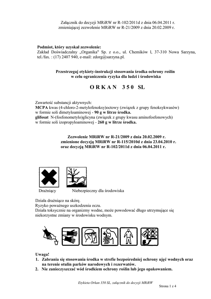 Załącznik do decyzji MRiRW nr R-102/2011d z dnia 06.04.2011 r. zmieniającej zezwolenie MRiRW nr R-21/2009 z dnia 20.02.2009 r. Podmiot, który uzyskał zezwolenie: Zakład Doświadczalny „Organika" Sp. z o.o., ul. Chemików l, 37-310 Nowa Sarzyna, tel./fax. : (17) 2407 940, e-mail: [email protected]. Przestrzegaj etykiety-instrukcji stosowania środka ochrony roślin w celu ograniczenia ryzyka dla ludzi i środowiska ORKAN 3 5 0 SL Zawartość substancji aktywnych: MCPA kwas (4-chloro-2-metylofenoksy)octowy (związek z grupy fenoksykwasów) w formie soli dimetyloaminowej - 90 g w litrze środka. glifosat N-(fosfonometylo)glicyna (związek z grupy kwasu aminofosfonowych) w formie soli izopropyloaminowej - 260 g w litrze środka. Zezwolenie MRiRW nr R-21/2009 z dnia 20.02.2009 r. zmienione decyzją MRiRW nr R-115/2010d z dnia 23.04.2010 r. oraz decyzją MRiRW nr R-102/2011d z dnia 06.04.2011 r. Drażniący Niebezpieczny dla środowiska Działa drażniąco na skórę. Ryzyko poważnego uszkodzenia oczu. Działa toksycznie na organizmy wodne, może powodować długo utrzymujące się niekorzystne zmiany w środowisku wodnym. Uwaga! 1. Zabrania się stosowania środka w strefie bezpośredniej ochrony ujęć wodnych oraz na terenie otulin parków narodowych i rezerwatów. 2. Nie zanieczyszczać wód środkiem ochrony roślin lub jego opakowaniem. Etykieta Orkan 350 SL, załącznik do decyzji MRiRW Strona 1 z 4 2 I OPIS DZIAŁANIA Środek chwastobójczy, w formie koncentratu do sporządzania roztworu wodnego, stosowany nalistnie, przeznaczony do zwalczania chwastów jednoliściennych i dwuliściennych w sadach. Środek pobierany jest poprzez liście, a następnie przemieszczany do korzeni i rozłogów chwastów powodując zahamowanie ich wzrostu i rozwoju. Pierwsze objawy działania środka na chwasty widoczne są po upływie 7-14 dni od wykonania zabiegu. Zamieranie chwastów następuje po około 30 dniach. Wysoka temperatura i wilgotność powietrza oraz silne nasłonecznienie przyspieszają działanie środka. Chwasty wrażliwe np.: w dawce 5 l/ha np.: chwastnica jednostronna, komosa biała, starzec zwyczajny, tasznik pospolity, wiechlina roczna. w dawce 7-8 l/ha np.: bodziszek drobny, mniszek pospolity, powój polny, rdest ptasi, ślaz zaniedbany, wierzbownica gruczołowata. Chwasty średnio wrażliwe w dawce 7-8 l/ha: perz właściwy. II ZAKRES STOSOWANIA, TERMINY I DAWKI 1. SADY (DRZEWA ZIARNKOWE) Środek stosować w okresie intensywnego wzrostu chwastów w dawce potrzebnej do zniszczenia występujących gatunków chwastów Zalecana dawka: 5-8 l/ha. Zalecana ilość wody: 200-300 l /ha. Zalecane opryskiwanie: średniokropliste. 2. UWAGI: 1. Przed opryskiwaniem usunąć mechanicznie wszystkie odrosty korzeniowe drzew owocowych. 2. Opryskiwać w sposób bezpieczny, najlepiej używając opryskiwaczy z osłonami, tak aby krople cieczy użytkowej nie przedostały się na liście, pędy i niezdrewniałą korę drzew ze względu na możliwość uszkodzenia roślin. 3. PRZECIWWSKAZANIA Środka nie stosować: • przed wschodami chwastów, • na liście, pędy oraz niezdrewniałą korę drzew i krzewów ze względu na możliwość uszkodzenia roślin, • na rośliny mokre, • przed spodziewanym deszczem, • podczas wiatru stwarzającego możliwość znoszenia cieczy użytkowej na sąsiednie rośliny uprawne i tereny sąsiadujące z terenem opryskiwanym. III OKRES KARENCJI okres od dnia ostatniego zabiegu do dnia zbioru roślin przeznaczonych do konsumpcji NIE DOTYCZY IV OKRES PREWENCJI DLA LUDZI, ZWIERZĄT, PSZCZÓŁ okres zapobiegający zatruciu NIE DOTYCZY Etykieta Orkan 350 SL, załącznik do decyzji MRiRW 3 V SPORZĄDZANIE CIECZY UŻYTKOWEJ Przed przystąpieniem do sporządzania cieczy użytkowej dokładnie ustalić potrzebną jej ilość. Środek powoduje korozję metali, więc do wykonania zabiegu używać opryskiwaczy ze zbiornikiem z tworzywa sztucznego. Odmierzoną ilość środka wlać do zbiornika opryskiwacza napełnionego częściowo wodą (z włączonym mieszadłem) i uzupełnić wodą do potrzebnej ilości. Po wlaniu środka do zbiornika opryskiwacza nie wyposażonego w mieszadło hydrauliczne ciecz w zbiorniku mechanicznie wymieszać. Opróżnione opakowania przepłukać trzykrotnie woda, a popłuczyny wlać do zbiornika z cieczą użytkową. W przypadku przerw w opryskiwaniu przed ponownym przystąpieniem do pracy, dokładnie wymieszać ciecz użytkową w zbiorniku opryskiwacza. Po pracy aparaturę dokładnie wymyć. VI PRZECHOWYWANIE Chronić przed dziećmi. Nie przechowywać razem z żywnością, napojami i paszami dla zwierząt. Przechowywać pojemnik szczelnie zamknięty. Przechowywać z dala od źródeł ciepła. Przechowywać wyłącznie w oryginalnym opakowaniu w temperaturze nie niższej niż 0°C i nie wyższej niż 30°C. VII WARUNKI BEZPIECZNEGO STOSOWANIA ŚRODKA − Nie jeść i nie pić oraz nie palić tytoniu podczas stosowania środka. − Nie wdychać rozpylonej cieczy użytkowej. − Unikać zanieczyszczenia skóry i oczu. − Nosić odpowiednią odzież ochronną, odpowiednie rękawice ochronne i okulary lub ochronę twarzy. − W razie połknięcia niezwłocznie zasięgnij porady lekarza - pokaż opakowanie lub etykietę. Resztki cieczy użytkowej rozcieńczyć wodą i wypryskać na powierzchni poprzednio opryskiwanej. Wodę użytą do mycia aparatury wypryskać na powierzchni uprzednio opryskiwanej, stosując te same środki ochrony osobistej. − Środek i opakowanie usuwać jako odpad niebezpieczny. − Opróżnione opakowania po środku zwrócić do sprzedawcy, u którego środek został zakupiony. − Zabrania się spalania opakowań po środku ochrony roślin we własnym zakresie. UWAGA: ZABRANIA SIĘ WYKORZYSTYWANIA OPRÓŻNIONYCH OPAKOWAŃ PO ŚRODKACH OCHRONY ROŚLIN DO INNYCH CELÓW, W TYM TAKŻE TRAKTOWANIA ICH JAKO SUROWCE WTÓRNE. VIII ANTIDOTUM BRAK, STOSOWAĆ LECZENIE OBJAWOWE IX POMOC MEDYCZNA W zaistniałych sytuacjach, kiedy wymagana 