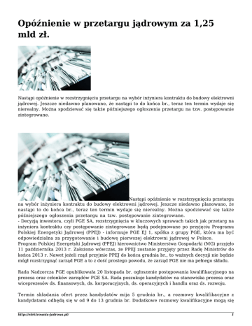 Opóźnienie w przetargu jądrowym za 1,25 mld zł. Nastąpi opóźnienie w rozstrzygnięciu przetargu na wybór inżyniera kontraktu do budowy elektrowni jądrowej. Jeszcze niedawno planowano, że nastąpi to do końca br., teraz ten termin wydaje się nierealny. Można spodziewać się także późniejszego ogłoszenia przetargu na tzw. postępowanie zintegrowane. Nastąpi opóźnienie w rozstrzygnięciu przetargu na wybór inżyniera kontraktu do budowy elektrowni jądrowej. Jeszcze niedawno planowano, że nastąpi to do końca br., teraz ten termin wydaje się nierealny. Można spodziewać się także późniejszego ogłoszenia przetargu na tzw. postępowanie zintegrowane. - Decyzją inwestora, czyli PGE SA, rozstrzygnięcia w kluczowych sprawach takich jak przetarg na inżyniera kontraktu czy postępowanie zintegrowane będą podejmowane po przyjęciu Programu Polskiej Energetyki Jądrowej (PPEJ) - informuje PGE EJ 1, spółka z grupy PGE, która ma być odpowiedzialna za przygotowanie i budowę pierwszej elektrowni jądrowej w Polsce. Program Polskiej Energetyki Jądrowej (PPEJ) kierownictwo Ministerstwa Gospodarki (MG) przyjęło 11 października 2013 r. Założono wówczas, że PPEJ zostanie przyjęty przez Radę Ministrów do końca 2013 r. Nawet jeżeli rząd przyjmie PPEJ do końca grudnia br., to ważnych decyzji nie będzie mógł rozstrzygnąć zarząd PGE a to z dość prostego powodu, że zarząd PGE nie ma pełnego składu. Rada Nadzorcza PGE opublikowała 20 listopada br. ogłoszenie postępowania kwalifikacyjnego na prezesa oraz członków zarządów PGE SA. Rada poszukuje kandydatów na stanowiska prezesa oraz wiceprezesów ds. finansowych, ds. korporacyjnych, ds. operacyjnych i handlu oraz ds. rozwoju. Termin składania ofert przez kandydatów mija 5 grudnia br., a rozmowy kwalifikacyjne z kandydatami odbędą się w od 9 do 13 grudnia br. Dodatkowe rozmowy kwalifikacyjne mogą się http://elektrownia-jadrowa.pl/ 1 odbyć w dniach 16-19 grudnia. To by wskazywało, że nowy zarząd PGE poznamy jeszcze przed świętami. Nowo wybrany zarząd PGE będzie musiał zapoznać się ze spółką, więc wątpliwe jest, że już w pierwszych tygodniach swojego urzędowania będzie decydował o tak ważnych kwestiach jak wybór inżyniera kontraktu do budowy elektrowni jądrowej czy ogłoszenie przetargu zintegrowanego. W lutym 2011 r. opublikowano ogłoszenie o przetargu na wybór inżyniera kontraktu. Zadaniem inżyniera kontraktu jest doradzanie PGE EJ 1 na etapie przygotowań projektu do budowy i samej budowy elektrowni jądrowej. Zwycięzca postępowania, jak szacowała PGE ogłaszając przetarg w 2011 roku , ma dostać zamówienie na 10 lat o szacunkowej wartości około 1,25 mld zł. Według wcześniej pojawiających się informacji na krótkiej liście potencjalnych doradców PGE przy budowie elektrowni jądrowej znalazło się konsorcjum firm Scott Wilson Polska i Tractebel Engineering, swoje oferty złożyły również firmy Exelon Generation Company, LLC i Amec Nuclear UK Ltd. Inżynier kontraktu (Owner’s Engineer) stanowić będzie integralną część organizacji inwestora (czyli spółki PGE EJ 1) wspierając go w przygotowaniu i realizacji projektu budowy elektrowni jądrowej. Ma być podmiotem wspierającym PGE EJ 1 w realizacji zadań i wypełnianiu obowiązków inwestora w stosunku do dostawcy technologii reaktora i głównego wykonawcy EPC oraz pozostałych wykonawców kluczowych prac. Zakres prac przewiduje cztery główne obszary współpracy: udział w przygotowaniu i przeprowadzeniu postępowania zintegrowanego, w szczególności w zakresie wyboru dostawcy technologii reaktora oraz głównego wykonawcy EPC, zarządzanie projektem, jakością i bezpieczeństwem oraz rozwój kompetencji własnych Inwestora, nadzór nad realizacją inwestycji oraz uzyskiwanie wymaganych zezwoleń (m.in. dozoru jądrowego) i pozwoleń oraz zarządzanie łańcuchem dostaw i kontraktami. Z kolei na pierwszy kwartał 2014 r. planowano ogłoszenie przetargu na postępowanie zintegrowane. Postępowanie zintegrowane zakłada przeprowadzenie jednego postępowania, które łączy kluczowe elementy projektu budowy elektrowni jądrowej, czyli wybór partnera strategicznego lub biznesowego, który zapewni dostawę technologii, generalnego wykonawcy, dostawę usług wsparcia w zakresie eksploatacji i utrzymania ruchu elektrowni, dostawy paliwa oraz zapewni finansowanie dłużne. Rozstrzygniecie postępowania zintegrowanego przewidywane jest w 2016 r. Spółka PGE EJ 1 już odbyła serię wstępnych spotkań z dostawcami technologii jądrowej i potencjalnymi partnerami. Z PPEJ wynika, że do końca 2016 r. nastąpi ustalenie lokalizacji i zawarcie kontraktu na wybraną technologię pierwszej elektrowni jądrowej. Lata 2017 i 2018 to wykonanie projektu technicznego i uzyskanie wymaganych prawem decyzji i opinii. Budowa pierwszego bloku jądrowego w Polsce ma rozpocząć się w roku 2019, jego podłączenie do sieci zaplanowano na rok 2024. Autor: Dariusz Ciepiela Źródło: WNP.PL http://elektrownia-jadrowa.pl/ 2