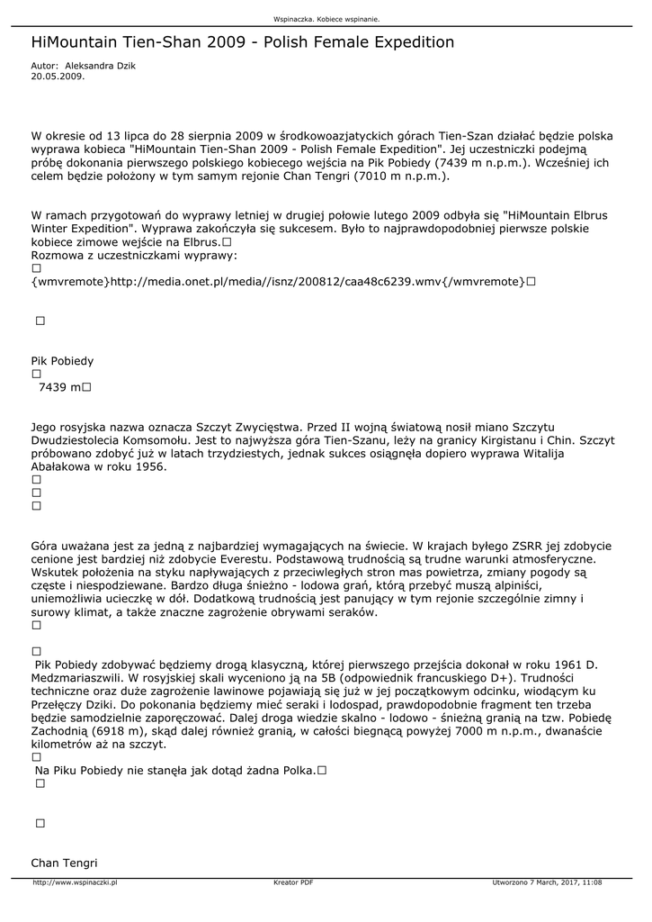 próbę dokonania pierwszego polskiego kobiecego wejścia na Pik Pobiedy (7439 m n.p.m.). Wcześniej ich