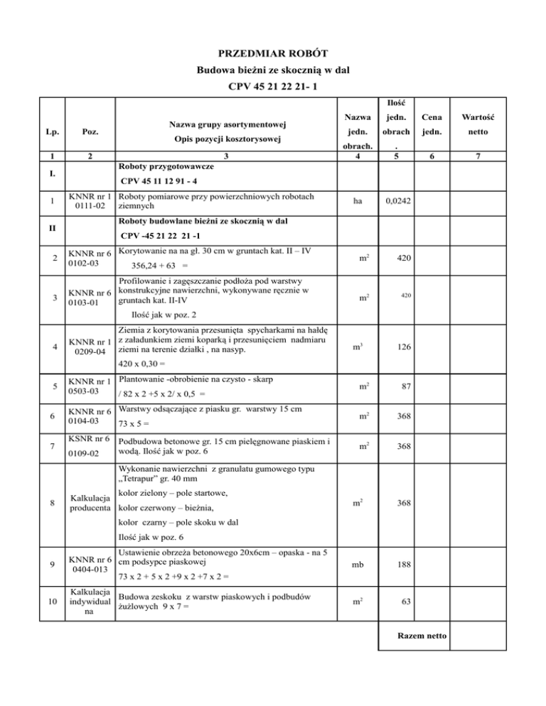PRZEDMIAR ROBÓT Budowa bieżni ze skocznią w dal CPV 45 21 22 21- 1 Ilość Lp. Poz. 1 2 I. 1 II Nazwa grupy asortymentowej Opis pozycji kosztorysowej 3 Nazwa jedn. Cena Wartość jedn. obrach jedn. netto obrach. 4 . 5 6 7 ha 0,0242 Roboty przygotowawcze CPV 45 11 12 91 - 4 KNNR nr 1 Roboty pomiarowe przy powierzchniowych robotach 0111-02 ziemnych Roboty budowlane bieżni ze skocznią w dal CPV -45 21 22 21 -1 2 KNNR nr 6 Korytowanie na na gł. 30 cm w gruntach kat. II – IV 0102-03 356,24 + 63 = m2 420 3 Profilowanie i zagęszczanie podłoża pod warstwy konstrukcyjne nawierzchni, wykonywane ręcznie w KNNR nr 6 gruntach kat. II-IV 0103-01 Ilość jak w poz. 2 m2 420 4 Ziemia z korytowania przesunięta spycharkami na hałdę KNNR nr 1 z załadunkiem ziemi koparką i przesunięciem nadmiaru 0209-04 ziemi na terenie działki , na nasyp. 420 x 0,30 = 5 KNNR nr 1 Plantowanie -obrobienie na czysto - skarp 0503-03 / 82 x 2 +5 x 2/ x 0,5 = m2 87 6 KNNR nr 6 Warstwy odsączające z piasku gr. warstwy 15 cm 0104-03 73 x 5 = m2 368 7 KSNR nr 6 Podbudowa betonowe gr. 15 cm pielęgnowane piaskiem i wodą. Ilość jak w poz. 6 0109-02 m2 368 m3 126 Wykonanie nawierzchni z granulatu gumowego typu „Tetrapur” gr. 40 mm kolor zielony – pole startowe, Kalkulacja producenta kolor czerwony – bieżnia, m2 368 9 Ustawienie obrzeża betonowego 20x6cm – opaska - na 5 KNNR nr 6 cm podsypce piaskowej 0404-013 73 x 2 + 5 x 2 +9 x 2 +7 x 2 = mb 188 10 Kalkulacja Budowa zeskoku z warstw piaskowych i podbudów indywidual żużlowych 9 x 7 = na m2 63 8 kolor czarny – pole skoku w dal Ilość jak w poz. 6 Razem netto Podatek VAT 22% Ogółem