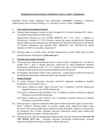 Regulamin promocji związanej z konkursem „Uwierz w siebie” („Regulamin”) Regulamin określa zasady organizacji akcji promocyjnej („Promocji”) związanej z konkursem organizowanym przez Luxottica Poland sp. z o.o. pod nazwą „Uwierz w siebie” („Konkurs”). 1. Czas i miejsce prowadzenia Promocji 1.1. Promocja będzie dostępna w terminie od dnia 2 listopada 2015 r. do dnia 24 grudnia 2015 r. lub do wyczerpania zapasu kuponów konkursowych. Organizatorem Promocji jest jest AVENIR MEDICAL SP. Z O.O. S.K.A. z siedzibą we Wrocławiu,ul. Centralna 24, 52-114 Wrocław, wpisany do rejestru przedsiębiorców Krajowego Rejestru Sądowego prowadzonego przez Sąd Rejonowy dla Wrocławia-Fabrycznej we Wrocławiu, VI Wydział Gospodarczy pod numerem KRS: 0000447550, NIP: 899-259-52-58, kapitał zakładowy: 50 000 zł (zwany dalej „Organizator”). 1.2. Promocją objęte są wszystkie salony sprzedaży Organizatora na terenie Polski, które prowadzą sprzedaż okularów korekcyjnych („Salon optyczny”). 2. Warunki skorzystania z Promocji 2.1. Z Promocji może skorzystać konsument, który w okresie od dnia 2 listopada 2015 r. do dnia 24 grudnia 2015 r. złoży w Salonie optycznym zamówienie na zakup kompletnych okularów korekcyjnych, określonych w pkt. 3.1.1.-3.1.3. poniżej, przy czym za dzień złożenia zamówienia przyjmuje się datę zamieszczoną na zleceniu podpisanym przez konsumenta. 2.2. W przypadku wprowadzenia zmian w treści zamówienia – za datę złożenia zamówienia uznaje się datę podpisania pierwotnego zamówienia (przed wprowadzeniem zmian). 3. Zasady Promocji 3.1. W ramach Promocji konsument otrzymuje możliwość zakupienia kompletnych okularów korekcyjnych w promocyjnej cenie, tj.: 3.1.1. oprawy okularowej marki Vogue Eyewear® wraz z kompletem soczewek okularowych objętych Promocją za cenę 299,00 zł (brutto) lub 3.1.2. oprawy okularowej marki Ray-Ban® wraz z kompletem soczewek okularowych objętych Promocją za cenę 499,00 zł (brutto) lub 3.1.3. oprawy okularowej marki Oakley® wraz z kompletem soczewek okularowych objętych Promocją za cenę 499,00 zł (brutto). 3.2. Promocja dotyczy wyłącznie wybranych modeli opraw okularowych marki Vogue Eyewear®, RayBan® i Oakley®. Promocją objęte są wszystkie modele opraw okularowych marki Vogue Eyewear®, oraz wybrane modele opraw okularowych marki Ray-Ban® i Oakley®, te których cena nie przekracza 650 zł brutto. Szczegóły dotyczące konkretnych modeli opraw okularowych objętych Promocją są dostępne w Salonie optycznym. 3.3. Promocja dotyczy wyłącznie następującego modelu/rodzaju soczewek okularowych: Soczewki 1.50 CR9 HMAR 65,70 mm . Szczegóły dotyczące powyższego modelu/rodzaju soczewek okularowych objętych Promocją są dostępne w Salonie optycznym. 1 3.4. Koszt soczewek okularowych objętych Promocją oraz koszt usługi zamontowania soczewek okularowych objętych Promocją w oprawach okularowych marki Vogue Eyewear®, Ray-Ban® i Oakley® wliczony jest w ceny określone w pkt. 3.1.1. – 3.1.3. powyżej. 3.5. Konsument może zakupić oprawy okularowe objęte Promocją wraz z kompletem soczewek okularowych, które nie są objęte Promocją. W takim przypadku konsument, poza dokonaniem zakupu po cenie promocyjnej, określonej w pkt. 3.1.1. – 3.1.3. powyżej, zobowiązany jest dopłacić różnicę pomiędzy ceną wybranych soczewek okularowych nieobjętych Promocją, a ceną soczewek okularowych objętych Promocją, które miały zgodnie z postanowieniami Regulaminu zostać zamontowane w oprawach okularowych. 3.6. Za odrębną, dodatkową opłatą konsument może dokupić do okularów nabytych w ramach Promocji: barwienie szkieł lub soczewek, bądź wyposażenie szkieł lub soczewek w filtr UV. 3.7. Przy zakupie dowolnych okularów korekcyjnych marki Vogue Eyewear®, Ray-Ban® i Oakley®, w tym tych objętych Promocją, konsument otrzyma od Salonu optycznego kupon konkursowy zawierający niepowtarzalny kod rejestracyjny umożliwiający wzięcie udziału w Konkursie. Salon optyczny obowiązany jest zamieścić na każdym kuponie konkursowym swoją pieczątkę oraz kod modelu zakupionych okularów korekcyjnych. 3.8. Kod rejestracyjny do Konkursu zawarty na kuponie konkursowym jest jednocześnie indywidualnym kodem rabatowym uprawniający do otrzymania 15% rabatu na zakup towarów lub usług na portalu www.vitalia.pl, takich m.in. jak: szyty na miarę plan diety, spersonalizowany plan treningowy z wirtualnym trenerem, dedykowane porady stylisty. Kody rabatowe są ważne do dnia 15 grudnia 2015 r. i po tym terminie wygasają. Kod rabatowy wygasa również w przypadku jego realizacji. 3.9. Regulamin Konkursu dostępny jest na stronie www.uwierzwsiebie.info. 4. Postanowienia końcowe 4.1. Wszelką korespondencję związaną z Promocją należy kierować na adres Salonu optycznego. 4.2. Dodatkowe informacje związane z Promocją można uzyskać w Salonie optycznym. 2