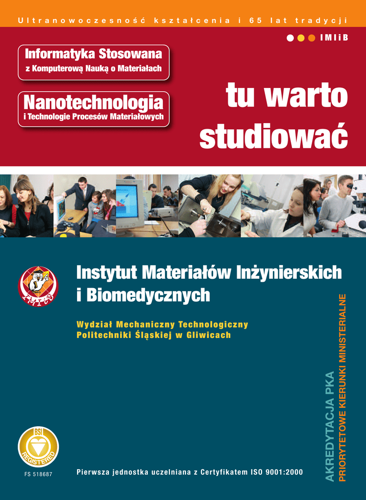 U l t r a n o w o c z e s n o ś ć k s z t a ł c e n i a i 6 5 l a t t r a d y c j i IMIiB Informatyka Stosowana z Komputerową Nauką o Materiałach Nanotechnologia i Technologie Procesów Materiałowych tu warto studiować FS 5186 8 7 Pier wsza jedn os tka uczel nian a z Ce rtyfi kat em ISO 9 001 :2 0 00 AKREDYTACJA PKA W y d z i a ł M e c h a n i c z n y Te c h n o l o g i c z n y Po l i t e c h n i k i Ś l ą s k i e j w G l i w i c a c h PRIORYTETOWE KIERUNKI MINISTERIALNE Instytut Materiałów Inżynierskich i Biomedycznych Dlaczego u nas? STRUKTURA ORGANIZACYJNA Dyrektor: m. dr h.c. prof. zw. dr hab. inż. Leszek A. Dobrzański Zastępca Dyrektora ds. Nauki: Prof. Politechniki Śląskiej, dr hab. inż. Ryszard Nowosielski Zastępca Dyrektora ds. Dydaktyki: Prof. Politechniki Śląskiej, dr hab. inż. Jan Szajnar Zakład Technologii Procesów Materiałowych, Zarządzania i Technik Komputerowych w Materiałoznawstwie Kierownik: m. dr h.c. prof. zw. dr hab. inż. Leszek A. Dobrzański Zakład Inżynierii Materiałów Konstrukcyjnych i Specjalnych Kierownik: Prof. Politechniki Śląskiej, dr hab. inż. Wojciech Ozgowicz Zakład Inżynierii Materiałów Biomedycznych Kierownik: prof. zw. dr hab. inż. Jan Marciniak Zakład Materiałów Nanokrystalicznych i Funkcjonalnych oraz Zrównoważonych Technologii Proekologicznych Kierownik: Prof. Politechniki Śląskiej, dr hab. inż. Ryszard Nowosielski Zakład Odlewnictwa Kierownik: Prof. Politechniki Śląskiej, dr hab. inż. Jan Szajnar Zakład Przetwórstwa Materiałów Metalowych i Polimerowych IMIiB Kierownik: Prof. Politechniki Śląskiej, dr hab. inż. Gabriel Wróbel JAKOŚĆ KSZTAŁCENIA Instytut Materiałów Inżynierskich i Biomedycznych Politechniki Śląskiej jest największą wewnętrzną jednostką organizacyjną jednego z 4 najstarszych i największych Wydziałów Politechniki Śląskiej – Wydziału Mechanicznego Technologicznego. Instytut jest pierwszą jednostką uczelnianą w Polsce z Certyfikatem ISO 9001:2000 w zakresie usług dydaktycznych i badawczych w obszarze inżynierii materiałowej, który ma istotny wpływ na wzrost jakości kształcenia, tak ważnej w zintegrowanej Unii Europejskiej i na zmieniających się w ostatnich latach rynkach edukacyjnym i pracy. Instytut stanowi prężny ośrodek naukowy o międzynarodowym znaczeniu w zakresie inżynierii materiałowej, inżynierii powierzchni, biomateriałów i inżynierii biomedycznej, nanotechnologii i materiałów nanostrukturalnych, technologii proekologicznych oraz komputerowej nauki o materiałach. znajomość praw fizycznych znajomość zasad organizacji i zarządzania tradycyjne umiejętności inżynierskie dobór postaci konstrukcyjnej produktów dobór materiałów inżynierskich produktów dobór procesu technologicznego produktów S T U D I O W A Ć cja maszyn, metalurgia, biocybernetyka i inżynieria biomedyczna, automatyka i robotyka, informatyka, organizacja i zarządzanie oraz pedagogika. Kadra Instytutu Materiałów Inżynierskich i Biomedycznych składa się z młodego, ambitnego, dynamicznie rozwijającego się 150-osobowego zespołu naukowego, w tym z 19 profesorów (średnia wieku w grupie doktorów, asystentów i doktorantów nie przekracza 35 lat). Zespół ten stale podwyższa swoje kwalifikacje zawodowe poprzez udział w stażach zagranicznych, zwykle 4-5 miesięcznych, niekiedy kilkuletnich, krótkookresowych wyjazdach zagranicznych w renomowanych ośrodkach europejskich i światowych, a także w warsztatach naukowych, specjalistycznych szkołach i kursach, wspólnych studiach doktoranckich, wymianie osobowej pomiędzy ośrodkami krajowymi. W A R T O Do dyscyplin naukowych uprawianych w Instytucie Materiałów Inżynierskich i Biomedycznych Politechniki Śląskiej należą: inżynieria materiałowa, budowa i eksploata- KADRA T U DYSCYPLINY NAUKOWE W p e ł n i a k r e d y t o w a n e NAGRODY IMIiB Za wybitne osiągnięcia naukowe, dydaktyczne i organizacyjne pracownicy Instytutu Materiałów Inżynierskich i Biomedycznych uzyskują liczne nagrody. Do tej pory otrzymali: kilka nagród Premiera, kilkanaście nagród Ministra, kilka Medali Międzynarodowych i na Międzynarodowych Targach Technologii, kilka nagród i stypendiów Fundacji na Rzecz Nauki Polskiej, kilkanaście stypendiów Fundacji Wyszehradzkiej oraz kilka Fundacji H. Kołłątaja, kilka nagród na Międzynarodowych Targach Książek Atena i Oświata oraz Wrocławskich, kilka wyróżnień na krajowych i zagranicznych konferencjach naukowych, kilkanaście nagród Koncernu FIAT, kilkaset nagród JM Rektora Politechniki Śląskiej oraz liczne Ordery i Odznaczenia Państwowe. O Autorytecie naukowym Instytutu świadczą również bardzo liczne nominacje pracowników Instytutu w skład krajowych i zagranicznych gremiów naukowych, w tym: • Komitetów, Sekcji i Komisji Polskiej Akademii Nauk, • World Academy of Materials and Manufacturing Engineering, • Rady Głównej Szkolnictwa Wyższego, • licznych krajowych i międzynarodowych stowarzyszeń naukowych. z a j ę c i a d y d a k t y c z n e ZAJĘCIA DYDAKTYCZNE Pracownicy Instytutu Materiałów Inżynierskich i Biomedycznych prowadzą zajęcia na wszystkich kierunkach i typach studiów na Wydziale Mechanicznym Technologicznym, w szczególności prowadzą przedmioty z zakresu inżynierii materiałowej oraz informatyki. Instytut posiada nowoczesne zaplecze laboratoryjne do realizacji zajęć dydaktycznych oraz do wykonywania prac naukowych. Corocznie sprawowana jest opieka nad kilkuset pracami przejściowymi oraz pracami dyplomowymi. KSZTAŁCENIE NA ODLEGŁOŚĆ Platforma E-learning Instytutu Materiałów Inżynierskich i Biomedycznych, należąca do jednych z największych w Polsce, została utworzona w październiku 2004 roku, jako nowoczesne narzędzie do kształcenia na odległość i zawiera m.in. materiały dydaktyczne do wykładów i przedmiotów materiałoznawczych oraz instrukcje do ćwiczeń laboratoryjnych prowadzon