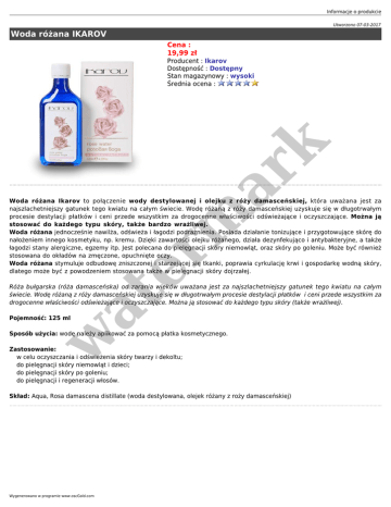 Informacje o produkcie Utworzono 07-03-2017 Woda różana IKAROV Cena : 19,99 zł er m ar k Producent : Ikarov Dostępność : Dostępny Stan magazynowy : wysoki Średnia ocena : Woda różana Ikarov to połączenie wody destylowanej i olejku z róży damasceńskiej, która uważana jest za najszlachetniejszy gatunek tego kwiatu na całym świecie. Wodę różaną z róży damasceńskiej uzyskuje się w długotrwałym procesie destylacji płatków i ceni przede wszystkim za drogocenne właściwości odświeżające i oczyszczające. Można ją stosować do każdego typu skóry, także bardzo wrażliwej. Woda różana jednocześnie nawilża, odświeża i łagodzi podrażnienia. Posiada działanie tonizujące i przygotowujące skórę do nałożeniem innego kosmetyku, np. kremu. Dzięki zawartości olejku różanego, działa dezynfekująco i antybakteryjne, a także łagodzi stany alergiczne, egzemy itp. Jest polecana do pielęgnacji skóry niemowląt, oraz skóry po goleniu. Może być również stosowana do okładów na zmęczone, opuchnięte oczy. Woda różana stymuluje odbudowę zniszczonej i starzejącej się tkanki, poprawia cyrkulację krwi i gospodarkę wodną skóry, dlatego może być z powodzeniem stosowana także w pielęgnacji skóry dojrzałej. at Róża bułgarska (róża damasceńska) od zarania wieków uważana jest za najszlachetniejszy gatunek tego kwiatu na całym świecie. Wodę różaną z róży damasceńskiej uzyskuje się w długotrwałym procesie destylacji płatków i ceni przede wszystkim za drogocenne właściwości odświeżające i oczyszczające. Można ją stosować do każdego typu skóry (także wrażliwej). Pojemność: 125 ml w Sposób użycia: wodę należy aplikować za pomocą płatka kosmetycznego. Zastosowanie: w celu oczyszczania i odświeżenia skóry twarzy i dekoltu; do pielęgnacji skóry niemowląt i dzieci; do pielęgnacji skóry po goleniu; do pielęgnacji i regeneracji włosów. Skład: Aqua, Rosa damascena distillate (woda destylowana, olejek różany z roży damasceńskiej) Wygenerowano w programie www.oscGold.com