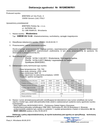 Deklaracja zgodności Nr W/GMDM/R01 Producent wyrobu: BMETERS srl Via Friuli, 3 33050 Gonars (Ud) ITALY Upoważniony przedstawiciel BMETERS Polska Sp. z o.o. ul. GŁÓWNA 60, 51-188 PSARY/k. Wrocławia 1. Nazwa wyrobu: Typ: Wodomierz GMDM DN 15-50 - Wielostrumieniowy, suchobieżny, sprzęgło magnetyczne 2. Klasyfikacja statystyczna wyrobu: PKWiU: 33.20.63-50.11 3. Przeznaczenie i zakres stosowania wyrobu: Wyrób-przyrząd przeznaczony do ciągłego pomiaru, zapamiętywania i wskazywania objętości wody przezeń przepływającej w warunkach znamionowych użytkowania, w tym wody przeznaczonej do spożycia. Do stosowania w pozycji poziomej (H). 4. Specyfikacja techniczna: PN-EN 14154-1+A2:2011 Wodomierze. Wymagania ogólne. PN-EN 14154-3:2011 Metody i wyposażenie do badań Dyrektywa 2004/22/EC. 5. Deklarowane cechy techniczne typu wyrobu: - Klasa temperaturowa: T30, T50 - Klasa straty ciśnienia: P63, P40 - Klasa ciśnieniowa: MAP 16 - Klasa odporności na zaburzenia przepływu: U0/D0 - Trwałość: spełnia wymagania Średnica nominalna DN [mm] DN15 DN20 DN25 DN32 Przepływ minimalny Q1 [m3/h] ≥0,0156 ≥0,025 ≥0,0393 Przepływ pośredni Q2 [m3/h] ≥0,025 ≥0,04 ≥0,063 Przepływ ciągły Q3 [m3/h] ≤2,5 ≤4 Przepływ przeciążeniowy Q4 [m3/h] 3,13 5 Zakres pomiarowy R Q3/Q1 Pozycja zabudowy DN40 DN50 ≥0,0625 ≥0,1 ≥0,1562 ≥0,1 ≥0,16 ≥0,25 ≤6,3 ≤10,0 ≤16,0 ≤25,0 7,88 12,5 20,0 31,25 ≤160 H 6. Nazwa i numer akredytowanej jednostki certyfikującej lub laboratorium oraz numer certyfikatu lub numer raportu z badań typu, jeżeli taka jednostka brała udział w zastosowanym systemie oceny zgodności wyrobu budowlanego: - Atest higieniczny HK/W/0428/01/2015 – Państwowy Zakład Higieny Warszawa - Notyfikowana jednostka certyfikująca 1781 SMU, Karloveska 63, 842 55 Bratysława 4, Słowacja przeprowadziła ustalenie typu wyrobu w systemie 1 i wydała sprawozdania z badań nr dokumentu SK 14MI001-SMU036 wydany w dniu 03.06.2014 Deklaruję z pełną odpowiedzialnością, że wyrób budowlany jest zgodny ze specyfikacją techniczną wskazaną w pkt 5. Psary k. Wrocławia 08.06.2015 …………...……………………………………. (imię, nazwisko i podpis osoby upoważnionej)