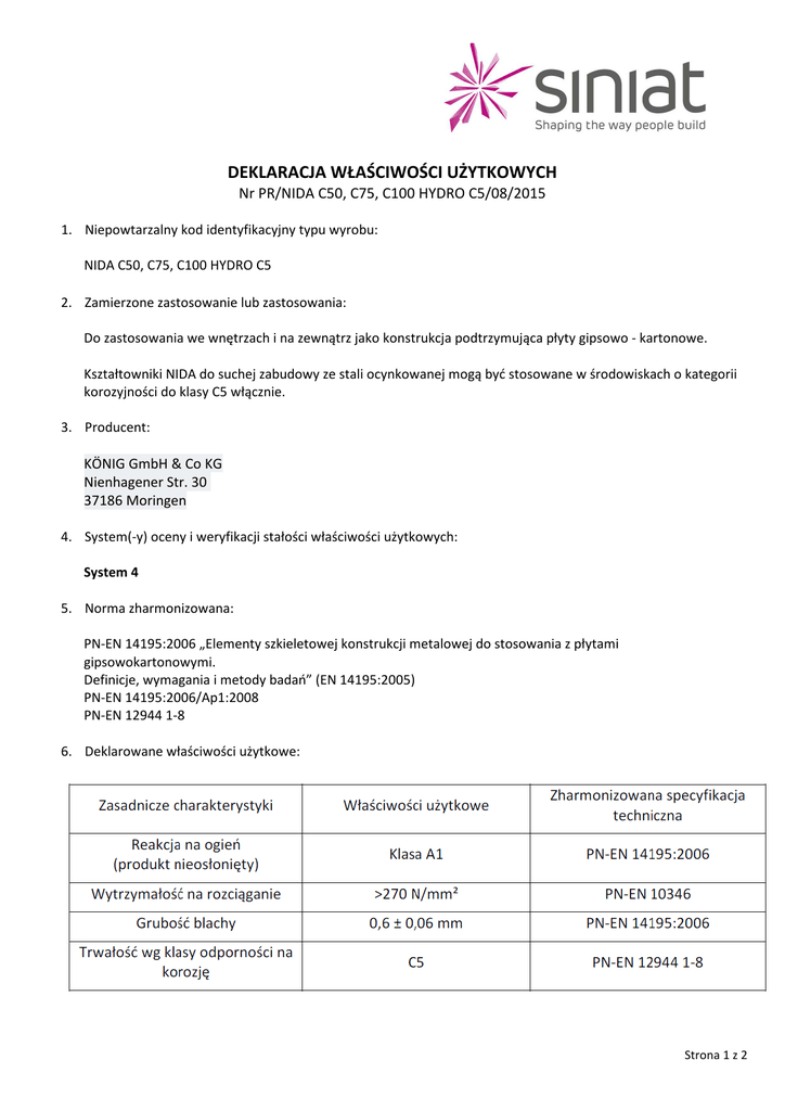DEKLARACJA WŁAŚCIWOŚCI UŻYTKOWYCH Nr PR/NIDA C50, C75, C100 HYDRO C5/08/2015 1. Niepowtarzalny kod identyfikacyjny typu wyrobu: NIDA C50, C75, C100 HYDRO C5 2. Zamierzone zastosowanie lub zastosowania: Do zastosowania we wnętrzach i na zewnątrz jako konstrukcja podtrzymująca płyty gipsowo - kartonowe. Kształtowniki NIDA do suchej zabudowy ze stali ocynkowanej mogą być stosowane w środowiskach o kategorii korozyjności do klasy C5 włącznie. 3. Producent: KÖNIG GmbH & Co KG Nienhagener Str. 30 37186 Moringen 4. System(-y) oceny i weryfikacji stałości właściwości użytkowych: System 4 5. Norma zharmonizowana: PN-EN 14195:2006 „Elementy szkieletowej konstrukcji metalowej do stosowania z płytami gipsowokartonowymi. Definicje, wymagania i metody badań” (EN 14195:2005) PN-EN 14195:2006/Ap1:2008 PN-EN 12944 1-8 6. Deklarowane właściwości użytkowe: Strona 1 z 2 Właściwości użytkowe określone powyżej wyrobu są zgodne z zestawem deklarowanych właściwości użytkowych. Niniejsza deklaracja właściwości użytkowych wydana zostaje zgodnie z rozporządzeniem (UE) nr 305/2011 na wyłączną odpowiedzialność producenta określonego powyżej. W imieniu producenta podpisał: Maciej Januszewski KIEROWNIK PRODUKTU ……………………………………………………………… (nazwisko i stanowisko) Warszawa, 31.08.2015 ……………………………………. (miejsce i data wydania) ……….……………………. (podpis) Strona 2 z 2