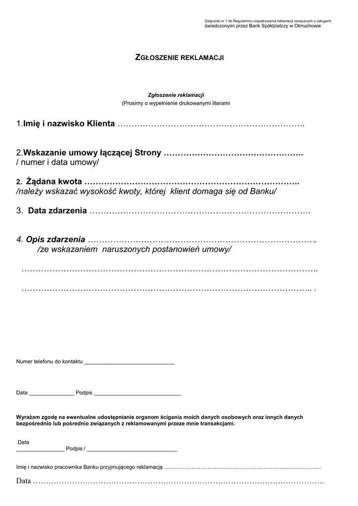 Załącznik nr 1 do Regulaminu rozpatrywania reklamacji związanych z usługami świadczonymi przez Bank Spółdzielczy w Otmuchowie ZGŁOSZENIE REKLAMACJI Zgłoszenie reklamacji (Prosimy o wypełnienie drukowanymi literami 1.Imię i nazwisko Klienta …………………………………………………………. 2.Wskazanie umowy łączącej Strony ………………………………………….. / numer i data umowy/ 2. Żądana kwota ………………………………………………………………….. /należy wskazać wysokość kwoty, której klient domaga się od Banku/ 3. Data zdarzenia ……………………………………………………………………. 4. Opis zdarzenia ………………………………………………………………………. /ze wskazaniem naruszonych postanowień umowy/ ……………………………………………………………………………………………. ………………………………………………………………………………………….. . Numer telefonu do kontaktu ______________________________ Data _______________ Podpis _____________________________ Wyrażam zgodę na ewentualne udostępnianie organom ścigania moich danych osobowych oraz innych danych bezpośrednio lub pośrednio związanych z reklamowanymi przeze mnie transakcjami. Data ________________ Podpis / ______________________________ Imię i nazwisko pracownika Banku przyjmującego reklamację …………………………………………………………………………… Data ………………………………………………………………………………………………….