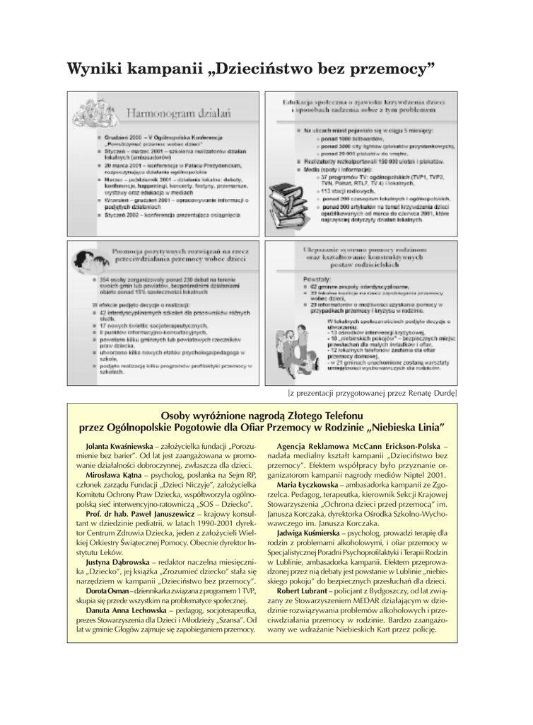 Wyniki kampanii Dzieciñstwo bez przemocy [z prezentacji przygotowanej przez Renatê Durdê] Osoby wyró¿nione nagrod¹ Z³otego Telefonu przez Ogólnopolskie Pogotowie dla Ofiar Przemocy w Rodzinie Niebieska Linia Jolanta Kwaniewska za³o¿ycielka fundacji Porozumienie bez barier. Od lat jest zaanga¿owana w promowanie dzia³alnoci dobroczynnej, zw³aszcza dla dzieci. Miros³awa K¹tna psycholog, pos³anka na Sejm RP, cz³onek zarz¹du Fundacji Dzieci Niczyje, za³o¿ycielka Komitetu Ochrony Praw Dziecka, wspó³tworzy³a ogólnopolsk¹ sieæ interwencyjno-ratownicz¹ SOS Dziecko. Prof. dr hab. Pawe³ Januszewicz krajowy konsultant w dziedzinie pediatrii, w latach 1990-2001 dyrektor Centrum Zdrowia Dziecka, jeden z za³o¿ycieli Wielkiej Orkiestry wi¹tecznej Pomocy. Obecnie dyrektor Instytutu Leków. Justyna D¹browska redaktor naczelna miesiêcznika Dziecko, jej ksi¹¿ka Zrozumieæ dziecko sta³a siê narzêdziem w kampanii Dzieciñstwo bez przemocy. Dorota Osman dziennikarka zwi¹zana z programem 1 TVP., skupia siê przede wszystkim na problematyce spo³ecznej. Danuta Anna Lechowska pedagog, socjoterapeutka, prezes Stowarzyszenia dla Dzieci i M³odzie¿y Szansa. Od lat w gminie G³ogów zajmuje siê zapobieganiem przemocy. Agencja Reklamowa McCann Erickson-Polska nada³a medialny kszta³t kampanii Dzieciñstwo bez przemocy. Efektem wspó³pracy by³o przyznanie organizatorom kampanii nagrody mediów Niptel 2001. Maria £yczkowska ambasadorka kampanii ze Zgorzelca. Pedagog, terapeutka, kierownik Sekcji Krajowej Stowarzyszenia Ochrona dzieci przed przemoc¹ im. Janusza Korczaka, dyrektorka Orodka Szkolno-Wychowawczego im. Janusza Korczaka. Jadwiga Kumierska psycholog, prowadzi terapiê dla rodzin z problemami alkoholowymi, i ofiar przemocy w Specjalistycznej Poradni Psychoprofilaktyki i Terapii Rodzin w Lublinie, ambasadorka kampanii. Efektem przeprowadzonej przez ni¹ debaty jest powstanie w Lublinie niebieskiego pokoju do bezpiecznych przes³uchañ dla dzieci. Robert Lubrant policjant z Bydgoszczy, od lat zwi¹zany ze Stowarzyszeniem MEDAR dzia³aj¹cym w dziedzinie rozwi¹zywania problemów alkoholowych i przeciwdzia³ania przemocy w rodzinie. Bardzo zaanga¿owany we wdra¿anie Niebieskich Kart przez policjê. O kampanii w Pa³acu Prezydenckim Podsumowaniu kampanii Dzieciñstwo bez przemocy powiêcone by³o kolejne spotkanie jej ambasadorów i przedstawicieli spo³ecznoci lokalnych w Pa³acu Prezydenckim 31 stycznia 2002 roku. Rozpoczê³o je wrêczenie dziesiêciu Z³otych Telefonów dorocznej nagrody dla najbardziej zaanga¿owanych w przeciwdzia³anie przemocy wobec dzieci. Jako pierwsza Z³oty Telefon otrzyma³a Jolanta Kwaniewska, która zapowiedzia³a, ¿e nadal bêdziemy siê tu spotykaæ, dopóki bêdziemy gospodarzami tego miejsca. W swoim wyst¹pieniu pos³anka Barbara Labuda otwiera spotkanie. Od lewej siedz¹: Jolanta KwaniewAnna Bañkowska z³o¿y³a propozy- ska, Jerzy Mellibruda, Renata Durda, Monika Sajkowska cjê wspó³pracy z Sejmow¹ Komisj¹ Polityki Spo³ecznej i Rodziny, której jest nii to cz³onkowie porozumienia. Monika Sajprzewodnicz¹c¹. kowska przedstawi³a badania OBOP, zlecoPoinformowa³a ne przez organizatorów kampanii, na temat te¿, ¿e utworzono oceny spo³ecznej i widocznoci kampanii: 75% sta³¹ podkomisjê Polaków powy¿ej 15 lat zauwa¿y³o kampazajmuj¹c¹ siê niê, a 95% z nich uzna³o, ¿e by³a potrzebna. Ambasadorki Danuta Lechowska z G³ogowa, sprawami dzieci, któr¹ kieruje Mi- Maria £yczkowska ze Zgorzelca oraz Jadwiga Kumierska z Lublina podkrela³y praktyczne ros³awa K¹tna. Wicedyrektor skutki kampanii, jak powstanie domu samotPARPA, Renata nej matki, nowe wietlice i schroniska, warszDurda przedsta- taty dla nauczycieli i rodziców. W obszernym wi³a podsumo- podsumowaniu Jerzy Mellibruda zada³ zasadwanie kampanii: nicze pytanie: Czy autorytety spo³eczne oraz nie jest to jej za- media i politycy zrozumiej¹, ¿e przeciwdzia³aJolanta Kwaniewska koñczenie, lecz nie krzywdzeniu dzieci jest fundamentem zdroodbiera Z³oty Telefon pewien etap, bo- wia publicznego i rozwoju spo³ecznego? (ad) wiem debaty lokalne trwaj¹ na- Laureatki Z³otego Telefonu wspólne zdjêcie z Jerzym Mellibrud¹ i Ludal. W kampaniê zaanga¿owa³o isem Alarconem siê setki osób i instytucji: 572 osoby po przeszkoleniu zosta³y ambasadorami kampanii, do koalicji na jej rzecz przyst¹pi³o 262 osoby i 585 instytucji, w tym 73 powiatowe centra pomocy rodzinie, 62 gminne komisje rozwi¹zywania problemów alkoholowych, 95 szkó³ ró¿nych szczebli. Luis Alarcon przypomnia³ o roli Ogólnopolskiego Porozumienia Niebieska Linia: jest to ju¿ ruch spo³eczny ponad 2000 osób i 1000 instytucji, a po³owa aktywnych uczestników kampa-