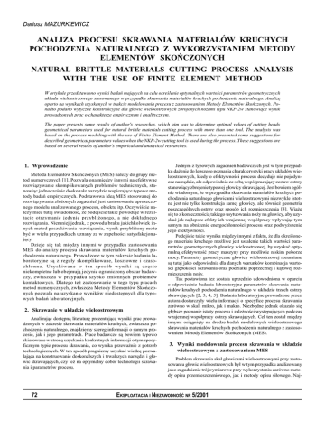 Dariusz MAZURKIEWICZ ANALIZA PROCESU SKRAWANIA MATERIA£ÓW KRUCHYCH POCHODZENIA NATURALNEGO Z WYKORZYSTANIEM METODY ELEMENTÓW SKOÑCZONYCH NATURAL BRITTLE MATERIALS CUTTING PROCESS ANALYSIS WITH THE USE OF FINITE ELEMENT METHOD W artykule przedstawiono wyniki badañ maj¹cych na celu okrelenie optymalnych wartoci parametrów geometrycznych uk³adu wieloostrzowego stosowanego w przypadku skrawania materia³ów kruchych pochodzenia naturalnego. Analizê oparto na wynikach uzyskanych w trakcie modelowania procesu z zastosowaniem Metody Elementów Skoñczonych. Ponadto podano wytyczne konstrukcyjne dla g³owic wieloostrzowych zbrojonych no¿ami typu NKP-2w stanowi¹ce wynik prowadzonych prac o charakterze empirycznym i analitycznym. The paper presents some results of author's researches, which aim was to determine optimal values of cutting heads geometrical parameters used for natural brittle materials cutting process with more than one tool. The analysis was based on the process modeling with the use of Finite Element Method. There are also presented some suggestions for described geometrical parameters values when the NKP-2w cutting tool is used during the process. These suggestions are based on several results of author's empirical and analytical researches. 1. Wprowadzenie Metoda Elementów Skoñczonych (MES) nale¿y do grupy metod numerycznych [1]. Pozwala ona miêdzy innymi na efektywne rozwi¹zywanie skomplikowanych problemów technicznych, stanowi¹c jednoczenie doskona³e narzêdzie wspieraj¹ce typowe metody badañ empirycznych. Podstawowa ide¹ MES stosowanej do rozwi¹zywania z³o¿onych zagadnieñ jest zastosowanie uproszczonego modelu analizowanego procesu, obiektu itp. Oczywicie nale¿y mieæ tutaj wiadomoæ, ¿e podejcie takie powoduje w rezultacie otrzymanie jedynie przybli¿onego, a nie dok³adnego rozwi¹zania. Niemniej jednak, z powodu braku jakichkolwiek innych metod poszukiwania rozwi¹zania, wynik przybli¿ony mo¿e byæ w wielu przypadkach uznany za w zupe³noci satysfakcjonuj¹cy. Dzieje siê tak miêdzy innymi w przypadku zastosowania MES do analizy procesu skrawania materia³ów kruchych pochodzenia naturalnego. Prowadzone w tym zakresie badania laboratoryjne s¹ z regu³y skomplikowane, kosztowne i czasoch³onne. Uzyskiwane w ten sposób wyniki s¹ czêsto niekompletne lub obejmuj¹ jedynie ograniczony obszar badawczy, zw³aszcza w przypadku szybko zmiennych problemów kontaktowych. Dlatego te¿ zastosowanie w tego typu pracach metod numerycznych, zw³aszcza Metody Elementów Skoñczonych pozwala na uzyskanie wyników niedostêpnych dla typowych badañ laboratoryjnych. 2. Skrawanie w uk³adzie wieloostrzowym Analizuj¹c dostêpn¹ literaturê prezentuj¹c¹ wyniki prac prowadzonych w zakresie skrawania materia³ów kruchych, zw³aszcza pochodzenia naturalnego, znajdziemy szereg informacji o samym procesie, jak i jego parametrach. Prace badawcze s¹ bowiem typowo skierowane w stronê uzyskania konkretnych informacji o tym specyficznym typie procesu skrawania, co wynika przewa¿nie z potrzeb technologicznych. W ten sposób pragniemy uzyskaæ wiedzê pozwalaj¹ca na konstruowanie doskonalszych i trwalszych narzêdzi i g³owic skrawaj¹cych, czy te¿ na optymalny dobór technologii skrawania i parametrów procesu. 72 Jednym z typowych zagadnieñ badawczych jest w tym przypadku d¹¿enie do lepszego poznania charakterystyki pracy uk³adów wieloostrzowych, kiedy o efektywnoci procesu decyduje nie pojedyncze narzêdzie, ale odpowiednio ze sob¹ wspó³pracuj¹cy zestaw ostrzy stanowi¹cy zbrojenie typowej g³owicy skrawaj¹cej. Jest bowiem ogólnie wiadomym, ¿e w przypadku skrawania materia³ów kruchych pochodzenia naturalnego g³owicami wieloostrzowymi niezwykle istotna jest nie tylko konstrukcja samej g³owicy, ale równie¿ geometria poszczególnych ostrzy oraz sposób ich rozmieszczenia [3]. Wi¹¿ê siê to z koniecznoci¹ takiego usytuowania no¿y na g³owicy, aby uzyskaæ jak najlepsze efekty ich wzajemnej wspó³pracy wp³ywaj¹c tym samym na obni¿enie energoch³onnoci procesu oraz podwy¿szenie jego efektywnoci. Podejcie takie wynika miêdzy innymi z faktu, ¿e dla okrelonego materia³u kruchego mo¿liwe jest ustalenie takich wartoci parametrów geometrycznych g³owicy wieloostrzowej, by uzyskaæ optymaln¹ efektywnoæ pracy maszyny przy mo¿liwie niskim poborze mocy. Parametry geometryczne g³owicy wieloostrzowej rozumiane s¹ tutaj jako odpowiednia dla danych warunków kombinacja wartoci g³êbokoci skrawania oraz podzia³ki poprzecznej i k¹towej rozmieszczenia no¿y. Tak postawiona tez zosta³a uprzednio udowodniona w oparciu o odpowiednie badania laboratoryjne parametrów skrawania materia³ów kruchych pochodzenia naturalnego w uk³adzie trzech ostrzy skrawaj¹cych [2, 3, 4, 5]. Badania laboratoryjne prowadzone przez autora dostarczy³y wielu informacji o specyfice procesu skrawania zarówno w skali mikro, jak i makro. Niezbêdne jednak okaza³o siê g³êbsze poznanie istoty procesu i zale¿noci wystêpuj¹cych podczas wzajemnej wspó³pracy ostrzy skrawaj¹cych. Cel ten zosta³ miêdzy innymi osi¹gniêty na drodze badañ modelowych wieloostrzowego skrawania materia³ów kruchych pochodzenia naturalnego z zastosowaniem Metody Elementów Skoñczonych (MES). 3. Wyniki modelowania procesu skrawania w uk³adzie wieloostrzowym z zastosowaniem MES Problem skrawania ska³ g³owicami wieloostrzowymi przy zastosowaniu g³owic wieloostrzowych by³ w tym przypadku analizowany jako zagadnienie trójwymiarowe przy wykorzystaniu zarówno metody opisu przemieszczeniowego, jak i metody opisu si³owego. Naj- EKSPLOATACJA I NIEZAWODNOÆ NR 5/2001 NAUKA I TECHNIKA lepsze wyniki, to jest najbli¿sze warunkom rzeczywistym uzyskano w przypadku zastosowania do analizy metody przemieszczeniowej. Dla danego przypadku zarówno materia³ narzêdzia, jak i skrawanej ska³y zosta³y przyjête jako liniowe. Modelowanie rozpoczêto od analizy zagadnienia dla przypadku skrawania 