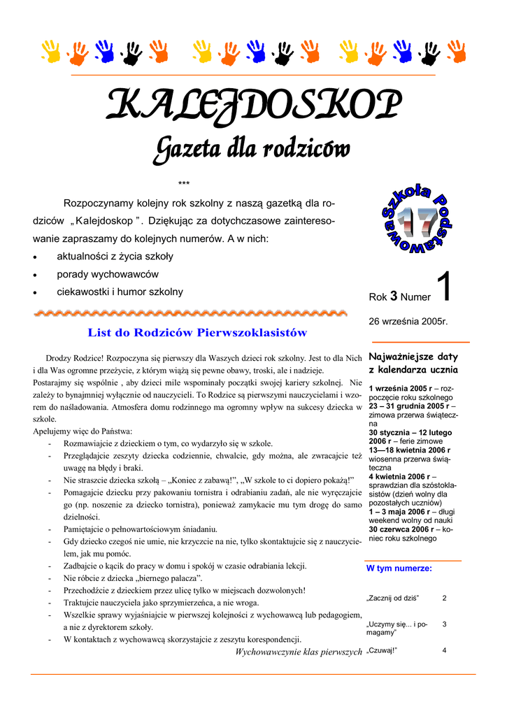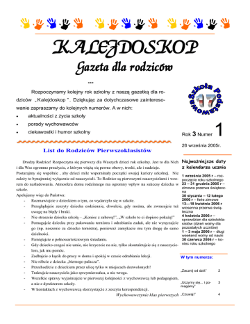 KALEJDOSKOP Gazeta dla rodziców *** Rozpoczynamy kolejny rok szkolny z naszą gazetką dla rodziców „ Kalejdoskop ” . Dziękując za dotychczasowe zainteresowanie zapraszamy do kolejnych numerów. A w nich: aktualności z życia szkoły porady wychowawców ciekawostki i humor szkolny Rok 3 Numer List do Rodziców Pierwszoklasistów Drodzy Rodzice! Rozpoczyna się pierwszy dla Waszych dzieci rok szkolny. Jest to dla Nich i dla Was ogromne przeżycie, z którym wiążą się pewne obawy, troski, ale i nadzieje. Postarajmy się wspólnie , aby dzieci mile wspominały początki swojej kariery szkolnej. Nie zależy to bynajmniej wyłącznie od nauczycieli. To Rodzice są pierwszymi nauczycielami i wzorem do naśladowania. Atmosfera domu rodzinnego ma ogromny wpływ na sukcesy dziecka w szkole. Apelujemy więc do Państwa: - Rozmawiajcie z dzieckiem o tym, co wydarzyło się w szkole. - Przeglądajcie zeszyty dziecka codziennie, chwalcie, gdy można, ale zwracajcie też uwagę na błędy i braki. - Nie straszcie dziecka szkołą – „Koniec z zabawą!”, „W szkole to ci dopiero pokażą!” - Pomagajcie dziecku przy pakowaniu tornistra i odrabianiu zadań, ale nie wyręczajcie go (np. noszenie za dziecko tornistra), ponieważ zamykacie mu tym drogę do samo dzielności. - Pamiętajcie o pełnowartościowym śniadaniu. - Gdy dziecko czegoś nie umie, nie krzyczcie na nie, tylko skontaktujcie się z nauczycielem, jak mu pomóc. - Zadbajcie o kącik do pracy w domu i spokój w czasie odrabiania lekcji. - Nie róbcie z dziecka „biernego palacza”. - Przechodźcie z dzieckiem przez ulicę tylko w miejscach dozwolonych! - Traktujcie nauczyciela jako sprzymierzeńca, a nie wroga. - Wszelkie sprawy wyjaśniajcie w pierwszej kolejności z wychowawcą lub pedagogiem, a nie z dyrektorem szkoły. - W kontaktach z wychowawcą skorzystajcie z zeszytu korespondencji. Wychowawczynie klas pierwszych 1 26 września 2005r. Najważniejsze daty z kalendarza ucznia 1 września 2005 r – rozpoczęcie roku szkolnego 23 – 31 grudnia 2005 r – zimowa przerwa świąteczna 30 stycznia – 12 lutego 2006 r – ferie zimowe 13—18 kwietnia 2006 r wiosenna przerwa świąteczna 4 kwietnia 2006 r – sprawdzian dla szóstoklasistów (dzień wolny dla pozostałych uczniów) 1 – 3 maja 2006 r – długi weekend wolny od nauki 30 czerwca 2006 r – koniec roku szkolnego W tym numerze: „Zacznij od dziś” 2 „Uczymy się... i pomagamy” 3 „Czuwaj!” 4 Zacznij od dziś… . Anna Kubeczko to cenna wiedza o tym, jaki jest punkt startu ucznia, którego mają dalej kształcić. Ten obowiązkowy sprawdzian ten nie ma żadnego wpływu na przyjęcie szóstoklasisty do rejonowe- Rozpoczynający się rok szkolny jest zapewne szczególnie ważny dla szóstoklasistów i ich rodziców z powodu czekającego ich 4 kwietnia 2006 r. Sprawdzianu. go gimnazjum. Nieco inaczej sprawa wygląda, gdy wybiera się on do szkoły poza swoim rejonem zamieszkania lub też chce się uczyć w renomowanym gimnazjum niepublicznym. W takiej sytuacji wynik sprawdzianu może być podczas re- Sprawdzian szóstoklasistów to ważny egzamin. Dla- krutacji brany pod uwagę. czego? Bo jest pierwszym z serii trzech egzaminów zewnętrznych, z którymi muszą zmierzyć się wszyscy uczniowie, kończąc kolejne etapy swojej edukacji szkolnej. Pierwszym jest właśnie egzamin na koniec szkoły podstawowej nazywany oficjalnie sprawdzianem dla szóstoklasistów, następnym - egzamin gimnazjalny, a ostatnim - maturalny. Egzaminy te określa się mianem zewnętrznych, gdyż obowiązują tutaj pewne rygory. Testy układa w tej samej wersji dla wszystkich szkół w Polsce Centralna Komisja Egzaminacyjna, sprawdzają je nauczyciele - egzaminatorzy, nie znający uczniów, ponieważ prace są kodowane. Wiedzę i umiejętności wymagane na sprawdzianie uczniowie zdobywają w ciągu sześciu lat nauki w szkole podstawowej. Niewątpliwie jednak ostatnie miesiące przed sprawdzianem to czas na ich usystematyzowanie i uświadomienie sobie ewentualnych braków. Wychodząc naprzeciw tym potrzebom, jako egzaminator i nauczyciel matematyki zaproponowałam uczniom klas szóstych dodatkowe zajęcia przygotowujące ich do tego pierwszego ważnego egzaminu. Zajęcia dla wszystkich chętnych odbywać się będą od września do kwietnia. Będą miały charakter ćwiczeniowo-testowy i doskonalić będą umiejętności matematyczne uczniów w za- Sprawdzian jest testem interdyscyplinarnym i ma badać umiejętności uczniów zarówno z przedmiotów humanistycznych jak i matematyczno - przyrodniczych. Szóstoklasiści inaczej więc niż ich starsi koledzy - gimnazjaliści piszą nie dwa, a jeden test ogólny, bez podziału na bloki przedmio- kresie tzw. standardów: czytania, pisania, rozumowania, korzystania z informacji i wykorzystywania wiedzy w praktyce. Te dodatkowe spotkania z matematyką pozwolą szóstoklasistom systematycznie utrwalać wiedzę, nadrobić istniejące zaległości, wzmocnić ich wiarę we własne możliwości. towe. Sprawdzian składa się z reguły z 25 pytań - 20 jest zamkniętych a 5 otwartych. Pytania zamknięte są wielokrotnego wyboru, wymagają zakreślenia jednej z kilku podanych możliwości, zaś w pytaniach otwartych należy samemu udzielić Ci, którzy posłuchają wskazówki „zacznij od dziś” mogą bez obaw myśleć o kwietniowym sprawdzianie. Tego życzę uczniom i ich rodzicom. odpowiedzi. Tematyka sprawdzianu skupiona jest wokół jednego tematu przewodniego np. "W górach", "Sport", "Chleb", "Kwiaty". Za poprawne rozwiązanie całego testu można otrzymać maksymalnie 40 pkt.- 20 za pytania zamknięte i 20 za otwarte. Wyniki sprawdzianu mają być dla nauczycieli ze szkoły podstawowej przede wszystkim informacją, czy ich metody uczenia są dobre. Dla nauczycieli gimnazjalnych zaś Str. 2 KALEJDOSKOP Uczymy się … i pomagamy. Ewa Czernecka- Kucz Zebrane dary zostały przekazane dzieciom Uczniowie naszej szkoły od wielu la