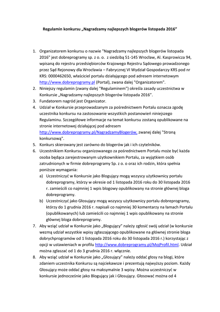 Regulamin konkursu „Nagradzamy najlepszych blogerów listopada 2016” 1. Organizatorem konkursu o nazwie "Nagradzamy najlepszych blogerów listopada 2016" jest dobreprogramy sp. z o. o. z siedzibą 51-145 Wrocław, Al. Kasprowicza 94, wpisaną do rejestru przedsiębiorców Krajowego Rejestru Sądowego prowadzonego przez Sąd Rejonowy dla Wrocławia – Fabrycznej VI Wydział Gospodarczy KRS pod nr KRS: 0000462650, właściciel portalu działającego pod adresem internetowym http://www.dobreprogramy.pl (Portal), zwana dalej "Organizatorem". 2. Niniejszy regulamin (zwany dalej "Regulaminem") określa zasady uczestnictwa w Konkursie „Nagradzamy najlepszych blogerów listopada 2016”. 3. Fundatorem nagród jest Organizator. 4. Udział w Konkursie przeprowadzanym za pośrednictwem Portalu oznacza zgodę uczestnika konkursu na zastosowanie wszystkich postanowień niniejszego Regulaminu. Szczegółowe informacje na temat konkursu zostaną opublikowane na stronie internetowej działającej pod adresem http://www.dobreprogramy.pl/NagradzamyBlogerów, zwanej dalej "Stroną konkursową". 5. Konkurs skierowany jest zarówno do blogerów jak i ich czytelników. 6. Uczestnikiem Konkursu organizowanego za pośrednictwem Portalu może być każda osoba będąca zarejestrowanym użytkownikiem Portalu, za wyjątkiem osób zatrudnionych w firmie dobreprogramy Sp. z o. o oraz ich rodzin, która spełnia poniższe wymagania: a) Uczestniczyć w Konkursie jako Blogujący mogą wszyscy użytkownicy portalu dobreprogramy, którzy w okresie od 1 listopada 2016 roku do 30 listopada 2016 r. zamieścili co najmniej 1 wpis blogowy opublikowany na stronie głównej bloga dobreprogramy. b) Uczestniczyć jako Głosujący mogą wszyscy użytkownicy portalu dobreprogramy, którzy do 1 grudnia 2016 r. napisali co najmniej 30 komentarzy na łamach Portalu (opublikowanych) lub zamieścili co najmniej 1 wpis opublikowany na stronie głównej bloga dobreprogramy. 7. Aby wziąć udział w Konkursie jako „Blogujący” należy zgłosić swój udział (w konkursie wezmą udział wszystkie wpisy zgłaszającego opublikowane na głównej stronie bloga dobrychprogramów od 1 listopada 2016 roku do 30 listopada 2016 r.) korzystając z opcji w ustawieniach w profilu http://www.dobreprogramy.pl/MojProfil.html. Udział można zgłaszać od 1 do 3 grudnia 2016 r. włącznie. 8. Aby wziąć udział w Konkursie jako „Głosujący” należy oddać głosy na blogi, które zdaniem uczestnika Konkursu są najciekawsze i prezentują najwyższy poziom. Każdy Głosujący może oddać głosy na maksymalnie 3 wpisy. Można uczestniczyć w konkursie jednocześnie jako Blogujący jak i Głosujący. Głosować można od 4 listopada do 10 grudnia 2016 roku, lista ze zgłoszonymi wpisami dostępna będzie z poziomu strony konkursowej. Głosujący nie może oddawać głosów na własne wpisy. 9. Głosujący będą typować 10 najlepszych wpisów – decydować będzie liczba oddanych głosów na wpisy. Z wybranych 10 najlepszych wpisów redakcja Portalu wybierać będzie pięć najlepszych, których autorzy otrzymają nagrody główne. 10. Autor wpisu może zostać nagrodzony tylko raz, jeśli więcej niż jeden wpis znajdzie się w wytypowanej przez Głosujących dziesiątce, do piątki nagrodzonych wytypowany może zostać tylko jeden. 11. Pośród Głosujących na wpisy, które zostały wybrane do „10” najlepszych, zostaną rozlosowane dwie nagrody w postaci kurtek dobreprogramy lub zestawu innych gadżetów. Aby Głosujący brał udział w losowaniu nagród wystarczy, że choćby jeden z głosów oddanych na wpisy został oddany na wpis wytypowany do „10” najlepszych. 12. Jeśli wylosowany zostanie Głosujący, który zostanie nagrodzony za swój wpis, zamiast niego zostanie dolosowany kolejny Głosujący. 13. Zwycięzcy nagród głównych będą mogli wybrać dowolną, jedną nagrodę z puli: a) dysk twardy SSD Crucial MX300 525GB 2.5" SATA; b) myszka Razer DeathAdder Elite; c) karta graficzna GIGABYTE RADEON RX 460 4GB; d) router TP-LINK Archer MR200; e) zestaw klocków Jimu mini: Zestaw dla początkujących; Zwycięzcy nagród głównych otrzymają oprócz wybranej nagrody pamiątkowy dyplom. 14. Pula nagród głównych może ulec zmianie, w zależności od dostępności produktów na rynku, zmian cen itp. 15. Wartość nagrody głównej nie przekracza kwot objętych zwolnieniem przedmiotowym od podatku dochodowego od osób fizycznych zgodnie z postanowieniami art. 21 ust. 1 pkt 68 ustawy o podatku dochodowym od osób fizycznych z dnia 26 lipca 1991 (Dz. U. 1991 Nr 80 poz. 350). 16. Nagrody dodatkowe to zestawy drobnych upominków od redakcji Portalu. 17. Nagrody nie podlegają zamianie na ich równowartość pieniężną. 18. Rozstrzygnięcie konkursu nastąpi do 15 grudnia 2016 r., a lista zwycięzców zostanie opublikowana na stronie konkursowej. 19. Nagrody zostaną przesłane na koszt Organizatora, w ciągu 4 tygodni od ogłoszenia zwycięzców. 20. Redakcja Portalu będzie kontaktować się ze zwycięzcami pocztą elektroniczną, wykorzystując adresy e-mail z profili użytkowników w celu ustalenia danych niezbędnych do przekazania nagrody. 21. W przypadku braku odpowiedzi przez 14 dni nagroda ulega przepadkowi. 22. W przypadku stwierdzenia plagiatu nagroda nie zostanie przyznana. 23. Wzięcie udziału w Konkursie równoznaczne jest, w przypadku otrzymania nagrody, ze zgodą na opublikowanie imienia i nazwiska oraz miejscowości zamieszkania uczestnika na stronach Portalu. 24. Organizator Konkursu zastrzega sobie prawo zmiany postanowień niniejszego Regulaminu w okresie trwania konkursu, poprzez zamieszczenie uaktualnionego tekstu Regulaminu na Stronie konkursowej. 25. Organizator Konkursu zastrzega sobie prawo do wykluczenia uczestnika z Konkursu bez podania przyczyny. 26. Wszelkie spory mogące wyniknąć między Organizatorem Konkursu a jego uczestnikami będą rozpatrywane przez właściwy sąd powszechny dla siedzi