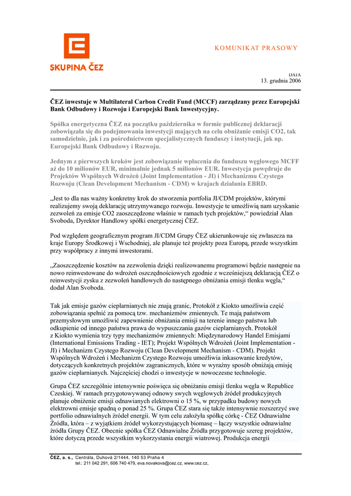 KO M UN I K AT P R AS O W Y DATA 13. grudnia 2006 ČEZ inwestuje w Multilateral Carbon Credit Fund (MCCF) zarządzany przez Europejski Bank Odbudowy i Rozwoju i Europejski Bank Inwestycyjny. Spółka energetyczna ČEZ na początku października w formie publicznej deklaracji zobowiązała się do podejmowania inwestycji mających na celu obniżanie emisji CO2, tak samodzielnie, jak i za pośrednictwem specjalistycznych funduszy i instytucji, jak np. Europejski Bank Odbudowy i Rozwoju. Jednym z pierwszych kroków jest zobowiązanie wpłacenia do funduszu węglowego MCFF aż do 10 milionów EUR, minimalnie jednak 5 milionów EUR. Inwestycja powędruje do Projektów Wspólnych Wdrożeń (Joint Implementation - JI) i Mechanizmu Czystego Rozwoju (Clean Development Mechanism - CDM) w krajach działania EBRD. „Jest to dla nas ważny konkretny krok do stworzenia portfolia JI/CDM projektów, którymi realizujemy swoją deklarację utrzymywanego rozwoju. Inwestycje te umożliwią nam uzyskanie zezwoleń za emisje CO2 zaoszczędzone właśnie w ramach tych projektów,“ powiedział Alan Svoboda, Dyrektor Handlowy spółki energetycznej ČEZ. Pod względem geograficznym program JI/CDM Grupy ČEZ ukierunkowuje się zwłaszcza na kraje Europy Środkowej i Wschodniej, ale planuje też projekty poza Europą, przede wszystkim przy współpracy z innymi inwestorami. „Zaoszczędzenie kosztów na zezwolenia dzięki realizowanemu programowi będzie następnie na nowo reinwestowane do wdrożeń oszczędnościowych zgodnie z wcześniejszą deklaracją ČEZ o reinwestycji zysku z zezwoleń handlowych do następnego obniżania emisji tlenku węgla,“ dodał Alan Svoboda. Tak jak emisje gazów cieplarnianych nie znają granic, Protokół z Kiokto umożliwia część zobowiązania spełnić za pomocą tzw. mechanizmów zmiennych. Te mają państwom przemysłowym umożliwić zapewnienie obniżania emisji na terenie innego państwa lub odkupienie od innego państwa prawa do wypuszczania gazów cieplarnianych. Protokół z Kiokto wymienia trzy typy mechanizmów zmiennych: Międzynarodowy Handel Emisjami (International Emissions Trading - IET); Projekt Wspólnych Wdrożeń (Joint Implementation JI) i Mechanizm Czystego Rozwoju (Clean Development Mechanism - CDM). Projekt Wspólnych Wdrożeń i Mechanizm Czystego Rozwoju umożliwia inkasowanie kredytów, dotyczących konkretnych projektów zagranicznych, które w wyraźny sposób obniżają emisję gazów cieplarnianych. Najczęściej chodzi o inwestycje w nowoczesne technologie. Grupa ČEZ szczególnie intensywnie poświęca się obniżaniu emisji tlenku węgla w Republice Czeskiej. W ramach przygotowywanej odnowy swych węglowych źródeł produkcyjnych planuje obniżenie emisji odnawianych elektrowni o 15 %, w przypadku budowy nowych elektrowni emisje spadną o ponad 25 %. Grupa ČEZ stara się także intensywnie rozszerzyć swe portfolio odnawialnych źródeł energii. W tym celu założyła spółkę córkę - ČEZ Odnawialne Źródła, która – z wyjątkiem źródeł wykorzystujących biomasę – łączy wszystkie odnawialne źródła Grupy ČEZ. Obecnie spółka ČEZ Odnawialne Źródła przygotowuje szereg projektów, które dotyczą przede wszystkim wykorzystania energii wiatrowej. Produkcja energii ČEZ, a. s., Centrála, Duhová 2/1444, 140 53 Praha 4 tel.: 211 042 291, 606 740 479, [email protected], www.cez.cz, z odnawialnych źródeł energii spółki ČEZ przy tym w 2005 roku osiągnęła 1,45 TWh i międzyrocznie wzrosła w ten sposób o 19 %. W ramach publicznej deklaracji utrzymywanego rozwoju, spółka ČEZ między innymi zobowiązała się do reinwestowania zysku ze sprzedaży zaoszczędzonych zezwoleń do wdrożeń prowadzących do obniżania intensywności emisji gazów cieplarnianych, w ramach systemu EU ETS. Będzie chodziło zwłaszcza o rozwój odnawialnych źródeł energii czy aktywny udział w europejskich programach badań i rozwoju technologii do obniżania emisji. Jednocześnie będą inwestowane środki w praktyczne wprowadzanie najnowocześniejszych technologii do obniżania emisji gazów cieplarnianych. Eva Nováková Rzecznik prasowy ČEZ, a. s.