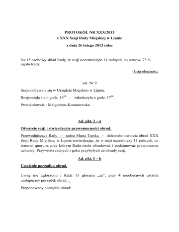 PROTOKÓŁ NR XXX/2013 z XXX Sesji Rady Miejskiej w Lipnie z dnia 26 lutego 2013 roku Na 15 osobowy skład Rady, w sesji uczestniczyło 11 radnych, co stanowi 73 % ogółu Rady. - lista obecności zał. Nr 9 Sesja odbywała się w Urzędzie Miejskim w Lipnie. Rozpoczęła się o godz. 1400 – zakończyła o godz. 1730. Protokołowała : Małgorzata Komorowska Ad. pkt. I – a Otwarcie sesji i stwierdzenie prawomocności obrad. Przewodnicząca Rady – radna Maria Turska – dokonała otwarcia obrad XXX Sesji Rady Miejskiej w Lipnie stwierdzając, Ŝe w sesji uczestniczy 11 radnych, co stanowi quorum, przy którym Rada moŜe obradować i podejmować prawomocne uchwały. Przywitała radnych i gości przybyłych na obrady sesji. Ad. pkt. I – b Ustalenie porządku obrad. Uwag nie zgłoszono i Rada 11 głosami „za”, przy 4 nieobecnych ustaliła następujący porządek obrad : Proponowany porządek obrad: I. Sprawy organizacyjne. a) otwarcie sesji i stwierdzenie prawomocności obrad, b) ustalenie porządku obrad, c) powołanie Komisji Uchwał i Wniosków, d) powołanie sekretarza obrad, e) przyjęcie protokołu z XXIX sesji RM. f) informacja z wykonania wniosków i interpelacji zgłoszonych na XXIX sesji. II. III. IV. Prezentacja Przedsiębiorstwa Usług Komunalnych w Lipnie Spółka z o.o. Prezentacja Publicznego Gimnazjum w Lipnie. Projekty uchwał : a) w sprawie przyjęcia sprawozdania z realizacji Miejskiego Programu Problemów Alkoholowych, Profilaktyki i Rozwiązywania Przeciwdziałania Narkomanii oraz Przeciwdziałania Przemocy w Rodzinie za 2012 rok, b) zmieniająca uchwałę w sprawie przyjęcia “ Aktualizacji programu usuwania azbestu i wyrobów zawierających azbest dla Gminy Miasta Lipna”, c) zmieniająca uchwałę w sprawie wyraŜenia zgody na zawarcie porozumienia z Gminą Lipno i Powiatem Lipnowskim. d) w sprawie zmiany uchwały dotyczącej przyjęcia do realizacji Lokalnego Planu Rewitalizacji dla Gminy Miasta Lipno na lata 2007 – 2015, e) w sprawie wyraŜenia woli Gminy Miasta Lipna do współtworzenia Kujawsko-Pomorskiego Samorządowego Stowarzyszenia „Europa Kujaw i Pomorza”. V. V. Wnioski i interpelacje radnych. Wolne wnioski i komunikaty. VI. Zakończenie obrad XXX sesji Rady Miejskiej. Ad. pkt. I – c Powołanie Komisji Uchwał i Wniosków Rada 11 głosami „za”, przy 4 nieobecnych powołała Komisję Uchwał i Wniosków w następującym składzie : 1. Radny Dariusz Kamiński 2. Radny Grzegorz Nierychlewski 3. Radna Teresa Paprota Ad. pkt. I – d Powołanie Sekretarza obrad Rada 11 głosami „za”, przy 4 nieobecnych na Sekretarza obrad powołała radnego Kazimierza Jesionowskiego. Ad. pkt. I – e Przyjęcie protokołu z XXIX sesji. - Protokół z XXIX sesji Rady Miejskiej w Lipnie został przyjęty bez uwag 11 głosami „za”, przy 4 nieobecnych. Ad. pkt. I – f Informacja z wykonania wniosków i interpelacji zgłoszonych na XXIX sesji stanowi załącznik Nr 1. Uwag nie zgłoszono Ad. pkt. II Prezentacja PUK w Lipnie Spółka z o.o. Pan Marcin Kawczyński – Prezes Przedsiębiorstwa Usług Komunalnych w Lipnie Spółka z o.o. – przedstawił prezentację multimedialną Spółki, zgodnie z załącznikiem Nr 2. Burmistrz Miasta – złoŜyła gratulacje Prezesowi za efektywne zarządzanie Spółką i liczy na jak najlepszą współpracę, która będzie gwarantem zaplanowanych zadań. Przewodnicząca Rady – dodała, Ŝe to co udało się najbardziej w poprzedniej kadencji, to właśnie utworzenie PUK. Ad. pkt. III Prezentacja Publicznego Gimnazjum Pani Hanna Kułak – Dyrektor Publicznego Gimnazjum przedstawiła w formie multimedialnej ofertę edukacyjną swojej szkoły, zgodnie z załącznikiem Nr 3. Dodała, Ŝe ta prezentacja ukaŜe się równieŜ w Telewizji Kablowej. Burmistrz Miasta – szkoła posiada bogatą ofertę, ma się czym poszczycić, świetnie sobie radzi kółko strzeleckie, dobrze wyposaŜona jest baza sportowa, a w nowej ofercie jest utworzenie klasy mundurowej. ZłoŜyła gratulacje Pani Dyrektor, a absolwentów szkół podstawowych prosi, aby wybierali do dalszej nauki Gimnazjum Publiczne. Radna Mirosława Szymkowska – zwróciła się z pytaniem, czy termin 5 kwietnia nie jest za późno na „Drzwi otwarte szkoły”, poniewaŜ w szkole nr 3 absolwentom przedstawiono juŜ ofertę Prywatnego Gimnazjum. Pani Hanna Kułak – wyjaśniła, Ŝe pierwszy termin był planowany na 17 kwietnia br. Później przełoŜono go na 5 kwietnia br. UwaŜa, Ŝe ten termin będzie odpowiadał osobom zainteresowanym, jest po uzgodnieniu z dyrekcją szkoły nr 3, 2 i 5 i Ŝadnej z tych szkół ten termin nie koliduje ze sprawdzianem. Ponadto zachęciła wszystkich rodziców i uczniów do podjęcia nauki w Gimnazjum Publicznym. Ad. pkt. IV – a Sprawozdanie MKRPA Pani Aleksandra Furmańska – Przewodnicząca Miejskiej Komisji Rozwiązywania Problemów Alkoholowych omówiła sprawozdanie z realizacji Programu MKRPA, które jest załącznikiem do uchwały. Radny Henryk Zabłocki – w powyŜszej sprawie przedstawił pozytywną opinię Komisji Zdrowia ... Radny Dariusz Kamiński – w imieniu Komisji Uchwał i Wniosków odczytał projekt uchwały w sprawie przyjęcia sprawozdania z realizacji Miejskiego Programu Profilaktyki i Rozwiązywania Problemów Alkoholowych, Przeciwdziałania Narkomanii oraz Przeciwdziałania Przemocy w Rodzinie za 2012 rok. Uwag do projektu uchwały nie zgłoszono i Rada 11 głosami „za”- jednogłośnie, przy 4 nieobecnych podjęła - UCHWAŁĘ NR XXX/223/2013 - jak w załączniku Nr 4 Ad. pkt. IV – b Program usuwania azbestu Pan Robert Kapuściński – InŜynier Miasta wyjaśnił, Ŝe w 2011 roku na zlecenie Gminy Miasta Lipna został opracowany Program usuwania azbestu i wyrobów zawierających azbest z terenu Gminy Miasta Lipna na lata 2011 – 2032. W lutym 2012 roku został zaktualizowany. Program zakłada likwidację eternitu na terenie miasta w terminie do 2032 roku. Aktualizacja Programu usuwania a