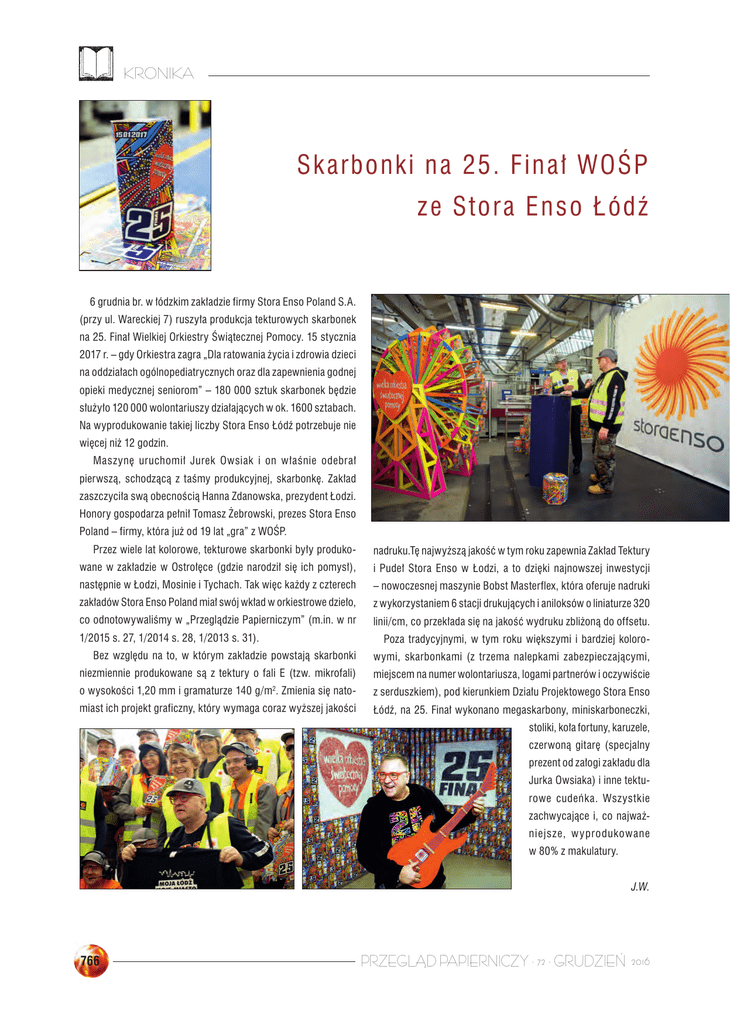 KRONIKA Skarbonki na 25. Finał WOŚP ze Stora Enso Łódź 6 grudnia br. w łódzkim zakładzie firmy Stora Enso Poland S.A. (przy ul. Wareckiej 7) ruszyła produkcja tekturowych skarbonek na 25. Finał Wielkiej Orkiestry Świątecznej Pomocy. 15 stycznia 2017 r. – gdy Orkiestra zagra „Dla ratowania życia i zdrowia dzieci na oddziałach ogólnopediatrycznych oraz dla zapewnienia godnej opieki medycznej seniorom” – 180 000 sztuk skarbonek będzie służyło 120 000 wolontariuszy działających w ok. 1600 sztabach. Na wyprodukowanie takiej liczby Stora Enso Łódź potrzebuje nie więcej niż 12 godzin. Maszynę uruchomił Jurek Owsiak i on właśnie odebrał pierwszą, schodzącą z taśmy produkcyjnej, skarbonkę. Zakład zaszczyciła swą obecnością Hanna Zdanowska, prezydent Łodzi. Honory gospodarza pełnił Tomasz Żebrowski, prezes Stora Enso Poland – firmy, która już od 19 lat „gra” z WOŚP. Przez wiele lat kolorowe, tekturowe skarbonki były produko- nadruku.Tę najwyższą jakość w tym roku zapewnia Zakład Tektury wane w zakładzie w Ostrołęce (gdzie narodził się ich pomysł), i Pudeł Stora Enso w Łodzi, a to dzięki najnowszej inwestycji następnie w Łodzi, Mosinie i Tychach. Tak więc każdy z czterech – nowoczesnej maszynie Bobst Masterflex, która oferuje nadruki zakładów Stora Enso Poland miał swój wkład w orkiestrowe dzieło, z wykorzystaniem 6 stacji drukujących i aniloksów o liniaturze 320 co odnotowywaliśmy w „Przeglądzie Papierniczym” (m.in. w nr linii/cm, co przekłada się na jakość wydruku zbliżoną do offsetu. 1/2015 s. 27, 1/2014 s. 28, 1/2013 s. 31). Poza tradycyjnymi, w tym roku większymi i bardziej koloro- Bez względu na to, w którym zakładzie powstają skarbonki wymi, skarbonkami (z trzema nalepkami zabezpieczającymi, niezmiennie produkowane są z tektury o fali E (tzw. mikrofali) miejscem na numer wolontariusza, logami partnerów i oczywiście o wysokości 1,20 mm i gramaturze 140 g/m2. Zmienia się nato- z serduszkiem), pod kierunkiem Działu Projektowego Stora Enso miast ich projekt graficzny, który wymaga coraz wyższej jakości Łódź, na 25. Finał wykonano megaskarbony, miniskarboneczki, stoliki, koła fortuny, karuzele, czerwoną gitarę (specjalny prezent od załogi zakładu dla Jurka Owsiaka) i inne tekturowe cudeńka. Wszystkie zachwycające i, co najważniejsze, w yprodukowane w 80% z makulatury. J.W. 766 PRZEGLĄD PAPIERNICZY · 72 · GRUDZIEŃ 2016