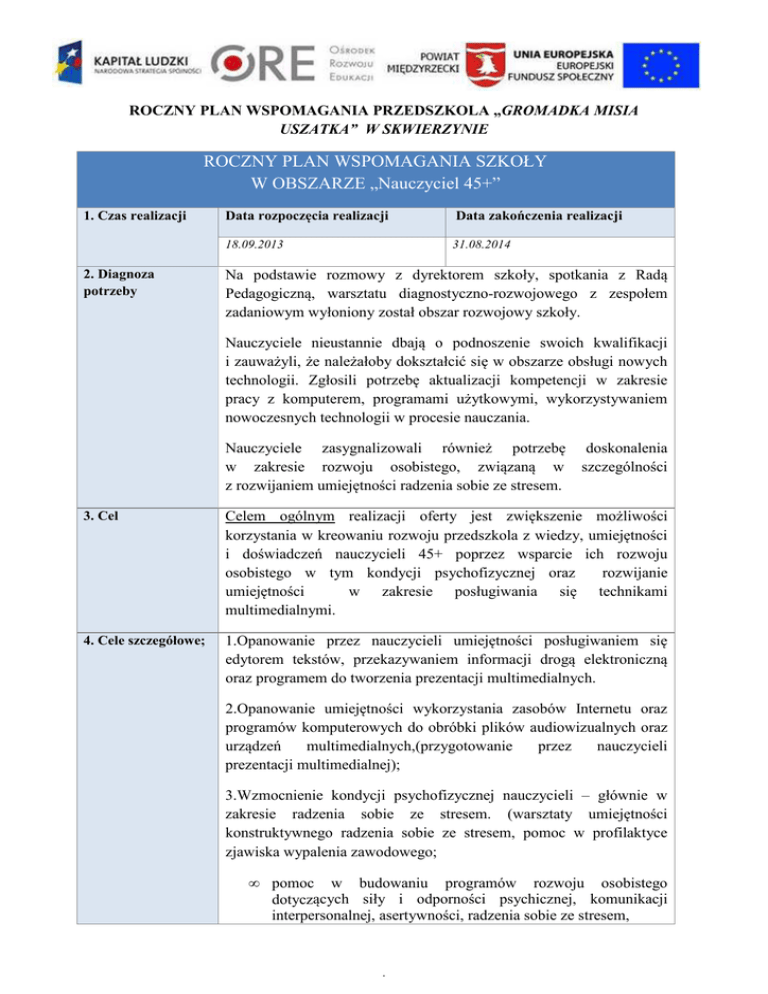 ROCZNY PLAN WSPOMAGANIA PRZEDSZKOLA „GROMADKA MISIA USZATKA” W SKWIERZYNIE ROCZNY PLAN WSPOMAGANIA SZKOŁY W OBSZARZE „Nauczyciel 45+” 1. Czas realizacji 2. Diagnoza potrzeby Data rozpoczęcia realizacji Data zakończenia realizacji 18.09.2013 31.08.2014 Na podstawie rozmowy z dyrektorem szkoły, spotkania z Radą Pedagogiczną, warsztatu diagnostyczno-rozwojowego z zespołem zadaniowym wyłoniony został obszar rozwojowy szkoły. Nauczyciele nieustannie dbają o podnoszenie swoich kwalifikacji i zauważyli, że należałoby dokształcić się w obszarze obsługi nowych technologii. Zgłosili potrzebę aktualizacji kompetencji w zakresie pracy z komputerem, programami użytkowymi, wykorzystywaniem nowoczesnych technologii w procesie nauczania. Nauczyciele zasygnalizowali również potrzebę w zakresie rozwoju osobistego, związaną w z rozwijaniem umiejętności radzenia sobie ze stresem. doskonalenia szczególności 3. Cel Celem ogólnym realizacji oferty jest zwiększenie możliwości korzystania w kreowaniu rozwoju przedszkola z wiedzy, umiejętności i doświadczeń nauczycieli 45+ poprzez wsparcie ich rozwoju osobistego w tym kondycji psychofizycznej oraz rozwijanie w zakresie posługiwania się technikami umiejętności multimedialnymi. 4. Cele szczegółowe; 1.Opanowanie przez nauczycieli umiejętności posługiwaniem się edytorem tekstów, przekazywaniem informacji drogą elektroniczną oraz programem do tworzenia prezentacji multimedialnych. 2.Opanowanie umiejętności wykorzystania zasobów Internetu oraz programów komputerowych do obróbki plików audiowizualnych oraz urządzeń multimedialnych,(przygotowanie przez nauczycieli prezentacji multimedialnej); 3.Wzmocnienie kondycji psychofizycznej nauczycieli – głównie w zakresie radzenia sobie ze stresem. (warsztaty umiejętności konstruktywnego radzenia sobie ze stresem, pomoc w profilaktyce zjawiska wypalenia zawodowego; • pomoc w budowaniu programów rozwoju osobistego dotyczących siły i odporności psychicznej, komunikacji interpersonalnej, asertywności, radzenia sobie ze stresem, . • nabycie/ćwiczenie umiejętności związanych z pracą głosem, • nabycie informacji na temat uprawnień wynikających z problemów zdrowotnych nauczycieli. 5. Zakładane wskaźniki realizacji RPW • 85% nauczycieli zostało przeszkolonych podczas kursu z zakresu technik komputerowych, • przygotowanie przez członków Rady Pedagogicznej prezentacji multimedialnej promującej Przedszkole, (z wykorzystaniem wiedzy i umiejętności nabytych podczas szkolenia), • 80% nauczycieli wzięło udział w zajęciach warsztatowych dotyczących radzenia sobie ze stresem, ( przynajmniej 50% z nich deklaruje wzrost kondycji psychicznej), • wszyscy nauczyciele uczestniczący w spotkaniu z lekarzem zdobyli wiedzę na temat uprawnień wynikających z problemów zdrowotnych nauczycieli, • 75% nauczycieli wie jak wykorzystać naturalne możliwości swojego narządu głosowego oraz poprawić jakość i komfort pracy głosem. 5. Harmonogram realizacji RPW Zadanie Termin realizacji zadania Miejsce realizacji zadania 1.Spotkanie SORE z dyrektorem przedszkola (2 godz.) 18.09.13r. Przedszkole ul. Mickiewicza 26 gabinet dyrektora 2. Spotkanie SORE z Radą Pedagogiczną / utworzenie zespołu zadaniowego (3 godz.) 24.09.13r. Przedszkole godz.15.00 3. Warsztat diagnostyczno-rozwojowy (SORE, zespół zadaniowy) (4 godz.) 27.09.13r. Przedszkole godz.14.00 4. Warsztat diagnostyczno-rozwojowy (SORE, zespół zadaniowy) (2 godz.) 30.09.13r. Przedszkole godz.17.00 5.WARSZTATY; Emisja głosu dla nauczycieli; (3godziny). 18 GRUDZIEŃ 2013R. Przedszkole godz.16.00 . 6.WARSZTATY; Trening autogenny Schulza (3godziny). 8 STYCZEŃ 2014R. Przedszkole godz.16.00 9 STYCZEŃ 2014R. Przedszkole godz.16.00 7.WARSZTATY; Metoda aktywnego słuchania muzyki według Batii Strauss w edukacji elementarnej (9godzin). 3 LUTY 2014R. Przedszkole godz.9.00 4 LUTY 2014R. Przedszkole godz.9.00 8. WARSZTATY; Coaching w pracy nauczyciela;(6godzin). 11 LUTY 2014R. Przedszkole godz.16.00 4 MARZEC 2014R. Przedszkole godz.16.00 9. Spotkanie informacyjne z lekarzem medycyny pracy na temat uprawnień wynikających z problemów zdrowotnych nauczycieli.(2godziny). 18 MARZEC 2014R. Przedszkole godz.16.00 10. Zajęcia komputerowe (4godziny). 2 KWIECIEŃ 2014R. Szkoła, sala komputerowa godz.16.00 11. Przygotowanie przez nauczycieli prezentacji multimedialnej. Do końca maja 2014R. Szkoła, sala komputerowa 12. Konsultacje indywidualne i grupowe z SORE (wg potrzeb) Na bieżąco, według potrzeb Przedszkole 13. Opracowanie sprawozdania z realizacji RPW (SORE) Sierpień 2014 Przedszkole 11. Przedstawienie przez SORE dyrektorowi szkoły sprawozdania z realizacji RPW Sierpień 2014 Przedszkole 12. Rada pedagogiczna z udziałem SORE. Przedstawienie przez SORE sprawozdania z realizacji RPW; dyskusja. Sierpień 2014 Przedszkole Program radzenia sobie ze stresem według Wojciecha Eichelbergera 8xO(3godziny). .