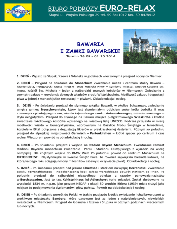 BIURO PODRÓŻY EURO-RELAX Słupsk ul. Wojska Polskiego 29 tel. 59 8411017 fax. 59 8428412 [email protected] BAWARIA I ZAMKI BAWARSKIE Termin 26.09 - 01.10.2014 1. DZIEŃ - Wyjazd ze Słupsk, Tczewa i Gdańska w godzinach wieczornych i przejazd nocny do Niemiec. 2. DZIEŃ – Przyjazd na śniadanie do Monachium Zwiedzanie miasta i centrum stolicy Bawarii – Marienplatz, neogotycki ratusz miejski oraz kościoła NMP – symbolu miasta, wnętrze Kościoła św. Piotra, kościół Św. Michała – jeden z najbardziej znanych kościołów w Niemczech. Zwiedzanie z zewnątrz pałacu – rezydencja dawnych władców z rodu Witteisbachów. Możliwość zakupu i degustacji piwa w jednej z monachijskich restauracji – piwiarni. Obiadokolacja i nocleg. 3. DZIEŃ - Po śniadaniu przejazd do słynnego zakątka Bawarii, w okolice Schwangau, zwiedzanie wnętrz zamku: Neuschwanstein, który jest skamieniałym odbiciem snów króla Ludwika II oraz z zewnątrz sąsiadującego z nim, równie tajemniczego zamku Hohenschwangau, odrestaurowanego w stylu neogotyckim. Przejazd do słynnego na Bawarii miejsca pielgrzymkowego Wieskirche i krótkie zwiedzanie rokokowego kościółka wpisanego na światową listę UNESCO. Podczas przejazdu w miarę możliwości wizyta w benedyktyńskim, wzorowanym na Bazylice Grobu Świętego w Jerozolimie, kościele w Ettal połączona z degustacją likierów w przyklasztornej destylarni. Późnym po południu przejazd do alpejskiej miejscowości Garmisch – Partenkirchen – krótki spacer po centrum i czas wolny. Wieczorem powrót na obiadokolację i nocleg. 4. DZIEŃ – Po śniadaniu przejazd i wejście na Stadion Bayern Monachium. Ewentualnie zamiast stadionu Bayernu monachium zwiedzanie Parku i Stadionu Olimpijskiego z wjazdem na wieżę olimpijską. Dla chętnych wejście do BMW Welt. Po południu powrót do centrum Monachium na OKTOBERFEST. Najsłynniejsze w świecie Święto Piwa. To również największa biesiada ludowa, na którą każdego roku ściągają miliony miłośników zabawy (i oczywiście piwa!). Obiadokolacja i nocleg. 5. DZIEŃ - Po śniadaniu przejazd nad jezioro Chiemsee i statkiem na wyspę Herreninsel. Zwiedzanie zamku Herrenchiemsee – niedokończonej kopii pałacu wersalskiego, powrót statkiem do Prien. Po południu przejazd do najbardziej niezwykłego obiektu z czasów panowania nazistów w Berchtesgaden. Jest to tzw. Kehlsteinhaus lub Adlershorst (orle gniazdo). Został zbudowany na wysokości 1834 m. n.p.m. jako prezent NSDAP z okazji 50 urodzin Hitlera (1939) miała służyć jako miejsce do podejmowania dyplomatów i głów państw. Powrót na obiadokolację i nocleg. 6. DZIEŃ – Po śniadaniu powrót do Polski, w trakcie przejazdu krótkie zwiedzanie i chwila wzruszeń w urokliwym miasteczku Bamberg, które uznawane jest za jedno z najpiękniejszych, niewielkich miasteczek w Niemczech. Przyjazd do Gdańska i Tczewa i Słupska w późnych godzinach wieczornych lub nocnych. ŚWIADCZENIA ZAWARTE W CENIE: 1594 zł. przejazd zachodnim autokarem /barek, wc, klimatyzacja/ 4 noclegi, pokoje 2 i 3 osobowe. wyżywienie - 4 śniadania w formie bufetu i 4 bogate obiadokolacje opieka i informacja turystyczna pilota ubezpieczenie Warta Travel lub Siganl Iduna podatek VAT wybrane wstępy do zwiedzanych atrakcji tj: Zamek Neuschwanstein, Adlershorst, Przepłyniecie statkiem na wyspę Herreninsel, wjazd na wieżę olimpijską w Monachium. Uwaga! Cena nie uwzględnia ewentualnej degustacja likierów w Ettal 8 euro, wstępu do Zamku Herrenchiemsee – 9 euro oraz udziału w folklorystycznym spotkaniu bawarskim w Monachium – OKTOBERFEST – od ok. 35 euro wejście do namiotu z degustacją piwa -2l. i danie regionalne – pieczony kurczak. Ze względu na niesamowicie oblegany termin, jakim jest czas Oktoberfest, rezerwacji wejściówek do namiotów piwnych należy dokonywać z dużym wyprzedzeniem. Ewentualnie można skorzystać z innych otwartych punktów gastronomicznych. Serdecznie zapraszamy Zgodnie z Ustawą o Usługach turystycznych BPiT Euro-Relax posiada zezwolenie na działalność w zakresie organizacji imprez turystycznych - wpis do rejestru nr 024 oraz gwarancję ubezpieczeniową na rzecz klientów www.eurorelax.pl email:[email protected]