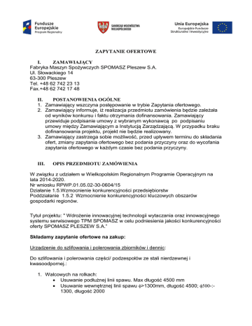 ZAPYTANIE OFERTOWE I. ZAMAWIAJĄCY Fabryka Maszyn Spożywczych SPOMASZ Pleszew S.A. Ul. Słowackiego 14 63-300 Pleszew Tel. +48 62 742 23 13 Fax.+48 62 742 17 48 II. POSTANOWIENIA OGÓLNE 1. Zamawiający wszczyna postępowanie w trybie Zapytania ofertowego. 2. Zamawiający informuje, iż realizacja przedmiotu zamówienia będzie zależała od wyników konkursu i faktu otrzymania dofinansowania. Zamawiający przewiduje podpisanie umowy z wybranym wykonawcą po podpisaniu umowy między Zamawiającym a Instytucją Zarządzającą. W przypadku braku dofinansowania projektu, projekt nie będzie realizowany. 3. Zamawiający zastrzega sobie możliwość, przed upływem terminu do składania ofert, zmiany zapytania ofertowego bez podania przyczyny oraz do wycofania zapytania ofertowego w każdym czasie bez podania przyczyny. III. OPIS PRZEDMIOTU ZAMÓWIENIA W związku z udziałem w Wielkopolskim Regionalnym Programie Operacyjnym na lata 2014-2020. Nr wniosku RPWP.01.05.02-30-0604/15 Działanie 1.5.Wzmocnienie konkurencyjności przedsiębiorstw Poddziałanie 1.5.2 Wzmocnienie konkurencyjności kluczowych obszarów gospodarki regionów. Tytuł projektu: " Wdrożenie innowacyjnej technologii wytaczania oraz innowacyjnego systemu serwisowego TPM SPOMASZ w celu podniesienia jakości konkurencyjności oferty SPOMASZ PLESZEW S.A.” Składamy zapytanie ofertowe na zakup: Urządzenie do szlifowania i polerowania zbiorników i dennic: Do szlifowania i polerowania części/ podzespołów ze stali nierdzewnej i kwasoodpornej.: 1. Walcowych na rolkach: Usuwanie podłużnej linii spawu. Max długość 4500 mm Usuwanie wewnętrznej linii spawu >1300mm, długość 4500;-:1300, długość 2000 Usuwanie zewnętrznej obwodowej linii spawu. Max długość 4500mm Usuwanie wewnętrznej linii spawu >1300mm, długość 4000;-:1300, długość 500, Szlifowanie wewnętrzne>1300mm, długość 4500;-:-1300, długość 2000, Szlifowanie zewnętrzne Max długość 4500mm 2. Na stole poziomym: Usuwanie zewnętrznej linii spawu na dennicy Min =500mm; Max R=2000mm Szlifowanie zewnętrzne na dennicy Min =500mm; Max R=2000mm Usuwanie wewnętrznej linii spawu na dennicy Max R=2000mm; Max H=1350mm, Szlifowanie wewnętrzne na dennicy Max R=2000mm; Max H=1350mm Szlifowanie zewnętrzne na stożku Max R=2000mm Szlifowanie zewnętrzne na walcu Max R= 2000mm. 3. Na kolumnie pionowej: Szlifowanie wewnętrzne na stożku Max =2000mm, Min =500mm, Max długość 2000mm ( z podporą i wydłużonym ramieniem), Szlifowanie zewnętrzne na stożku Max =2000mm, Min =500mm, Max długość 2000mm( z podporą), Szlifowanie wewnętrzne na walcu Max =2000mm, Min =500mm, Max długość 2000mm ( z podporą i wydłużonym ramieniem), Szlifowanie zewnętrzne na walcu Max =2000mm, Min =500mm, Max długość 2000mm( z podporą), Szlifowanie zewnętrzne Min =500mm, Max =2000mm, Szlifowanie wewnętrzne Max H= ( zgodnie z standardem Kloppera) - Głowica z szybką wyminą i automatyczną regulacją pasa ściernego - Oprogramowanie CNC - Elektroniczna kontrola docisku i panel sterujący. - Wyposażenie pneumatyczne do zespołu głowicy ściernej z kontrola ciśnienia. - Poziomy stół obrotowy podtrzymujący dennice do Ø 4000 mm - Zespół rur ssących od głowicy przez całe ramię. -Wydłużenie ramienia z głowicą ścierną 4000 mm do 4500 mm - Pionowa kolumna wsporcza dla dennic i ew. zbiorników - Zestaw głowicy do polerowania z aplikatorem medium polerskiego - Przedłużenie głowicy szlifującej z pasem ściernym do szlifowania wewnętrznego Termin składania ofert: 24 lipca 2016 godzina 16.00 Osoba do kontaktu w sprawie składania ofert: Aleksandra Durska "SPOMASZ" Pleszew S.A. ul. Słowackiego 14 63-300 Pleszew tel.62 742 23 13 wew.111 [email protected]