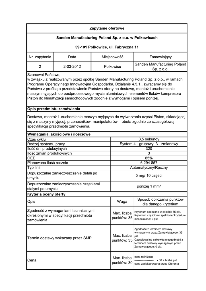 Zapytanie ofertowe Sanden Manufacturing Poland Sp. z o.o. w Polkowicach 59-101 Polkowice, ul. Fabryczna 11 Nr. zapytania Data Miejscowość Zamawiający 2 2-03-2012 Polkowice Sanden Manufacturing Poland Sp. z o.o. Szanowni Państwo, w związku z realizowanym przez spółkę Sanden Manufacturing Poland Sp. z o.o., w ramach Programu Operacyjnego Innowacyjna Gospodarka, Działanie 4.5.1., zwracamy się do Państwa z prośbą o przedstawienie Państwa oferty na dostawę, montaż i uruchomienie maszyn myjących do postprocesowego mycia aluminiowych elementów tłoków kompresora Piston do klimatyzacji samochodowych zgodnie z wymogami i opisem poniżej. Opis przedmiotu zamówienia Dostawa, montaż i uruchomienie maszyn myjących do wytwarzania części Piston, składającej się z maszyny myjącej, przenośników, manipulatorów i robota zgodnie ze szczegółową specyfikacją przedmiotu zamówienia. Wymagania jakościowe i ilościowe Czas cyklu Rodzaj systemu pracy Ilość dni produkcyjnych Ilość zmian produkcyjnych OEE Planowana ilość rocznie Typ linii Dopuszczalne zanieczyszczenie detali po umyciu 3,5 sekundy System 4 - grupowy, 3 - zmianowy 320 3 85% 6 294 857 Automatyczny/Ręczny 5 mg/ 10 częsci Dopuszczalne zanieczyszczenia cząstkami stałymi po umyciu Kryteria oceny oferty poniżej 1 mm² Waga Sposób obliczania punktow dla danego kryterium Max. liczba punktów: 35 Kryterium spełnione w całości: 35 pkt. Kryterium częściowo spełnione/ kryterium niespełnione: 0 pkt. Termin dostawy wskazany przez SMP Max. liczba punktów: 35 Zgodność z terminem dostawy wymaganym przez Zamawiającego: 35 pkt. Częściowa lub całkowita niezgodność z terminem dostawy wymaganym przez Zamawiającego: 0 pkt. Cena Max. liczba punktów: 30 cena najniższa --------------------- x 30 = liczba pkt. cena zadeklarowana przez Oferenta Opis Zgodność z wymaganiami technicznymi określonymi w specyfikacji przedmiotu zamówienia Miejsce realizacji zamówienia Sanden Manufacturing Poland Sp. z o.o. 59-101 Polkowice, ul. Fabryczna 11 Termin oddania przez firmę maszyny do użytku klienta Tydzień 40/2012 Najważniejsze informacje dotyczące sposobu, terminu oraz miejsca skladania ofert Oferta powinna zostać złożona w formie pisemnej i zaadresowana na Sanden Manufacturing Poland Sp. z o.o. z siedzibą w Polkowicach, ul. Fabryczna 11, 59-101 Polkowice lub w formie elektronicznej jako skan podpisanej oferty na adres: [email protected], [email protected] Oferta powinna zostać złożona w terminie do dnia 9-03-2012. Każda oferta powinna wskazywać termin ważności na minimalny okres 60 dni. Inne istotne postanowienia /uwagi Other Zamawiający zastrzega sobie możliwość negocjowania ofert. O terminie ew. negocjacji Oferenci zostaną poinformowani w odpowiednim czasie. Oferty nie spełniające wymogów ilościowych i jakościowych oraz nie dostosowane do wymogów formalnych będą odrzucone. Osoba do kontaktu od strony Zamawiajacego Radoslaw Skrzypek, Zastępca Kierownika Inżynierii Produkcji - Obróbka Mechaniczna Shunsuke Itahashi, Inżynieria Produkcji - Obróbka Mechaniczna. Koordynator E-mail [email protected] [email protected] Telefon Adres +48 76 72 49 213 Sanden Manufacturing Poland Sp. z o.o., 59-101 Polkowice,ul. Fabryczna 11 +48 76 72 49 220 Sanden Manufacturing Poland Sp. z o.o., 59-101 Polkowice,ul. Fabryczna 11 . .