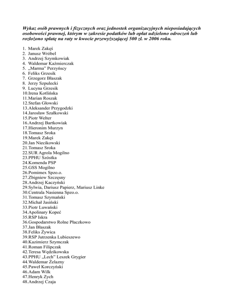 Wykaz osób prawnych i fizycznych oraz jednostek organizacyjnych nieposiadających osobowości prawnej, którym w zakresie podatków lub opłat udzielono odroczeń lub rozłożono spłatę na raty w kwocie przewyższającej 500 zł. w 2006 roku. 1. Marek Zakęś 2. Janusz Wróbel 3. Andrzej Szymkowiak 4. Waldemar Kaźmierczak 5. „Marma” Perzyńscy 6. Feliks Grzesik 7. Grzegorz Błaszak 8. Jerzy Szpulecki 9. Lucyna Grzesik 10.Irena Kotlińska 11.Marian Roszak 12.Stefan Głowski 13.Aleksander Przygodzki 14.Jarosław Szałkowski 15.Piotr Welter 16.Andrzej Bartkowiak 17.Hieronim Murzyn 18.Tomasz Sroka 19.Marek Zakęś 20.Jan Niecikowski 21.Tomasz Sroka 22.SUR Agrola Mogilno 23.PPHU Szóstka 24.Komenda PSP 25.GSS Mogilno 26.Pomimex Spzo.o. 27.Zbigniew Szczęsny 28.Andrzej Kaczyński 29.Sylwia, Dariusz Papierz, Mariusz Linke 30.Centrala Nasienna Spzo.o. 31.Tomasz Szymański 32.Michał Jasiński 33.Piotr Luwański 34.Apolinary Kopeć 35.RSP Iskra 36.Gospodarstwo Rolne Płaczkowo 37.Jan Błaszak 38.Feliks Żywica 39.RSP Jutrzenka Lubieszewo 40.Kazimierz Szymczak 41.Roman Filipczak 42.Teresa Wędzikowska 43.PPHU „Lech” Leszek Grygier 44.Waldemar Żelazny 45.Paweł Korczyński 46.Adam Wilk 47.Henryk Zych 48.Andrzej Czaja 49.Paweł Mikołajczyk 50.Marek Wołowicz 51.Paweł Wilk 52.Marek Choduń 53.Wacław Kula