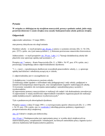 Pytanie W związku ze zbliŜającym się strajkiem nauczycieli, proszę o podanie zadań, jakie stoją przed dyrektorem w czasie strajku oraz zasady funkcjonowania szkoły podczas strajku. Odpowiedź odpowiedzi udzielono: 15 maja 2008 r. stan prawny dotychczas nie uległ zmianie Dyrektor szkoły - w myśl przepisu art. 36 ust. 1 ustawy o systemie oświaty (Dz. U. Nr 256, poz. 2572 z późn. zm.) jest nauczycielem (...), któremu powierzono stanowisko kierownicze. Jednocześnie - w myśl przepisów art. 39 ust. 1 pkt 1 i 3 "kieruje działalnością szkoły lub placówki oraz sprawuje opiekę nad uczniami (...)". Przepisy art. 7 ustawy - Karta Nauczyciela (Dz. U. z 2006 r. Nr 97, poz. 674 z późn. zm.) poszerzają i uzupełniają zakres odpowiedzialności dyrektora: "1. (...) jest (...) przełoŜonym słuŜbowym wszystkich pracowników szkoły, (...), sprawuje opiekę nad dziećmi i młodzieŜą uczącą się w szkole; 2. odpowiedzialny jest w szczególności za: 1) dydaktyczny i wychowawczy poziom szkoły; 2) realizację zadań zgodnie z uchwałami rady pedagogicznej i rady szkoły, podjętymi w ramach ich kompetencji stanowiących, oraz zarządzeniami organów nadzorujących szkołę; 3) tworzenie warunków do rozwijania samorządnej i samodzielnej pracy uczniów i wychowanków; 4) zapewnienie pomocy nauczycielom w realizacji ich zadań i ich doskonaleniu zawodowym; 5) zapewnienie w miarę moŜliwości odpowiednich warunków organizacyjnych do realizacji zadań dydaktycznych i opiekuńczo-wychowawczych." Tyle o podstawowych obowiązkach dyrektora. Przepisy ustawy z dnia 23 maja 1991 r. o rozwiązywaniu sporów zbiorowych (Dz. U. z 1991 r. Nr 55, poz. 236 z późn. zm.) w rozdziale 4 określają prawne podstawy organizacji i przeprowadzenia akcji strajkowej. Art. 18 Udział w strajku jest dobrowolny. Art. 19 ust. 1 Niedopuszczalne jest zaprzestanie pracy w wyniku akcji strajkowych na stanowiskach pracy, urządzeniach i instalacjach, na których zaniechanie pracy zagraŜa Ŝyciu i zdrowiu ludzkiemu lub bezpieczeństwu państwa. Warto sprawdzić, czy: Art. 20 ust. 1 Strajk zakładowy ogłasza organizacja związkowa po uzyskaniu zgody większości głosujących pracowników, jeŜeli w głosowaniu wzięło udział co najmniej 50% pracowników zakładu pracy. Ust. 2 Strajk wielozakładowy ogłasza organ związku wskazany w statucie po uzyskaniu zgody większości głosujących pracowników w poszczególnych zakładach pracy, które mają być objęte strajkiem, jeŜeli w głosowaniu w kaŜdym z tych zakładów wzięło udział co najmniej 50% pracowników. Ust. 3 Ogłoszenie strajku powinno nastąpić co najmniej na 5 dni przed jego rozpoczęciem. Art. 21 ust. 1 Kierownik zakładu pracy nie moŜe być w czasie strajku ograniczony w pełnieniu obowiązków i w wykonywaniu uprawnień w odniesieniu do pracowników nie biorących udziału w strajku oraz w zakresie niezbędnym do zapewnienia ochrony mienia zakładu i nieprzerwanej pracy tych obiektów, urządzeń i instalacji, których unieruchomienie moŜe stanowić zagroŜenie dla Ŝycia lub zdrowia ludzkiego lub przywrócenia normalnej działalności zakładu. Ust. 2 Organizatorzy strajku są obowiązani współdziałać z kierownikiem zakładu pracy w zakresie niezbędnym do zapewnienia ochrony mienia zakładu pracy i nieprzerwanej pracy obiektów, urządzeń i instalacji, o których mowa w ust. 1. Art. 23 ust. 1 Udział pracownika w strajku zorganizowanym zgodnie z przepisami ustawy nie stanowi naruszenia obowiązków pracowniczych. Ust. 2 W okresie strajku zorganizowanego zgodnie z przepisami ustawy pracownik zachowuje prawo do świadczeń z ubezpieczenia społecznego oraz uprawnień ze stosunku pracy, z wyjątkiem prawa do wynagrodzenia. Okres przerwy w wykonywaniu pracy wlicza się do okresu zatrudnienia w zakładzie pracy. W rozdziale 5 określona jest odpowiedzialność za naruszenie przepisów ustawy. Art. 26 ust. 1 Kto w związku z zajmowanym stanowiskiem lub pełnioną funkcją: 1) przeszkadza we wszczęciu lub w prowadzeniu w sposób zgodny z prawem sporu zbiorowego, 2) nie dopełnia obowiązków określonych w tej ustawie - podlega grzywnie albo karze ograniczenia wolności. Ust. 2 Tej samej karze podlega ten, kto kieruje strajkiem lub inną akcją protestacyjną zorganizowaną wbrew przepisom ustawy. Ust. 3 Za szkody wyrządzone strajkiem lub inną akcją protestacyjną zorganizowaną wbrew przepisom ustawy organizator ponosi odpowiedzialność na zasadach określonych w Kodeksie cywilnym. Z informacji przekazanych do wiadomości publicznej dotyczącej organizacji strajku, zawartej w Ramowym regulaminie strajku czytamy: 1. Strajk organizowany w dniu 27 maja 2008 r. jest strajkiem całodniowym i polega na powstrzymaniu się przez pracowników biorących w nim udział od świadczenia pracy w godzinach funkcjonowania w tym dniu danej placówki. 2. Organizatorem strajku są zarządy oddziałów. 3. Zarząd oddziału informuje w ustawowo wskazanym terminie dyrektorów placówek o dacie przeprowadzenia strajku oraz nie później niŜ w dniu poprzedzającym strajk przekazuje im listę osób, które zadeklarowały udział w strajku informując, iŜ osoby te nie będą świadczyły pracy i Ŝe obowiązkiem dyrektora będzie zapewnienie dzieciom i młodzieŜy opieki w tym czasie. 4. Strajkiem w poszczególnych placówkach kierują szkolne komitety strajkowe powstałe po uzyskaniu pozytywnego wyniku referendum z przekształcenia zarządów ognisk. Pracami szkolnego komitetu strajkowego kierują prezesi ognisk. 5. Do zadań szkolnego komitetu strajkowego naleŜy: • • uzgodnienie z dyrektorem placówki sposobu współdziałania celem zapewnienia bezpieczeństwa uczniów, ochrony mienia placówki oraz nieprzerwanej pracy obiektów, urządzeń i instalacji podczas strajku, wywieszenie na terenie placówki informacji o planowanym strajku. 6. Strajkujący na czas strajku gromadzą się w uzgodnionym z dyrektorem placówki pomieszczeniu. 7. W cz