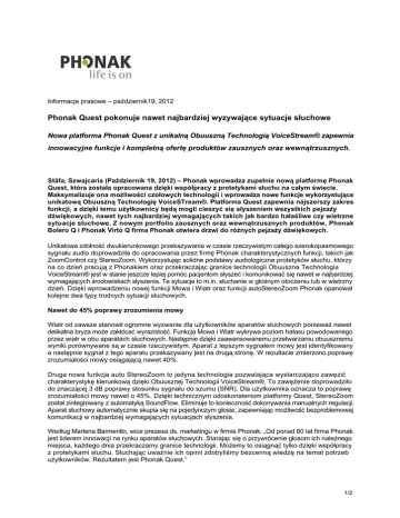 Informacje prasowe – październik19, 2012 Phonak Quest pokonuje nawet najbardziej wyzywające sytuacje słuchowe Nowa platforma Phonak Quest z unikalną Obuuszną Technologią VoiceStream® zapewnia innowacyjne funkcje i kompletną ofertę produktów zausznych oraz wewnątrzusznych. Stäfa, Szwajcaria (Październik 19, 2012) – Phonak wprowadza zupełnie nową platformę Phonak Quest, która została opracowana dzięki współpracy z protetykami słuchu na całym świecie. Maksymalizuje ona możliwości czołowych technologii i wprowadza nowe funkcje wykorzystujące unikatową Obuuszną Technologię VoiceSTream®. Platforma Quest zapewnia najszerszy zakres funkcji, a dzięki temu użytkownicy będą mogli cieszyć się słyszeniem wszystkich pejzaży dźwiękowych, nawet tych najbardziej wymagających takich jak bardzo hałaśliwe czy wietrzne sytuacje słuchowe. Z nowym portfolio zausznych oraz wewnątrzusznych produktów, Phonak Bolero Q i Phonak Virto Q firma Phonak otwiera drzwi do różnych pejzaży dźwiękowych. Unikatowa zdolność dwukierunkowego przekazywania w czasie rzeczywistym całego szerokopasmowego sygnału audio doprowadziła do opracowania przez firmę Phonak charakterystycznych funkcji, takich jak ZoomControl czy StereoZoom. Wykorzystując solidne podstawy audiologiczne protetyków słuchu, którzy na co dzień pracują z Phonakiem oraz przekraczając granice technologii Obuuszna Technologia VoiceStream® jest w stanie jeszcze lepiej pomóc pacjentom słyszeć i komunikować się nawet w najbardziej wymagających środowiskach słyszenia. Te sytuacje to m.in. słuchanie w głośnym otoczeniu lub w wietrzny dzień. Dzięki wprowadzeniu nowej funkcji Mowa i Wiatr oraz funkcji autoStereoZoom Phonak opanował kolejne dwa typy trudnych sytuacji słuchowych. Nawet do 45% poprawy zrozumienia mowy Wiatr od zawsze stanowił ogromne wyzwanie dla użytkowników aparatów słuchowych ponieważ nawet delikatna bryza może zakłócać wyrazistość. Funkcja Mowa i Wiatr wykrywa poziom hałasu powodowanego przez wiatr w obu aparatach słuchowych. Następnie dzięki zaawansowanemu przetwarzaniu obuusznemu wyniki porównywane są w czasie rzeczywistym. Aparat z lepszym sygnałem mowy jest identyfikowany a następnie sygnał z tego aparatu przekazywany jest na drugą stronę. W rezultacie zmierzono poprawę zrozumiałości mowy osiągającą nawet 40%. Druga nowa funkcja auto StereoZoom to jedyna technologia pozwalająca wystarczająco zawęzić charakterystykę kierunkową dzięki Obuusznej Technologii VoiceStream®. To zawężenie doprowadziło do znaczącej 3 dB poprawy stosunku sygnału do szumu (SNR). Dla użytkownika oznacza to poprawę zrozumiałości mowy nawet o 45%. Dzięki technicznym udoskonaleniom platformy Quest, StereoZoom został zintegrowany z automatyką SoundFlow. Eliminuje to konieczność dokonywania manualnych regulacji. Aparat słuchowy automatycznie skupia się na pojedynczym głosie, zapewniając możliwość bezproblemowej komunikacji w najbardziej wymagających sytuacjach słyszenia. Według Martena Barmentlo, wice prezesa ds. marketingu w firmie Phonak: „Od ponad 60 lat firma Phonak jest liderem innowacji na rynku aparatów słuchowych. Starając się o przywrócenie głosom ich należnego miejsca, każdego dnia przekraczamy granice technologii. Możemy to osiągnąć tylko dzięki współpracy z protetykami słuchu. Słuchając uważnie ich opinii zdobyliśmy bezcenną wiedzę na temat potrzeb użytkowników. Rezultatem jest Phonak Quest.” 1/2 Doskonałe brzmienie, urzekający wygląd Firma Phonak przedstawia teraz kompletne, przeprojektowane portfolio zausznych aparatów platformy Quest. Nowa seria aparatów Bolero Q umożliwia dokonanie wyboru jednego z czterech modeli, co pozwala na zaspokojenie różnorakich potrzeb estetycznych i audiologicznych. Wszystkie modele dostępne są na trzech poziomach możliwości. Wszystkie są pokryte nanopowłoką wykonaną z zastosowaniem najnowszej technologii plazmowej w celu zapewnienia nieprzerwanego i przyjemnego używania. Paleta kolorów zawiera osiem nowych wersji kolorystycznych w odcieniach włosów i skóry umożliwiając spełnienie indywidualnych życzeń. Firma Phonak, na nowej platformie, wprowadziła również pełne portfolio produktów wewnątrzusznych. Oferta Virto Q to wyjątkowo elastyczny zestaw produktów z szeroką gamą opcji od najmniejszego aparatu aż po najsilniejszy aparat pełnomałżowinowy. Popularny aparat nano (IIC z ang. Invisible-In-Canal), jest teraz dostępny w dwóch wersjach, co pozwala na dopasowanie do większej liczby typów ubytku słuchu. Wszystkie modele Virto Q są dostępne na trzech poziomach możliwości. Wychwytywanie głosu u źródła W sytuacjach kiedy rozmówca znajduje się w pewnej odległości w głośnym otoczeniu, pomocny może okazać się nowy Phonak RemoteMic. W połączeniu z urządzeniem Phonak ComPilot ułatwia rozmowy w hałaśliwych otoczeniach, przesyłając strumieniowo głosy nawet na odległość 20 metrów wprost do aparatów słuchowych. Dzięki temu bez wysiłku osiągana jest niezwykła zrozumiałość mowy. O firmie Phonak Firma Phonak, członek Sonova Group z główną siedzibą blisko Zurychu w Szwajcarii, od ponad 60 lat specjalizuje się w projektowaniu, produkcji i ogólnoświatowej dystrybucji zaawansowanych technologicznie aparatów słuchowych i urządzeń bezprzewodowych. Dzięki połączeniu fachowości w dziedzinie technologii słuchowej i ścisłej współpracy z protetykami słuchu, Phonak może zapewnić poprawę jakości życia osobom niedosłyszącym oraz ich bliskim. Grupa Phonak może zaproponować pełny wybór cyfrowych aparatów słuchowych oraz uzupełniających je bezprzewodowych systemów. Działający na całym świecie Phonak wprowadza innowacje i ustanawia nowe standardy w branży w zakresie miniaturyzacji i wydajności produktów. :LĊFHMLQIRUPDFMLQDVWURQLHZZZSKRQDNSOZZZSKRQDNSURSOOXEEH]SRĞUHGQLR Kathy Bühl