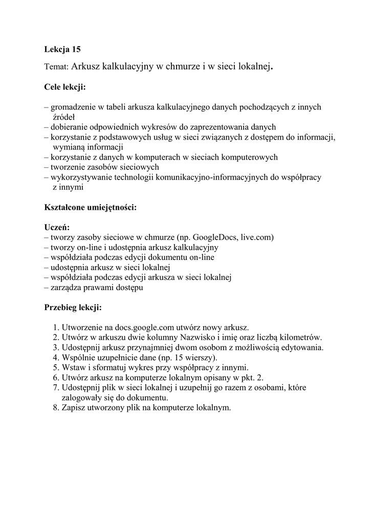 Lekcja 15 Temat: Arkusz kalkulacyjny w chmurze i w sieci lokalnej. Cele lekcji: – gromadzenie w tabeli arkusza kalkulacyjnego danych pochodzących z innych źródeł – dobieranie odpowiednich wykresów do zaprezentowania danych – korzystanie z podstawowych usług w sieci związanych z dostępem do informacji, wymianą informacji – korzystanie z danych w komputerach w sieciach komputerowych – tworzenie zasobów sieciowych – wykorzystywanie technologii komunikacyjno-informacyjnych do współpracy z innymi Kształcone umiejętności: Uczeń: – tworzy zasoby sieciowe w chmurze (np. GoogleDocs, live.com) – tworzy on-line i udostępnia arkusz kalkulacyjny – współdziała podczas edycji dokumentu on-line – udostępnia arkusz w sieci lokalnej – współdziała podczas edycji arkusza w sieci lokalnej – zarządza prawami dostępu Przebieg lekcji: 1. Utworzenie na docs.google.com utwórz nowy arkusz. 2. Utwórz w arkuszu dwie kolumny Nazwisko i imię oraz liczbą kilometrów. 3. Udostępnij arkusz przynajmniej dwom osobom z możliwością edytowania. 4. Wspólnie uzupełnicie dane (np. 15 wierszy). 5. Wstaw i sformatuj wykres przy współpracy z innymi. 6. Utwórz arkusz na komputerze lokalnym opisany w pkt. 2. 7. Udostępnij plik w sieci lokalnej i uzupełnij go razem z osobami, które zalogowały się do dokumentu. 8. Zapisz utworzony plik na komputerze lokalnym.