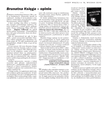 NIGDY WIĘCEJ nr 18, WIOSNA 2010 Brunatna Księga – opinie *** Zabójstwo niemieckiego kierowcy TIR-a, ata- ki na bezdomnych, rasistowskie okrzyki na stadionach – kronikę 21 lat incydentów o charakterze rasistowskim i faszystowskim wydało Stowarzyszenie „NIGDY WIĘCEJ”. 6 lipca zeszłego roku kibice w Grudziądzu wyzwali czarnoskórego żużlowca Antonia Lindbaecka, a potem gonili, próbując pobić. Prezes tamtejszego klubu GTŻ Grudziądz – Zbigniew Fiałkowski nie zgłosił sprawy policji, komentując: „Postawilibyśmy przy nim paru ochroniarzy, skoro tak denerwował ludzi”. Nikt nie interweniował też, gdy 16 lipca 2008 r. przed warszawskim kościołem Wizytek w trakcie pogrzebu prof. Bronisława Geremka grupa ok. 20 osób manifestowała pod transparentem: „Dzięki Ci Boże, że go od nas już zabrałeś”. Licząca prawie 500 stron Brunatna Księga autorstwa Marcina Kornaka wylicza wszystkie ujawnione w latach 1987-2008 akty przemocy na tle religijnym, wobec osób o odmiennym kolorze skóry czy antyfaszystowskich lub lewicowych poglądach. Odnotowuje ataki na cudzoziemców, akty antysemityzmu i publicznego podżegania do nienawiści rasowej. Według opracowania, rzucane z trybun wyzwiska pod adresem cudzoziemskich sportowców i chuligańskie ataki na przebywających w Polsce czarnoskórych, Arabów i Azjatów to główny nurt rasistowskich incydentów ostatnich lat. Z Księgi wynika, że nagłaśnianie takich zdarzeń zwiększa społeczną wrażliwość. W Kaliszu mieszkający tam od 11 lat Egipcjanin Hassan Baghat, ofiara rasistowskiego ataku, rozpoczął głodówkę w proteście przeciwko szyka- nom i dla zwrócenia uwagi na nietolerancję. Prezydent miasta, Janusz Pęcherz, spotkał się z nim i obiecał pomoc. W formie pozbawionej komentarza kroniki kryminalnej księga przypomina dramatyczne zdarzenia z początku lat 90., jak zabicie przez 16-letniego skinheada niemieckiego kierowcy TIR-a w Nowej Hucie (1992 r.) i plagę ataków na bezdomnych, których dokonywali zarówno neofaszyści z Frontu Narodowego Janusza Bryczkowskiego, jak i sataniści. W 1995 i 1996 roku zakończyło się to śmiercią trzech osób, które sprawcy świadomie postanowili „wyeliminować ze społeczeństwa”. Brunatna Księga zajmuje się też rasistowskimi wystąpieniami na forum publicznym – w audycjach telewizyjnych, radiowych, pismach i na stronach internetowych. W sumie znalazło się w niej ok. 2,5 tysiąca wydarzeń o różnym stopniu ciężaru gatunkowego. Opracowanie kończy się na 2008 r., odnotowując, że doszło wtedy do blisko stu aktów przemocy o charakterze rasistowskim i ksenofobicznym. Od poniedziałku można ją kupić w księgarniach lub przeczytać na stronie internetowej Stowarzyszenia „NIGDY WIĘCEJ”. Księga powstała we współpracy z Collegium Civitas i Fundacją Batorego. WOJCIECH CZUCHNOWSKI Księga rasistowskich zdarzeń „Gazeta Wyborcza”, 24 marca 2009 *** W ubiegłym roku napisałem reportaż o czar- noskórym Holendrze, który we Wrocławiu pociął nożem kilku mężczyzn. Tak, przekroczył granice obrony koniecznej, lecz daję głowę, że nigdy nawet by nie pomyślał o noszeniu noża, gdyby każdego niemal dnia nie do- świadczał chamskich, rasistowskich zaczepek, często z biciem. Historia Holendra wprowadziła mnie w świat, którego istnienia woli nie zauważać prawie żaden biały Polak. Dlatego, że jest biały. Nie usłyszy pieszczotliwych uwag: „Popatrz, syneczku, idzie Bambo”, i dosadnych: „Ty czarna małpo, asfalcie”. Wrocław nie jest wyjątkiem. Nasz polski rasizm powszedni daje znać o sobie od morza do Tatr, od Bugu do Odry, grasuje w wielkich miastach, zagląda do prowincjonalnych miasteczek. Ostatnio w Białymstoku trzech byczków wyzwało i uderzyło ciemnoskórą studentkę ze Szwecji. Dlatego, że ma karnację inną niż rodowity białostoczanin. Często słyszę, że rasistowskie wybryki w Polsce to margines. I że osiłków wrzeszczących „white power” można znaleźć na całym świecie. Chętnie wierzę, lecz mam przed sobą Brunatną Księgę wydaną przez Stowarzyszenie „NIGDY WIĘCEJ” i Collegium Civitas. Na 470 stronach gęstego druku kilkanaście lat naszej najnowszej historii – suche, kilkuzdaniowe notki o setkach incydentów i przestępstw na tle rasistowskim i ksenofobicznym: antysemickie napisy i otwarcie kolportowana literatura wzywająca do nienawiści, bicia cudzoziemców, nawet zabójstwa. To tak wygląda margines? Niedawno jeszcze rządziła nami partia odwołująca się do najbardziej ciasnego, mrocznego patriotyzmu. Państwową telewizją włada dziś człowiek o neonazistowskiej przeszłości. Skoro takie poglądy zagościły w centrum polskiego życia publicznego, nie dziwmy się młodzieńcowi, który przed białostoc- NIGDY WIĘCEJ nr 18, WIOSNA 2010 kim sądem mówi z niezmąconą wstydem wiarą, że jest prawdziwym patriotą, bo nienawidzi Żydów, Cyganów, Murzynów. Prof. Lech Chyczewski z białostockiego Uniwersytetu Medycznego uważa, że większość z nas ma rasistowskie bazgroły na murach za mało istotne wyskoki. I że właśnie od takiego lekceważenia się zaczyna. Ma rację. Rasizm, nawet w ulicznym wydaniu, jest czymś nieskończenie niegodziwym. Jeśli ludzie przymykają na to oko, stają się współuczestnikami podłości PAWEŁ SMOLEŃSKI Nasz polski rasizm powszedni, „Gazeta Wyborcza”, 18-19 kwietnia 2009 *** licznych działań mających na celu wyeliminowanie faszyzmu, rasizmu, antysemityzmu i szowinizmu – takie zjawiska ciągle mają miejsce i w Polsce, i na świecie, a nawet, według autora Brunatnej Księgi, jest ich coraz więcej. Można pytać, skąd się biorą, ale też należałoby odpowiedzieć, jak sobie z nimi poradzić. Jedną z najprężniej działających na tym polu organizacji jest założone w 1996 r. przez Marcina Kornaka Stowarzyszenie „NIGDY WIĘCEJ”. Ta pozarządowa organizacja postawiła sobie za cel walkę z wszelkimi p