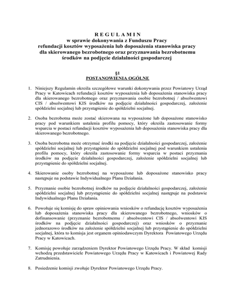 REGULAMIN w sprawie dokonywania z Funduszu Pracy refundacji kosztów wyposażenia lub doposażenia stanowiska pracy dla skierowanego bezrobotnego oraz przyznawania bezrobotnemu środków na podjęcie działalności gospodarczej §1 POSTANOWIENIA OGÓLNE 1. Niniejszy Regulamin określa szczegółowe warunki dokonywania przez Powiatowy Urząd Pracy w Katowicach refundacji kosztów wyposażenia lub doposażenia stanowiska pracy dla skierowanego bezrobotnego oraz przyznawania osobie bezrobotnej / absolwentowi CIS / absolwentowi KIS środków na podjęcie działalności gospodarczej, założenie spółdzielni socjalnej lub przystąpienie do spółdzielni socjalnej. 2. Osoba bezrobotna może zostać skierowana na wyposażone lub doposażone stanowisko pracy pod warunkiem ustalenia profilu pomocy, który określa zastosowanie formy wsparcia w postaci refundacji kosztów wyposażenia lub doposażenia stanowiska pracy dla skierowanego bezrobotnego. 3. Osoba bezrobotna może otrzymać środki na podjęcie działalności gospodarczej, założenie spółdzielni socjalnej lub przystąpienie do spółdzielni socjalnej pod warunkiem ustalenia profilu pomocy, który określa zastosowanie formy wsparcia w postaci przyznania środków na podjęcie działalności gospodarczej, założenie spółdzielni socjalnej lub przystąpienie do spółdzielni socjalnej. 4. Skierowanie osoby bezrobotnej na wyposażone lub doposażone stanowisko pracy następuje na podstawie Indywidualnego Planu Działania. 5. Przyznanie osobie bezrobotnej środków na podjęcie działalności gospodarczej, założenie spółdzielni socjalnej lub przystąpienie do spółdzielni socjalnej następuje na podstawie Indywidualnego Planu Działania. 6. Powołuje się komisję do spraw opiniowania wniosków o refundację kosztów wyposażenia lub doposażenia stanowiska pracy dla skierowanego bezrobotnego, wniosków o dofinansowanie (przyznanie bezrobotnemu / absolwentowi CIS / absolwentowi KIS środków na podjęcie działalności gospodarczej) oraz wniosków o przyznanie jednorazowo środków na założenie spółdzielni socjalnej lub przystąpienie do spółdzielni socjalnej, która to komisja jest organem opiniodawczym Dyrektora Powiatowego Urzędu Pracy w Katowicach. 7. Komisję powołuje zarządzeniem Dyrektor Powiatowego Urzędu Pracy. W skład komisji wchodzą przedstawiciele Powiatowego Urzędu Pracy w Katowicach i Powiatowej Rady Zatrudnienia. 8. Posiedzenie komisji zwołuje Dyrektor Powiatowego Urzędu Pracy. 9. Formę zabezpieczenia zwrotu refundacji, dofinansowania oraz przyznanych środków na założenie spółdzielni socjalnej lub przystąpienie do spółdzielni socjalnej, w przypadku wykorzystania ich niezgodnie z przeznaczeniem lub niespełnienia warunków umowy mogą stanowić: a) weksel z poręczeniem wekslowym (aval) b) poręczenie c) gwarancja bankowa d) blokada środków zgromadzonych na rachunku bankowym e) zastaw na prawach lub rzeczach f) akt notarialny o poddaniu się egzekucji przez dłużnika oraz jedna ze wskazanych powyżej form zabezpieczenia. 10. Refundacja kosztów wyposażenia lub doposażenia stanowiska pracy dla skierowanego bezrobotnego oraz przyznanie osobie bezrobotnej / absolwentowi CIS / absolwentowi KIS środków na podjęcie działalności gospodarczej, założenie spółdzielni socjalnej lub przystąpienie do spółdzielni socjalnej następuje na podstawie posiadanych na ten cel środków. 11. Refundacja kosztów wyposażenia lub doposażenia stanowiska pracy dla skierowanego bezrobotnego może zostać przyznana do wysokości 6-krotnego przeciętnego wynagrodzenia obowiązującego w dniu zawarcia umowy o refundację kosztów. 12. Osoba bezrobotna / absolwent CIS / absolwent KIS może otrzymać środki na podjęcie działalności gospodarczej do wysokości 6-krotnego przeciętnego wynagrodzenia obowiązującego w dniu zawarcia umowy o dofinansowanie. 13. Osoba bezrobotna / absolwent CIS / absolwent KIS może otrzymać środki na założenie spółdzielni socjalnej do wysokości 4-krotnego przeciętnego wynagrodzenia obowiązującego w dniu zawarcia umowy o przyznanie jednorazowo środków na założenie spółdzielni socjalnej. 14. Osoba bezrobotna / absolwent CIS / absolwent KIS może otrzymać środki na przystąpienie do spółdzielni socjalnej do wysokości 3-krotnego przeciętnego wynagrodzenia obowiązującego w dniu zawarcia umowy o przyznanie jednorazowo środków na przystąpienie do spółdzielni socjalnej. §2 ZASADY NABORU WNIOSKÓW O REFUNDACJĘ KOSZTÓW WYPOSAŻENIA LUB DOPOSAŻENIA STANOWISKA PRACY DLA SKIEROWANEGO BEZROBOTNEGO 1. Nabór wniosków o refundację kosztów wyposażenia lub doposażenia stanowiska pracy dla skierowanego bezrobotnego będzie dokonywany w terminach określonych przez Powiatowy Urząd Pracy w Katowicach. Informacja o terminach i zasadach naboru wniosków będzie zamieszczona na stronie internetowej urzędu www.pup.katowice.pl 2. O refundację kosztów wyposażenia lub doposażenia stanowiska pracy dla skierowanego bezrobotnego może ubiegać się podmiot prowadzący działalność gospodarczą, niepubliczne przedszkole lub niepubliczna szkoła oraz producent rolny. 3. O refundację kosztów wyposażenia lub doposażenia stanowiska pracy dla skierowanego bezrobotnego może ubiegać się podmiot prowadzący działalność gospodarczą, który: a) w okresie 6 miesięcy bezpośrednio poprzedzających dzień złożenia wniosku nie zmniejszył wymiaru czasu pracy pracownika i nie rozwiązał stosunku pracy z pracownikiem w drodze wypowiedzenia bądź na mocy porozumienia stron z przyczyn niedotyczących pracowników b) prowadzi działalność gospodarczą w rozumieniu przepisów o swobodzie działalności gospodarczej, przez okres co najmniej 6 miesięcy bezpośrednio poprzedzających dzień złożenia wniosku, z tym że do wskazanego okresu prowadzenia działalności gospodarczej nie wlicza się okresu zawieszenia działalności gospodarczej c) nie zalega w dniu z