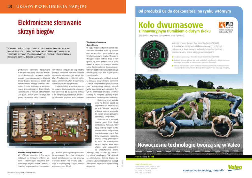 28 | UKŁADY PRZENIESIENIA NAPĘDU Od produkcji OE do doskonałości na rynku wtórnym Elektroniczne sterowanie skrzyń biegów Elektroniczne sterowanie zastosowane w skrzyni manualnej uwalniało kierow cę od konieczności wciskania pedału sprzęgła i ręcznego operowania dźwignią zmiany biegów. Opracowane zostało pod kierownictwem młodego inżyniera Her manna Scholla, który obecnie jest hono rowym przewodniczącym Grupy Bosch, i zastosowane w kilkuset samochodach Glas 1700. Jednak rynek nie był jeszcze gotowy na przyjęcie takiej innowacji. Motronic tworzy nowe szanse W 1979 roku konstruktorzy Boscha za instalowali w firmowym systemie Mo tronic – stanowiącym połączenie elek tronicznego wtrysku paliwa i zapłonu – dowolnie programowalny mikroprocesor. Autonaprawa | Lipiec/sierpień 2015 Ten właśnie komputer ze swą odrębną pamięcią umożliwił tworzenie układów sterowania automatycznych skrzyń bie gów. W połączeniu z systemem zarzą dzania silnikiem służył on do optymalnej, automatycznej zmiany przełożeń. W tej konstrukcji urządzenie sterują ce skrzynią biegów przesyła odpowied nie polecenia do sterownika silnika, a ten interpretuje je i realizuje, zmienia jąc stosownie prędkość wału korbowe go i wartość przekazywanego momen tu obrotowego. Ten rodzaj sterowania został zainstalowany po raz pierwszy w modelu BMW 745i w roku 1983 – wraz z automatyczną skrzynią 4HP22 wykonaną przez ZF AG. z innowacyjnym tłumikiem o dużym skoku Finalista prestiżowej PACE award w 2014 (LTD-DMF – Long Travel Damper Dual Mass Flywheel) Współczesne komputery skrzyń biegów W ciągu dwóch następnych dekad elek troniczne sterowanie stało się standar dem we wszystkich samochodach z au tomatyczną skrzynią biegów. Urządzenie sterujące skrzyni dobiera biegi w taki sposób, by silnik prawie zawsze pozo stawał w swym optymalnym zakresie pracy. Dzięki właściwie dobranym prze łożeniom zapewnia się najlepsze osiągi, komfort jazdy, najniższe zużycie paliwa i emisję spalin. Opracowana w firmie Bosch jednost ka sterująca skrzyni biegów jest minia turowym komputerem high-tech i umoż liwia kompleksową obsługę różnych typów automatycznych przekładni. Przy tym ma ona moc obliczeniową 160 razy większą, niż komputer używany do pro gramowania pierwszego lotu na księżyc. Obecnie co drugi sprzeda wany na świecie pojazd jest wyposażony w automatyczną skrzynię biegów. Wszystko wskazuje na to, że w przyszło ści nastąpi szersze połączenie samochodu z Internetem. Dowodem na to jest opra cowany przez firmę Bosch elektroniczny horyzont, który łączy skrzynię biegów z aktu alizowanymi na bieżąco infor macjami nawigacyjnymi. Sys temy nawigacyjne rozpoznają okolicę i mogą przekazywać te dane do automatycznej skrzyni biegów, która sama włącza biegi odpowiednie do ukształtowania terenu, przebiegu drogi i rodzaju jej otoczenia (np. obszar zabudowany). Tak inteligent na automatyczna skrzynia biegów po zwala na uzyskanie dodatkowej oszczęd ności paliwa na poziomie ponad dziesię ciu procent. n Valeo Long Travel Damper Dual Mass Flywheel (LTD-DMF) jest unikalnym rozwiązaniem koła dwumasowego, będącego najlepszym w klasie zarówno pod względem redukcji wibracji podczas rozruchu silnika, jak i jego normalnej pracy. początkowo stosowany w Mercedes-Benz E-Class 300 BlueTEC HYBRID doskonale redukuje wibracje oraz hałas w układach napędowych o dużym momencie obrotowym, szczególnie w zakresie niskich prędkości obrotowych redukuje przyspieszenia kątowe silnika do dwóch razy skuteczniej niż koła dwumasowe ze standardowym tłumikiem, chroniąc układ napędowy oraz redukując emisję CO2 Nowoczesne technologie tworzą się w Valeo Fot. Bosch W roku 1965, czyli już 50 lar temu, firma Bosch opracowała pierwszy elektroniczny układ sterujący manualną skrzynią biegów. W automatycznej podobnego przełomu dokonał system Bosch Motronic Koło dwumasowe www.valeoservice.com Valeo Service Eastern Europe Sp. z o.o. ul. Wołoska 9A, 02-583 Warszawa TEL.: (+48) 22 543 43 01 FAX: (+48) 22 543 43 05