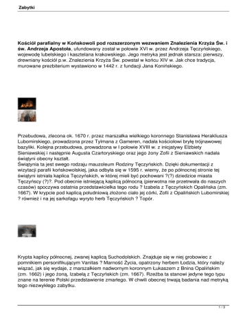 Zabytki Kościół parafialny w Końskowoli pod rozszerzonym wezwaniem Znalezienia Krzyża Św. i św. Andrzeja Apostoła, ufundowany został w połowie XVI w. przez Andrzeja Tęczyńskiego, wojewodę lubelskiego i kasztelana krakowskiego. Jego metryka jest jednak starsza: pierwszy, drewniany kościół p.w. Znalezienia Krzyża Św. powstał w końcu XIV w. Jak chce tradycja, murowane prezbiterium wystawiono w 1442 r. z fundacji Jana Konińskiego. Przebudowa, zlecona ok. 1670 r. przez marszałka wielkiego koronnego Stanisława Herakliusza Lubomirskiego, prowadzona przez Tylmana z Gameren, nadała kościołowi bryłę trójnawowej bazyliki. Kolejna przebudowa, prowadzona w I połowie XVIII w. z inicjatywy Elżbiety Sieniawskiej i następnie Augusta Czartoryskiego oraz jego żony Zofii z Sieniawskich nadała świątyni obecny kształt. Świątynia ta jest swego rodzaju mauzoleum Rodziny Tęczyńskich. Dzięki dokumentacji z wizytacji parafii końskowolskiej, jaka odbyła się w 1595 r. wiemy, że po północnej stronie tej świątyni istniała kaplica Tęczyńskich, w której mieli być pochowani ?(?) dziedzice miasta Tęczyńscy (?)?. Pod obecnie istniejącą kaplicą północną (pierwotna nie przetrwała do naszych czasów) spoczywa ostatnia przedstawicielka tego rodu ? Izabela z Tęczyńskich Opalińska (zm. 1667). W krypcie pod kaplicą południową złożono ciało jej córki, Zofii z Opalińskich Lubomirskiej ? również i na jej sarkofagu wyryto herb Tęczyńskich ? Topór. Krypta kaplicy północnej, zwanej kaplicą Suchodolskich. Znajduje się w niej grobowiec z pomnikiem personifikującym Vanitas ? Marność Życia, opatrzony herbem Łodzia, który należy wiązać, jak się wydaje, z marszałkiem nadwornym koronnym Łukaszem z Bnina Opalińskim (zm. 1662) i jego żoną, Izabelą z Tęczyńskich (zm. 1667). Rzeźba ta stanowi jedyne tego typu znane na terenie Polski przedstawienie zmarłego. W chwili obecnej trwają badania nad metryką tego niezwykłego zabytku. 1/3 Zabytki Nagrobek Zofii z Opalińskich księżnej Lubomirskiej. W toku prac nad przebudową kościoła, zleconych przez Stanisława Herakliusza Lubomirskiego, Marszałka Wielkiego Koronnego a prowadzonych pod nadzorem Tylmana z Gameren, księżna zmarła i nieoczekiwanie najtrwalszą i najpiękniejszą pamiątką po tej przebudowie jest jej nagrobek, autorstwa Tylmana z Gameren, przedstawiający portretowo postać zmarłej. Ciekawostką jest znajdujący się na nagrobku wiersz, napisany przez jej męża. ?Dulcis Imago Mei? ? ?Najsłodszy Mój Obrazie?? pisał o zmarłej żonie Lubomirski. Ciało marszałkowej złożono w sarkofagu z czarnego marmuru, z wyrażonymi herbami Opalińskich, Lubomirskich i Tęczyńskich w krypcie zlokalizowanej pod kaplicą. Tablica z udostojnionym herbem Tęczyńskich: Na czterodzielnej, wypukłej tarczy, nad którą umieszczono wyobrażenie hełmów z koronami: rycerską i hrabiowską, umieszczono wizerunki dwugłowego orła cesarskiego oraz herbu Topór. W herbie sercowym (pośrodku) znajduje się lew trzymający topór. Po 1527 r., kiedy Tęczyńscy zostali hrabiami Świętego Cesarstwa Rzymskiego Narodu Niemieckiego, zwykły Topór zastapiła tarcza herbowa czterpolowa z wyobrażeniami orłów i Toporów ? bez tarczy sercowej. Tę dostał herb po drugim nadaniu dyplomu cesarskiego, dopiero w 1561 roku. W związku z tym powstanie tej tablicy należy wiązać z synem założyciela miasta, Andrzejem Tęczyńskim, wojewodą bełzkim. Krypty: Do chwili obecnej rozpoznano trzy systemy krypt. Pierwszy zlokalizowany jest pod ołtarzem głównym, gdzie pochowany został m.in. Franciszek Zabłocki. Nie jest ustalona metryka oraz zasięg krypt umiejscowionych pod ołtarzem. Część z nich pochodzi zapewne z czasu powstania murowanego kościoła (XV/XVI w.?). Krypta północna: wiadomo było o niej tyle, że znajduje się w niej pomnik symbolizujący Vanitas. W ostatnim czasie ustalono, że w istocie krypta ta jest salą główną (o wymiarach ok. 10 × 5 m) systemu krypt rozciągających się pod północną częścią kościoła. Oprócz pomnika odnaleziono w niej liczne pochówki szlacheckie z XVIII w. Z sali tej wychodzą cztery wyjścia do kolejnych krypt lub korytarzy, z których trzy zostały zamurowane prawdopodobnie już w XVI i XVII w. W jedynym dostępnym korytarzu odnaleziono pochówek opatrzony napisem ?A+D 1647?. 2/3 Zabytki W krypcie doczesne szczątki południowej Zofii znajduje zpołożony Opalińskich się grobowiec Lubomirskiej. zdo marmuru, w którym Kościół pw. Anny Pierwotnie dworska świątyni śmierci ojca chciał w6802 drewniany, czasie wŚw. czasie uhonorować lokacji wyprawy prawdopodobnie miasta. swoją Jana Przypuszcza jest matkę, Olbrachta naprzeciwko wystawiony Annęsię, zczarnego Konińskich, Mołdawii. że dworu przez fundator Tęczyńskich, Andrzeja wychowującą wybierając Tęczyńskiego obecnie wezwanie gozłożono po plebanii. tragicznej jako dlakaplica tej [Rozmiar: bajtów][Rozmiar: 7536 bajtów] Obecnie lubelskim?, istniejący, został konsekrowany wybudowany w w stylu 1613 r. nazywanym ?renesansem Murowana, dekoracyjny szczyty estetyczny wieńczącego zapewne kościoła szeroka wygląd niewielka iwspaniałe -funkcjonalny ożywionego -maszkaron. opaska komina świątynia tynkowa. wznoszącego jak na oraz na narożach zserce wschodni początku kościółek puttami się oddzielający XVII przyszpitalny: nad wieku oraz segmentem okien, otrzymała prezbiterium Bogato które zakrystii, zadziwiająco udekorowano otaczała od fryzu nawy. niegdyś iproboszcza gzymsu bogaty Zadbano sterczynowe malowana o skoro Okienko płaskorzeźbiony korytarza prowadzącego zwłaścicieli empory muzycznej do dwóch izb nad zakrystią zdobi 1618 O kominek lawabo nakrytym wzbogaconym artystyczną roku. oraz o sklepieniem piaskowcowym, oprawę aplikacjami dekorowanym zadbano drzwi płaskorzeźb, niegdyś malarską także polichromowanym stiukowymi we główny imitacją wnętrz