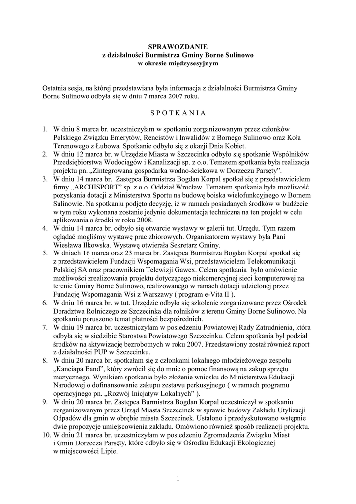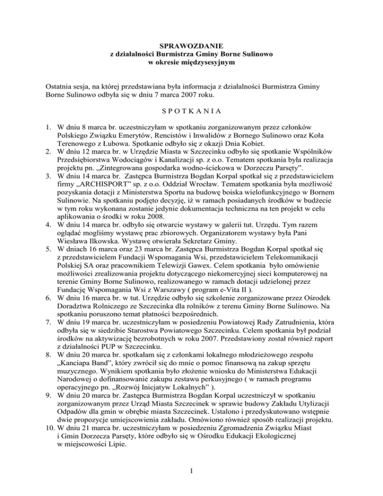 SPRAWOZDANIE z działalności Burmistrza Gminy Borne Sulinowo w okresie międzysesyjnym Ostatnia sesja, na której przedstawiana była informacja z działalności Burmistrza Gminy Borne Sulinowo odbyła się w dniu 7 marca 2007 roku. SPOTKANIA 1. W dniu 8 marca br. uczestniczyłam w spotkaniu zorganizowanym przez członków Polskiego Związku Emerytów, Rencistów i Inwalidów z Bornego Sulinowo oraz Koła Terenowego z Łubowa. Spotkanie odbyło się z okazji Dnia Kobiet. 2. W dniu 12 marca br. w Urzędzie Miasta w Szczecinku odbyło się spotkanie Wspólników Przedsiębiorstwa Wodociągów i Kanalizacji sp. z o.o. Tematem spotkania była realizacja projektu pn. „Zintegrowana gospodarka wodno-ściekowa w Dorzeczu Parsęty”. 3. W dniu 14 marca br. Zastępca Burmistrza Bogdan Korpal spotkał się z przedstawicielem firmy „ARCHISPORT” sp. z o.o. Oddział Wrocław. Tematem spotkania była moŜliwość pozyskania dotacji z Ministerstwa Sportu na budowę boiska wielofunkcyjnego w Bornem Sulinowie. Na spotkaniu podjęto decyzję, iŜ w ramach posiadanych środków w budŜecie w tym roku wykonana zostanie jedynie dokumentacja techniczna na ten projekt w celu aplikowania o środki w roku 2008. 4. W dniu 14 marca br. odbyło się otwarcie wystawy w galerii tut. Urzędu. Tym razem oglądać mogliśmy wystawę prac zbiorowych. Organizatorem wystawy była Pani Wiesława Ilkowska. Wystawę otwierała Sekretarz Gminy. 5. W dniach 16 marca oraz 23 marca br. Zastępca Burmistrza Bogdan Korpal spotkał się z przedstawicielem Fundacji Wspomagania Wsi, przedstawicielem Telekomunikacji Polskiej SA oraz pracownikiem Telewizji Gawex. Celem spotkania było omówienie moŜliwości zrealizowania projektu dotyczącego niekomercyjnej sieci komputerowej na terenie Gminy Borne Sulinowo, realizowanego w ramach dotacji udzielonej przez Fundację Wspomagania Wsi z Warszawy ( program e-Vita II ). 6. W dniu 16 marca br. w tut. Urzędzie odbyło się szkolenie zorganizowane przez Ośrodek Doradztwa Rolniczego ze Szczecinka dla rolników z terenu Gminy Borne Sulinowo. Na spotkaniu poruszono temat płatności bezpośrednich. 7. W dniu 19 marca br. uczestniczyłam w posiedzeniu Powiatowej Rady Zatrudnienia, która odbyła się w siedzibie Starostwa Powiatowego Szczecinku. Celem spotkania był podział środków na aktywizację bezrobotnych w roku 2007. Przedstawiony został równieŜ raport z działalności PUP w Szczecinku. 8. W dniu 20 marca br. spotkałam się z członkami lokalnego młodzieŜowego zespołu „Kanciapa Band”, który zwrócił się do mnie o pomoc finansową na zakup sprzętu muzycznego. Wynikiem spotkania było złoŜenie wniosku do Ministerstwa Edukacji Narodowej o dofinansowanie zakupu zestawu perkusyjnego ( w ramach programu operacyjnego pn. „Rozwój Inicjatyw Lokalnych” ). 9. W dniu 20 marca br. Zastępca Burmistrza Bogdan Korpal uczestniczył w spotkaniu zorganizowanym przez Urząd Miasta Szczecinek w sprawie budowy Zakładu Utylizacji Odpadów dla gmin w obrębie miasta Szczecinek. Ustalono i przedyskutowano wstępnie dwie propozycje umiejscowienia zakładu. Omówiono równieŜ sposób realizacji projektu. 10. W dniu 21 marca br. uczestniczyłam w posiedzeniu Zgromadzenia Związku Miast i Gmin Dorzecza Parsęty, które odbyło się w Ośrodku Edukacji Ekologicznej w miejscowości Lipie. 1 11. W dniu 22 marca br. na sali narad tut. Urzędu odbyło się Walne Zgromadzenie Delegatów Gminnej Spółki Wodnej. Spotkanie miało charakter sprawozdawczy. 12. W dniu 23 marca br. spotkałam się z przedstawicielami Wspólnot Mieszkaniowych z Bornego Sulinowa. Spotkanie dotyczyło moŜliwości zagospodarowania terenów zielonych na terenie miasta poprzez nieodpłatne przekazanie gruntów na rzecz Wspólnot Mieszkaniowych. 13. W dniu 29 marca br. odbyło się posiedzenie Rady Społecznej SP ZOZ. Głównym tematem spotkania było zaopiniowanie planu finansowego na 2007 rok oraz sprawy bieŜące. 14. W dniu 29 marca br. Zastępca Burmistrza Bogdan Korpal uczestniczył w Gminnym MłodzieŜowym Turnieju Wiedzy PoŜarniczej, który odbył się w Wojewódzkim Ośrodku Szkolenia Państwowej StraŜy PoŜarnej w Bornem Sulinowie. 15. W dniu 2 kwietnia br. spotkałam się z Prezesem Przedsiębiorstwa Wodociągów i Kanalizacji sp. z o.o. w Szczecinku Panem Andrzejem Wdowiakiem. Spotkanie dotyczyło zadłuŜenia Gminy w związku z dopłatami do wody i ścieków. Spotkanie odbyło się w siedzibie tut. Urzędu. 16. W dniu 4 kwietnia br. spotkałam się z dyrektorami placówek oświatowych z terenu Gminy Borne Sulinowo. Celem spotkania było omówienie spraw kadrowych, regulaminów wynagradzania pracowników administracji i obsługi oraz ustalenie wytycznych do arkuszy organizacyjnych na rok szkolny 2007 / 08. 17. W dniu 5 kwietnia br. spotkałam się z przedstawicielami firmy „Wtórplast” z Bielska-Białej. Tematem spotkania było wstępne rozwaŜenie propozycji firmy zainteresowanej otworzeniem działalności gospodarczej w miejscowości Kłomino. 18. W dniu 6 kwietnia br. spotkałam się z Dyrektorem Banku Gospodarstwa Krajowego z Piły. Tematem spotkania była dogłębna analiza prognozy spłaty kredytów oraz ewentualnej konsolidacji kredytów i symulacja spłat. 19. W dniu 11 kwietnia br. spotkałam się z Prezesem Stowarzyszenia InŜynierów i Techników Komunikacji Rzeczpospolitej Polskiej Oddziału w Koszalinie Panem Jerzym Olejniczakiem oraz Zastępcą Dyrektora Powiatowego Zarządu Dróg w Szczecinku Panem Markiem Ziomkiem. Na spotkaniu omawiano kwestie współpracy oraz dróg. Tego dnia spotkałam się równieŜ z Dyrektorem Zachodniopomorskiego Ośrodka Doradztwa Rolniczego w Barzkowicach Oddziału w Koszalinie oraz Kierownikiem Zespołu Doradztwa Rolniczego ze Szczecinka. Na spotkaniu poruszono m.in. sprawę dotyczącą przyznania odrębnego pomieszczenia na punkt doradztwa rolniczego w Bornem Sulinowie. 20. W dniu 13 kwietnia br. korzystając z zaproszenia Dyrektora Banku Gospodarstwa Krajo