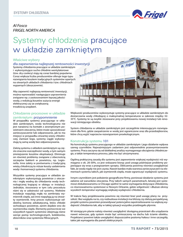 SYSTEMY CHŁODZENIA Al Fosco FRIGEL NORTH AMERICA Systemy chłodzenia pracujące w układzie zamkniętym Właściwe wybory dla zapewnienia najlepszej rentowności inwestycji Systemy chłodzenia pracujące w układzie zamkniętym i wykorzystujące suche chłodnie wentylatorowe (tzw. dry coolery) stają się coraz bardziej popularne. Coraz większa liczba producentów oferuje tego typu rozwiązania kosztem tradycyjnych systemów opartych na otwartych układach chłodzenia i tzw. chłodniach wyparnych (deszczownie). Aby zapewnić najlepszą rentowność inwestycji, można wprowadzić następujące usprawnienia związane np. z zastosowaniem lepszej jakości wody, z redukcją kosztów zużycia energii elektrycznej czy ze zwiększoną trwałością urządzeń. Chłodzenie procesowe w układzie zamkniętym: przypomnienie W przypadku systemu pracującego w układzie zamkniętym, woda technologiczna nie jest narażona na kontakt z zewnętrznym powietrzem otoczenia, które może spowodować zanieczyszczenie lub odparowanie, jak to ma miejsce w przypadku otwartej wieży chłodniczej. Zamiast tego, systemy ciągle wykorzystują tą samą wodę bez odparowywania. Zaletą systemu z układem zamkniętym są często znaczne oszczędności wody, a tym samym zmniejszenie kosztów eksploatacji. Eliminuje on również problemy związane z obecnością szczepów bakterii w powietrzu, np. Legionella. Inne zalety w porównaniu z tradycyjną wieżą chłodniczą to niższe koszty uzdatniania wody i konserwacji systemu chłodzenia. Wszystkie systemy pracujące w układzie zamkniętym wykorzystują powietrze z otoczenia i mgłę wodną do chłodzenia wody technologicznej krążącej w obiegu w instalacji. Jednakże, stosowana w tym celu procedura różni się w zależności od systemu. Niektóre instalacje rozpylają mgłę na zamknięty wymiennik ciepła, zaś inne rozpylają ją na otwarty wymiennik. Inny proces wykorzystuje oddzielną komorę adiabatyczną, która chłodzi wchodzące powietrze, zanim dojdzie ono do wymiennika ciepła. Elementy pomocnicze we wszystkich typach systemów obejmują różne wersje pomp technologicznych, kolektorów, zbiorników oraz systemów filtracyjnych. 10 Większość producentów wykorzystuje systemy pracujące w układzie zamkniętym do dostarczania wody chłodzącej o maksymalnej temperaturze w zakresie między 3235°C. Systemy te są zwykle stosowane przy projektowaniu nowej instalacji lub renowacji istniejącego obiektu. System chłodzenia w układzie zamkniętym jest szczególnie interesującym rozwiązaniem dla firm, gdzie zaopatrzenie w wodę jest ograniczone oraz dla przedsiębiorstw, które chcą wyjść naprzeciw rozwiązaniom proekologicznym. Konstrukcja systemu 101 Na konstrukcję systemu pracującego w układzie zamkniętym i jego działanie wpływa szereg czynników. Najważniejszym zadaniem jest odpowiednie przewymiarowanie systemu. Praca zaczyna się od dokładnej analizy wymaganego obciążenia chłodniczego, a także temperatury procesu, jaka ma być utrzymywana. Ogólną praktyczną zasadą dla systemu jest zapewnienie większej wydajności niż wymagana o ok. 20-30%, co jest wskazane biorąc pod uwagę późniejsze problemy pojawiające się wraz z przegrzaniem sprzętu. Obliczenia powinny również uwzględniać fakt, że woda nigdy nie jest czysta. Nawet bardzo mała warstwa zanieczyszczeń na elementach systemu takich, jak wymiennik ciepła, może ograniczyć wydajność systemu. Innym czynnikiem jest położenie geograficzne firmy, ponieważ działanie systemu jest zależne od warunków otoczenia. Przy takich samych parametrach, łatwiej jest systemowi zlokalizowanemu w Chicago spełnić te same wymagania dotyczące chłodzenia, co równoważnemu systemowi w Nowym Orleanie, gdzie wilgotność i dłuższe okresy wysokich temperatur wymagają większej wydajności chłodzenia. W trakcie fazy projektowania powinno się również brać pod uwagę plany na przyszłość. Bez względu na to, czy rozbudowa instalacji ma bliższą czy dalszą perspektywę, projekt systemu powinien przewidywać potencjalne zapotrzebowanie na większą wydajność chłodzenia tak, aby w takiej sytuacji wszystko przebiegało płynnie. W istniejącym planie należy również uwzględnić dostępną przestrzeń dla urządzenia nawet wówczas, gdy system może być umieszczony na dachu lub ścianie obiektu. Projektanci powinni także uwzględnić dopuszczalne poziomy hałasu i inne szczegóły, takie jak wymagania dla paneli elektrycznych. TS RAPORT • 73/2015 SYSTEMY CHŁODZENIA • • Kwestie dotyczące sprzętu W miarę wzrostu popularności systemów pracujących w układzie zamkniętym rośnie również ilość proponowanych urządzeń. Poniżej podano kluczowe kwestie do uwzględnienia przy wyborze sprzętu: • • Modularność elementów pomocniczych: praktycznie każdy system można rozbudować, jednak modułowe urządzenia pomocnicze upraszczają i przyspieszają ten proces. W szczególności, niektóre systemy wymagają więcej czasu na rozbudowę ze względu na konieczność podłączenia kolektorów, zbiorników i orurowania, podczas gdy niezależny system modułowy ułatwia instalację. Ponadto, system modułowy eliminuje konieczność odprowadzania wody z układu. Wynikiem są mniejsze trudności związane z przestojem instalacji podczas jej modernizacji lub rozbudowy. Chłodzenie w warunkach specjalnych: systemy różnią się pod względem sposobu chłodzenia wody technologicznej w najbardziej gorącym klimacie, gdy wysokie wartości temperatury otoczenia stale utrudniają wodzie osiągnięcie poziomu 32-35 °C, lub w sytuacjach, gdy dane zastosowanie wymaga temperatury wody na poziomie 29,4 °C. Niektóre systemy rozpylają dodatkową wodę bezpośrednio na wymiennik ciepła, co może prowadzić do powstawania korozji na wymienniku i konieczności przedwczesnego serwisowania. I na odwrót, system, który czasowo zalewa powierzchnie wymiennika ciepła i również