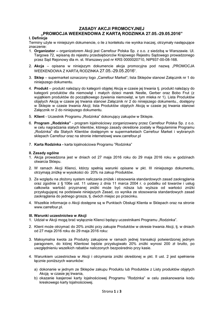ZASADY AKCJI PROMOCYJNEJ „PROMOCJA WEEKENDOWA Z KARTĄ RODZINKA 27.05.-29.05.2016” I. Definicje Terminy użyte w niniejszym dokumencie, o ile z kontekstu nie wynika inaczej, otrzymały następujące znaczenie: 1. Organizator – organizatorem Akcji jest Carrefour Polska Sp. z o.o. z siedzibą w Warszawie. Ul. Targowa 72, wpisaną do rejestru przedsiębiorców Krajowego Rejestru Sądowego prowadzonego przez Sąd Rejonowy dla m. st. Warszawy pod nr KRS 0000020710, NIP937-00-08-168. 2. Akcja – opisana w niniejszym dokumencie akcja promocyjna pod nazwą „PROMOCJA WEEKENDOWA Z KARTĄ RODZINKA 27.05.-29.05.2016”. 3. Sklep – supermarket oznaczony logo „Carrefour Market”; lista Sklepów stanowi Załącznik nr 1 do niniejszego dokumentu. 4. Produkt – produkt należący do kategorii objętej Akcją w czasie jej trwania tj. produkt należący do kategorii produktów dla niemowląt i małych dzieci marek Nestle, Gerber oraz Bobo Frut (z wyjątkiem produktów do początkowego żywienia niemowląt, w tym mleka nr 1). Lista Produktów objętych Akcją w czasie jej trwania stanowi Załącznik nr 2 do niniejszego dokumentu., dostępny w Sklepie w czasie trwania Akcji; lista Produktów objętych Akcją w czasie jej trwania stanowi Załącznik nr 2 do niniejszego dokumentu. 5. Klient - Uczestnik Programu „Rodzinka” dokonujący zakupów w Sklepie. 6. Program „Rodzinka” - program lojalnościowy zorganizowany przez Carrefour Polska Sp. z o.o. w celu nagradzania stałych klientów, którego zasady określone zostały w Regulaminie Programu „Rodzinka” dla Stałych Klientów dostępnym w supermarketach Carrefour Market i wybranych sklepach Carrefour oraz na stronie internetowej www.carrefour.pl 7. Karta Rodzinka - karta lojalnościowa Programu ”Rodzinka” II. Zasady ogólne 1. Akcja prowadzona jest w dniach od 27 maja 2016 roku do 29 maja 2016 roku w godzinach otwarcia Sklepu. 2. W ramach Akcji Klienci, którzy spełnią warunki opisane w pkt. III niniejszego dokumentu, otrzymają zniżkę w wysokości do 20% na zakup Produktów. 3. Ze względu na złożony system naliczania zniżek i stosowania standardowych zasad zaokrąglania oraz zgodnie z § 106e ust. 11 ustawy z dnia 11 marca 2004 r. o podatku od towarów i usług całkowita wartość przyznanej zniżki może być niższa lub wyższa od wartości zniżki przysługującej na podstawie niniejszych Zasad, co wynika ze stosowania standardowych zasad zaokrąglania do jednego grosza, tj. dwóch miejsc po przecinku. 4. Wszelkie informacje o Akcji dostępne są w Punktach Obsługi Klienta w Sklepach oraz na stronie www.carrefour.pl. III. Warunki uczestnictwa w Akcji 1. Udział w Akcji mogą brać wyłącznie Klienci będący uczestnikami Programu „Rodzinka”. 2. Klient może otrzymać do 20% zniżki przy zakupie Produktów w okresie trwania Akcji, tj. w dniach od 27 maja 2016 roku do 29 maja 2016 roku: 3. Maksymalna kwota za Produkty zakupione w ramach jednej transakcji potwierdzonej jednym paragonem, do której Klientowi będzie przysługiwało 20% zniżki wynosi 200 zł brutto, po uwzględnieniu wszelkich rabatów naliczonych bezpośrednio przy kasie. 4. Warunkiem uczestnictwa w Akcji i otrzymania zniżki określonej w pkt. II ust. 2 jest spełnienie łącznie poniższych warunków: a) dokonanie w jednym ze Sklepów zakupu Produktu lub Produktów z Listy produktów objętych Akcją w czasie jej trwania, b) okazanie kasjerowi karty lojalnościowej Programu ”Rodzinka” w celu zeskanowania kodu kreskowego karty lojalnościowej. Strona 1 z 3 5. Rabat nie sumuje się z innymi kuponami rabatowymi, zniżkami, rabatami, promocjami, z wyjątkiem zniżek przysługujących Klientom posiadającym Kartę Pracownika lub Kartę Seniora. 6. W przypadku łączenia zniżki przysługującej w ramach Akcji ze zniżką przysługującą na podstawie karty lojalnościowej Programu ”Rodzinka” - Karty Pracownika, zniżki naliczane są w następującej kolejności: a) Zniżka udzielana w ramach Akcji opisanej w niniejszym dokumencie, b) zniżka przysługująca z tytułu posiadania Karty Pracownika. 7. W przypadku łączenia zniżki przysługującej w ramach Akcji ze zniżką przysługującą na podstawie karty lojalnościowej Programu ”Rodzinka” - Karty Seniora, zniżki naliczane są w następującej kolejności: a) Zniżka udzielana w ramach Akcji opisanej w niniejszym dokumencie, b) Zniżka przysługująca z tytułu posiadania Karty Seniora – w formie e-Kuponu Senior. c) Zniżka przysługująca z tytułu realizacji e-Kuponu Senior. IV. Postępowanie reklamacyjne 1. Każdemu Klientowi przysługuje prawo wniesienia pisemnej reklamacji, w zakresie niezgodności sposobu przeprowadzenia Akcji z zasadami opisanymi w niniejszym dokumencie oraz regulaminie Programu „Rodzinka” w czasie trwania Akcji lub nie później niż w terminie do 30 dni od daty jej zakończenia. Reklamacje wniesione po upływie powyższego terminu nie będą rozpatrywane. Za datę wniesienia reklamacji uważa się datę stempla pocztowego na przesyłce zawierającej reklamację. 2. Zgłoszenie reklamacyjne musi zawierać dokładne dane personalne zgłaszającego reklamację (imię, nazwisko, numer karty lojalnościowej „Rodzinka”, dokładny adres wraz z kodem pocztowym reklamującego), przyczynę reklamacji, treść żądania reklamującego oraz opis okoliczności uzasadniających reklamację. Reklamacje należy kierować na piśmie na adres: Carrefour Polska Sp. z o.o. Dział Marketingu Ul. Targowa 72 03-734 Warszawa Z dopiskiem: „NESTLE PROMOCJA WEEKENDOWA Z KARTĄ RODZINKA 27.05.-29.05.2016” 3. Termin rozpatrzenia reklamacji przez Organizatora wraz z wysłaniem odpowiedzi wynosi nie więcej niż 21 dni licząc od dnia otrzymania reklamacji przez Organizatora. 4. Jeżeli z uwagi na złożoność sprawy będącej powodem reklamacji, zajdzie konieczność przeprowadzenia postępowania wyjaśniającego i termin, o którym mowa powyżej, może zostać niedotrzyman
