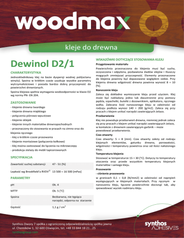 kleje do drewna Dewinol D2/1 CHARAKTERYSTYKA Jednoskładnikowy klej na bazie dyspersji wodnej poli(octanu winylu). Spoina w krótkim czasie uzyskuje wysokie parametry wytrzymałościowe i posiada bardzo dobrą przyczepność do powierzchni drewnianych. Spoina klejowa spełnia wymagania wodoodporności w klasie D2 wg normy PN- EN 204. WSKAZÓWKI DOTYCZĄCE STOSOWANIA KLEJU Przygotowanie materiału Powierzchnia przeznaczona do klejenia musi być sucha, oczyszczona i odpylona, pozbawiona śladów olejów i tłuszczy mogących zmniejszać przyczepność. Elementy przeznaczone do klejenia powinny być dopasowane względem siebie. Przy klejeniu drewna wilgotność drewna powinna wynosić 8 ÷ 10 [%]. Nanoszenie kleju - klejenie drewna miękkiego Zaleca się dokładne wymieszanie kleju przed użyciem. Klej może być nakładany jedno lub dwustronnie przy pomocy pędzla, szpachelki, butelki z dozownikiem, aplikatora, ręcznego wałka. Zalecana ilość nanoszonego kleju w zależności od rodzaju podłoża wynosi 140 ÷ 200 [g/m2]. Zaleca się przy pracach z klejem unikać narzędzi zawierających żelazo. - połączenia piórowo-wpustowe Przebarwienia - klejenie sklejek Klej nie powoduje przebarwień drewna, niemniej jednak zaleca się przy pracach z klejem unikać narzędzi zawierających żelazo, w kontakcie z drewnem zawierającym garbnik – może powodować przebarwienia. ZASTOSOWANIE - klejenie drewna twardego - klejenie innych materiałów drewnopochodnych - przeznaczony do stosowania w prasach na zimno oraz do klejenia ręcznego - klej o krótkim czasie prasowania - klejenie montażowe (połączenia kołkowe) - klej można zastosować do łączenia na mikrowczepy - produkcja stelaży do mebli tapicerowanych Czas otwarty Czas otwarty: 5 ÷ 8 [min]. Czas otwarty zależy od rodzaju klejonych elementów, gatunku drewna, porowatości, wilgotności i temperatury powietrza oraz od ilości nałożonego kleju. Temperatura klejenia SPECYFIKACJA Zawartość suchej substancji 47 - 51 [%] Lepkość wg Brookfield’a RVDV1) 13 500 ÷ 16 500 [mPas] PARAMETRY pH Ok. 4 MTTF Ok. 5 [°C] Spoina Bezbarwna, nie tępiąca narzędzi, odporna na starzenie Gęstość 1,1 g / cm3 Stosować w temperaturze 15 ÷ 30 [°C]. Dotyczy to temperatury otoczenia oraz przede wszystkim temperatury klejonych materiałów i samego kleju. Prasowanie - ciśnienie prasowania w granicach 0,1 ÷ 0,8 [N/mm2] w zależności od naprężeń występujących w klejonych materiałach. Przy ręcznym w nanoszeniu kleju, łączone powierzchnie docisnąć tak, aby spowodować wyciek nadmiaru kleju. Synthos Dwory 7 spółka z ograniczoną odpowiedzialnością spółka jawna ul. Chemików 1, 32-600 Oświęcim, tel. +48 33 844 18 21...25 synthosgroup.com kleje do drewna - czas prasowania zależy od rodzaju klejonych elementów, porowatości, chłonności, gatunku drewna i jego wilgotności, temperatury, wilgotności powietrza oraz od ilości nałożonego kleju oraz od naprężeń występujących w klejonych materiałach. Elementy klejone prasować do momentu osiągnięcia wytrzymałości umożliwiającej dalszą obróbkę lub transport. - proponowane średnie czasy prasowania prasy na zimno 15 ÷ 30 [min] Dobre wyniki klejenia można osiągnąć przestrzegając następujących warunków: Temperatura procesu klejenia 15 ÷ 25 [°C] Wilgotność względna powietrza 60 ÷ 70 [%] Wilgotność drewna 8 ÷ 10 [%] Ilość nałożonego kleju 140 ÷ 200 [g/m2] Maksymalny czas otwarty 5 ÷ 8 [min] Uwaga – Podane informacje są wynikiem badań przeprowadzonych w Laboratorium Aplikacyjnym SYNTHOS S.A. zgodnie z obowiązującymi normami i stanem wiedzy. Producent nie mógł przewidzieć jednak wszystkich możliwości zastosowania kleju. Zaleca się przeprowadzenie prób aplikacji i klejenia elementów przez użytkownika oraz sprawdzenie parametrów końcowych wyrobu, ponieważ sposób użycia kleju jest całkowicie poza kontrolą producenta. Użytkownik bierze na siebie odpowiedzialność za właściwy wybór i zastosowanie produktu. Producent nie bierze na siebie odpowiedzialności za występujące uszkodzenia lub zły stan podłoża, które mogą być wynikiem czynników atmosferycznych, przygotowania wstępnego lub wad konstrukcyjnych. Podczas dłuższego przechowywania na powierzchni kleju może się wydzielić woda, jest to zjawisko naturalne i zanika po wymieszaniu kleju. Szczegółowe informacje: Dział Obsługi Klienta tel. +48 33 847 25 33, fax +48 33 847 27 91, e-mail: [email protected] Centrum Technologiczne - Doradcy Techniczni tel. +48 33 847 3619, +48 33 847 3589, e-mail: [email protected] CZYSZCZENIE Narzędzia należy myć w wodzie zaraz po zakończonej pracy. Nie dopuścić do zaschnięcia kleju. Zaschnięty klej z narzędzi usuwać mechanicznie po uprzednim moczeniu w gorącej wodzie (ok. 1 godz.). www.synthosgroup.com OPAKOWANIE I TRANSPORT Do każdej partii/dostawy wystawia się świadectwo jakości, zawierające dane o właściwościach stwierdzonych w wyniku kontroli wyjściowej. Wydanie: 1 Data wydania: 11/05/2015 Zatwierdził: Menadżer produktu (+48338472437) Produkt jest oferowany w pojemnikach z tworzywa sztucznego o masie 20 kg, 70 kg i 1000 kg. Opakowanie i transport nie podlegają przepisom dotyczącym towarów niebezpiecznych (ADR, RID). Możliwe jest stosowanie innego opakowania po uprzednim uzgodnieniu między producentem a klientem. Opakowanie nie może mieć negatywnego wpływu na jakość produktu. PRZECHOWYWANIE Przechowywać w oryginalnych, szczelnie zamkniętych opakowaniach w temperaturze od +5 do +30 [°C]. Produkt przechowywany w tych warunkach zachowuje swoje własności w ciągu 6 miesięcy od daty produkcji. Synthos Dwory 7 spółka z ograniczoną odpowiedzialnością spółka jawna ul. Chemików 1, 32-600 Oświęcim, tel. +48 33 844 18 21...25 synthosgroup.com